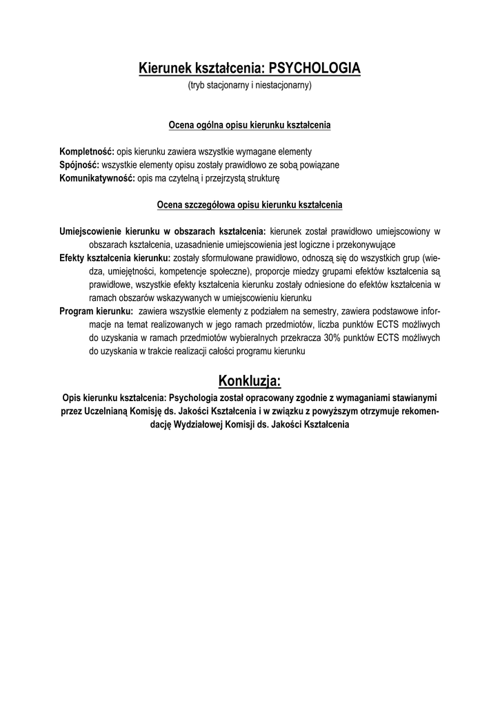 Kierunek kształcenia: PSYCHOLOGIA Konkluzja: