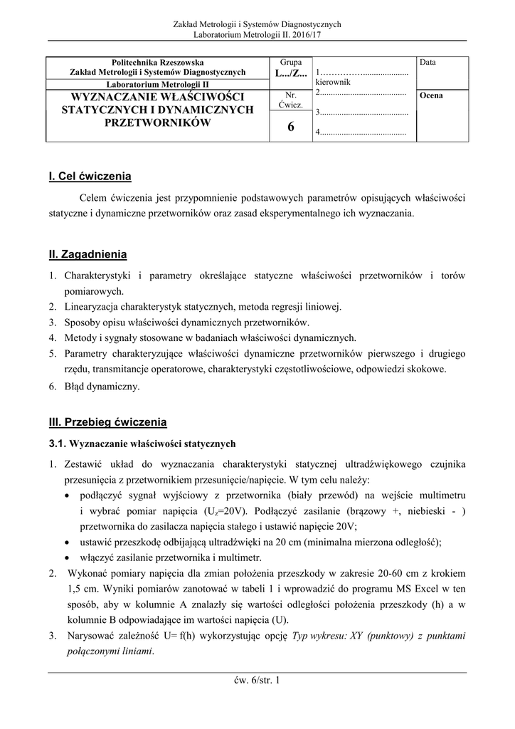 Zakład Metrologii i Systemów Diagnostycznych Laboratorium Metrologii II. 2016/17 Politechnika Rzeszowska Zakład Metrologii i Systemów Diagnostycznych Laboratorium Metrologii II WYZNACZANIE WŁAŚCIWOŚCI STATYCZNYCH I DYNAMICZNYCH PRZETWORNIKÓW Grupa L.../Z... Nr. Ćwicz. 6 1……………..................... kierownik 2........................................ 3......................................... Data Ocena 4........................................ I. Cel ćwiczenia Celem ćwiczenia jest przypomnienie podstawowych parametrów opisujących właściwości statyczne i dynamiczne przetworników oraz zasad eksperymentalnego ich wyznaczania. II. Zagadnienia 1. Charakterystyki i parametry określające statyczne właściwości przetworników i torów pomiarowych. 2. Linearyzacja charakterystyk statycznych, metoda regresji liniowej. 3. Sposoby opisu właściwości dynamicznych przetworników. 4. Metody i sygnały stosowane w badaniach właściwości dynamicznych. 5. Parametry charakteryzujące właściwości dynamiczne przetworników pierwszego i drugiego rzędu, transmitancje operatorowe, charakterystyki częstotliwościowe, odpowiedzi skokowe. 6. Błąd dynamiczny. III. Przebieg ćwiczenia 3.1. Wyznaczanie właściwości statycznych 1. Zestawić układ do wyznaczania charakterystyki statycznej ultradźwiękowego czujnika przesunięcia z przetwornikiem przesunięcie/napięcie. W tym celu należy: podłączyć sygnał wyjściowy z przetwornika (biały przewód) na wejście multimetru i wybrać pomiar napięcia (Uz=20V). Podłączyć zasilanie (brązowy +, niebieski - ) przetwornika do zasilacza napięcia stałego i ustawić napięcie 20V; ustawić przeszkodę odbijającą ultradźwięki na 20 cm (minimalna mierzona odległość); włączyć zasilanie przetwornika i multimetr. 2. Wykonać pomiary napięcia dla zmian położenia przeszkody w zakresie 20-60 cm z krokiem 1,5 cm. Wyniki pomiarów zanotować w tabeli 1 i wprowadzić do programu MS Excel w ten sposób, aby w kolumnie A znalazły się wartości odległości położenia przeszkody (h) a w kolumnie B odpowiadające im wartości napięcia (U). 3. Narysować zależność U= f(h) wykorzystując opcję Typ wykresu: XY (punktowy) z punktami połączonymi liniami. ćw. 6/str. 1 Zakład Metrologii i Systemów Diagnostycznych Laboratorium Metrologii II. 2016/17 4. 5. 6. 7. Przeprowadzić linearyzację charakterystyki U= f(h) metodą regresji liniowej. W tym celu po kliknięciu na uzyskanym przebiegu prawym klawiszem myszy należy wybrać opcję Dodaj linię trendu… Typ: liniowy, Opcje: Wyświetl równanie na wykresie. Uzyskane równanie prostej ULin = f (h) w postaci y=ax + b zanotować w sprawozdaniu. Wykorzystując otrzymaną zależność w kolumnie C arkusza obliczyć wartości funkcji ULin = f (h) dla h = 20, 21,5, 23…60. W kolumnie D arkusza obliczyć wartości błędów nieliniowości ΔNL(h) = ULin (h) - U(h) a w kolumnie E błędy względne odniesione do wyjścia δNL (h) = |ΔNL(h)| /(Umax – Umin) dla h = 20, 21,5, 23…60. Znaleźć i zanotować w sprawozdaniu wartości maksymalne błędów ΔNlmax i δNLmax. Na podstawie charakterystyki ULin = f (h) określić czułość S = ΔULin/Δh i stałą C = 1/S układu. Wyniki zanotować w sprawozdaniu. 3.2. Wyznaczanie właściwości dynamicznych 8. Otworzyć wskazaną przez prowadzącego aplikację mod_dyn*.DSB w środowisku DASYLab. W oknie właściwości modułu Generator00 (okno właściwości otwiera się po dwukrotnym kliknięciu na ikonie modułu) ustawić następujące parametry: Frequency: 3 Hz; Amplitude: 0,5; Offset: 0,5; Wave Form: Square. 9. Uruchomić program i na podstawie uzyskanych przebiegów odpowiedzi skokowych dokonać identyfikacji typów przetworników, których modele zawierają obiekty BlackBox00-02. W celu ułatwienia obserwacji należy zatrzymać program i wykorzystując przyciski (Zoom i Unzoom) przeskalować osie czasu tak, aby w oknach wykresów uzyskać pojedynczy przebieg wymuszenia x(t) (wykres czerwony) i odpowiedzi y(t) (wykres niebieski). 10. Dla kolejnych modeli przetworników powiększyć okno wizualizacji przebiegów i wyznaczyć następujące parametry i zapisać w tabeli 2: czas opóźnienia To, czas połówkowy T0,5= T(Umax·0,5), stałą czasową T=T(Umax·0,67), czas ustalania Tu=T(Umax·0,95 lub Umax·0,99) oraz określić wzmocnienie k. Pomiary wykonać operując kursorami, które uaktywnia się przyciskiem . Wyniki zanotować w sprawozdaniu. 11. Dla czasów t = T(Umax·0,5), T(Umax·0,67), T(Umax·0,95 lub Umax·0,99) określić wartości bezwzględnych i względnych błędów dynamicznych gdy wzmocnienie k=1V/V, ΔDYN(t) =Umax–u(t); δDYN(t) =|ΔDYN(t)|/Umax. Potrzebne wielkości odczytać z odpowiednich charakterystyk przy pomocy kursorów. Wyniki zestawić w tabeli 3. Jakie maksymalne wartości mogą przyjąć błędy dynamiczne ΔDYN(t), δDYN(t) i dla jakiego czasu t to nastąpi? W sprawozdaniu na rys.1. narysować przebieg odpowiedzi skokowej przetwornika I rzędu i zaznaczyć na nim parametry: T=T(Umax·0,67), Tu=T(Umax·0,95 lub Umax·0,99), ΔDYN(T), ΔDYN(Tu), ΔDYNmax. ćw. 6/str. 2 Zakład Metrologii i Systemów Diagnostycznych Laboratorium Metrologii II. 2016/17 Dane techniczne czujnika pomiarowego UM30-13113 Wyprowadzenie zacisków czujnika Przewody: 1 (brown) – zasilanie 2 (white) – wyjście czujnika 3 (blue) - masa 4 (black) – nie podłączony 5 (gray) – nie podłączony Rys.1 Wymiary czujnika Rys.2. Obsługa czujnika ćw. 6/str. 3 Zakład Metrologii i Systemów Diagnostycznych Laboratorium Metrologii II. 2016/17 Parametry: Parametr Wartości parametrów Obsługa skanowania zasięgu Strefa działania 200 ... 1300 mm (2000) temperatura pracy (-20 do +30) ºC 200 kHz Częstotliwość pracy Rozdzielczość 0,36 mm Dokładność 2 % ostatniej wartości Prąd zużycia2). ≤70 mA Powtarzalność ± 0.15 % ostatniej wartości Napięcie zasilania Vs 12 … 30 V DC1). Analogowe wyjście, odwracające3). 4). QA