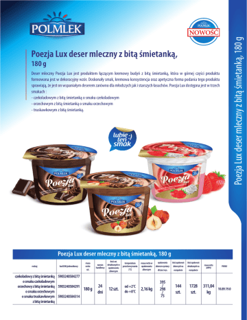 Poezja Lux deser mleczny z bitą śmietanką, 180 g Poezja Lux deser mleczny z bitą śmietanką, 180 g Deser mleczny Poezja Lux jest produktem łączącym kremowy budyń z bitą śmietanką, która w górnej części produktu formowana jest w dekoracyjny wzór. Doskonały smak, kremowa konsystencja oraz apetyczna forma podania tego produktu sprawiają, że jest on wspaniałym deserem zarówno dla młodszych jak i starszych łasuchów. Poezja Lux dostępna jest w trzech smakach : - czekoladowym z bitą śmietanką o smaku czekoladowym - orzechowym z bitą śmietanką o smaku orzechowym - truskawkowym z bitą śmietanką. :) Poezja Lux deser mleczny z bitą śmietanką, 180 g rodzaj kod EAN jednostkowy masa netto szt. czekoladowy z bitą śmietanką 5903240584277 o smaku czekoladowym orzechowy z bitą śmietanką 5903240584291 180 g o smaku orzechowym o smaku truskawkowym 5903240584314 z bitą śmietanką ilość szt. temperatura termin detalicznych w przechowywania handlowy opakowaniu [°C] zbiorczym 24 dni 12 szt. od +2°C do +8°C masa netto w opakowaniu zbiorczym 2,16 kg opakowania ilość opakowań zbiorcze wymiary: zbiorczych na dł/szer./wys. europalecie 395 / 298 / 75 144 szt. ilość opakowań detalicznych na europalecie masa netto palety PKWiU 1728 szt. 311,04 kg 10.89.19.0