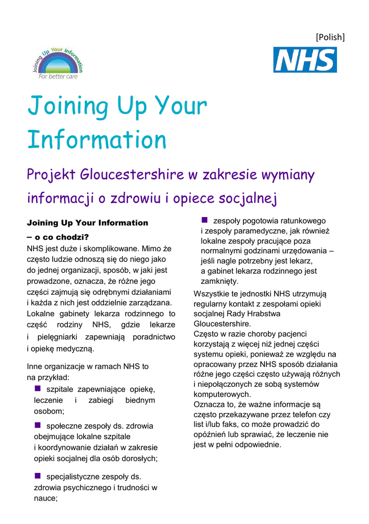 [Polish] Joining Up Your Information Projekt Gloucestershire w zakresie wymiany informacji o zdrowiu i opiece socjalnej Joining Up Your Information – o co chodzi? NHS jest duże i skomplikowane. Mimo że często ludzie odnoszą się do niego jako do jednej organizacji, sposób, w jaki jest prowadzone, oznacza, że różne jego części zajmują się odrębnymi działaniami i każda z nich jest oddzielnie zarządzana. Lokalne gabinety lekarza rodzinnego to część rodziny NHS, gdzie lekarze i pielęgniarki zapewniają i opiekę medyczną. poradnictwo Inne organizacje w ramach NHS to na przykład: szpitale zapewniające opiekę, leczenie osobom; i zabiegi biednym społeczne zespoły ds. zdrowia obejmujące lokalne szpitale i koordynowanie działań w zakresie opieki socjalnej dla osób dorosłych; specjalistyczne zespoły ds. zdrowia psychicznego i trudności w nauce; zespoły pogotowia ratunkowego i zespoły paramedyczne, jak również lokalne zespoły pracujące poza normalnymi godzinami urzędowania – jeśli nagle potrzebny jest lekarz, a gabinet lekarza rodzinnego jest zamknięty. Wszystkie te jednostki NHS utrzymują regularny kontakt z zespołami opieki socjalnej Rady Hrabstwa Gloucestershire. Często w razie choroby pacjenci korzystają z więcej niż jednej części systemu opieki, ponieważ ze względu na opracowany przez NHS sposób działania różne jego części często używają różnych i niepołączonych ze sobą systemów komputerowych. Oznacza to, że ważne informacje są często przekazywane przez telefon czy list i/lub faks, co może prowadzić do opóźnień lub sprawiać, że leczenie nie jest w pełni odpowiednie. [Polish] Co NHS chce zrobić z moimi danymi? Projekt Gloucestershire w zakresie wymiany informacji o opiece – Joining Up Your Information (Łączymy informacje o Tobie) – rozwija system mający na celu zebrania razem kluczowych informacji o pacjencie w jednym miejscu, tak aby odpowiedni ludzie zawsze mieli możliwość uzyskania bezpiecznego elektronicznego dostępu do aktualnych informacji. Co muszę zrobić? Zanim jakiekolwiek informacje zostaną przekazane, NHS poinformuje pacjenta o projekcie. Jeśli jest on zarejestrowany u lekarza rodzinnego w Gloucestershire, w krótkim czasie otrzyma pocztą pismo i ulotkę informacyjną na temat naszych planów, jak również tego, gdzie znaleźć więcej informacji i co należy zrobić później. Należy pamiętać, że w razie wyrażenia zgody na udostępnienie informacji lokalnym lekarzom, pielęgniarkom i pracownikom opieki socjalnego w obrębie systemu opieki nie trzeba odpowiadać na przesłane pismo. Automatycznie zostanie to uznane za wyrażenie zgody. Gdzie mogę dowiedzieć się więcej? Zachęcamy do odwiedzenia witryny internetowej www.mylocalsharedcareinfo.org Telefon 0300 421 1648 i E-mail [email protected] W celu omówienia tych informacji w innych językach należy zadzwonić pod numer 0800 015 1548 lub napisać do Zespołu ds. kontaktów z pacjentami: Freepost RRYY-KSGT-AGBR, PALS, NHS Gloucestershire Clinical Commissioning Group, Sanger House, 5220 Valiant Court, Gloucester Business Park, Gloucester, GL3 4FE.