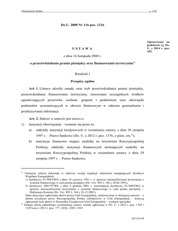 ©Kancelaria Sejmu s. 1/45 Dz.U. 2000 Nr 116 poz. 1216 Opracowano na podstawie t.j. Dz. U. z 2014 r. poz. 455. USTAWA z dnia 16 listopada 2000 r. o przeciwdziałaniu praniu pieniędzy oraz finansowaniu terroryzmu 1) Rozdział 1 Przepisy ogólne Art. 1. Ustawa określa zasady oraz tryb przeciwdziałania praniu pieniędzy, przeciwdziałania finansowaniu terroryzmu, stosowania szczególnych środków ograniczających przeciwko osobom, grupom i podmiotom oraz obowiązki podmiotów uczestniczących w obrocie finansowym w zakresie gromadzenia i przekazywania informacji. Art. 2. Ilekroć w ustawie jest mowa o: 1) instytucji obowiązanej – rozumie się przez to: a) oddziały instytucji kredytowych w rozumieniu ustawy z dnia 29 sierpnia 1997 r. – Prawo bankowe (Dz. U. z 2012 r. poz. 1376, z późn. zm. 2)), b) instytucje finansowe mające siedzibę na terytorium Rzeczypospolitej Polskiej, oddziały instytucji finansowych niemających siedziby na terytorium Rzeczypospolitej Polskiej w rozumieniu ustawy z dnia 29 sierpnia 1997 r. – Prawo bankowe, 1) 2) Niniejsza ustawa dokonuje w zakresie swojej regulacji wdrożenia następujących dyrektyw Wspólnot Europejskich: 1) dyrektywy 91/308/EWG z dnia 10 czerwca 1991 r. w sprawie uniemożliwienia korzystania z systemu finansowego w celu prania pieniędzy (Dz. Urz. WE L 166 z 28.06.1991); 2) dyrektywy 2001/97/WE z dnia 4 grudnia 2001 r. zmieniającej dyrektywę 91/308/EWG w sprawie uniemożliwienia korzystania z systemu finansowego w celu prania pieniędzy – Deklaracja Komisji (Dz. Urz. WE L 344 z 18.12.2001). Dane dotyczące ogłoszenia aktów prawa Unii Europejskiej, zamieszczone w niniejszej ustawie – z dniem uzyskania przez Rzeczpospolitą Polską członkostwa w Unii Europejskiej – dotyczą ogłoszenia tych aktów w Dzienniku Urzędowym Unii Europejskiej – wydanie specjalne. Zmiany tekstu jednolitego wymienionej ustawy zostały ogłoszone w Dz. U. z 2012 r. poz. 1385 i 1529 oraz z 2013 r. poz. 777, 1036, 1289 i 1567. 2015-03-09 ©Kancelaria Sejmu c) s. 2/45 banki krajowe, oddziały banków zagranicznych, w rozumieniu ustawy z dnia 29 sierpnia 1997 r. – Prawo bankowe, d) Narodowy Bank Polski – w zakresie, w jakim prowadzi rachunki bankowe dla osób prawnych, sprzedaż monet, banknotów i numizmatów przeznaczonych na cele kolekcjonerskie oraz na inne cele, skup złota i wymianę zniszczonych środków płatniczych na podstawie ustawy z dnia 29 sierpnia 1997 r. o Narodowym Banku Polskim (Dz. U. z 2013 r. poz. 908 i 1036), e) krajowe instytucje pieniądza elektronicznego, oddziały unijnych instytucji pieniądza elektronicznego, oddziały zagranicznych instytucji pieniądza elektronicznego, agentów rozliczeniowych, krajowe instytucje płatnicze, biura usług płatniczych, oddziały unijnych instytucji płatniczych oraz działających na terytorium Rzeczypospolitej Polskiej agentów tych podmiotów w rozumieniu ustawy z dnia 19 sierpnia 2011 r. o usługach płatniczych (Dz. U. Nr 199, poz. 1175, z późn. zm. 3)), f) firmy inwestycyjne, banki powiernicze, w rozumieniu ustawy z dnia 29 lipca 2005 r. o obrocie instrumentami finansowymi (Dz. U. z 2014 r. poz. 94), g) zagraniczne osoby prawne prowadzące na terytorium Rzeczypospolitej Polskiej działalność maklerską oraz towarowe domy maklerskie w rozumieniu ustawy z dnia 26 października 2000 r. o giełdach towarowych (Dz. U. z 2014 r. poz. 197) oraz spółki handlowe, o których mowa w art. 50a tej ustawy, h) Krajowy Depozyt Papierów Wartościowych S.A. – w zakresie, w jakim prowadzi rachunki papierów wartościowych lub rachunki zbiorcze, [i) podmioty prowadzące działalność – w zakresie gier losowych, zakładów Nowe brzmienie lit. i w pkt 1 w wzajemnych i gier na automatach oraz gier na automatach o niskich art. 2 wejdzie w życie z dn. wygranych,] <i) podmioty prowadzące działalność w zakresie gier losowych, zakładów wzajemnych i gier na automatach,> 3) Zmiany wymienionej ustawy zostały ogłoszone w Dz. U. z 2011 r. Nr 291, poz. 1707, z 2012 r. poz. 1166 oraz z 2013 r. poz. 1036 i 1271. 2015-03-09 1.01.2016 r. (Dz. U. z 2009 r. Nr 201, poz. 1540). ©Kancelaria Sejmu j) s. 3/45 zakłady ubezpieczeń w zakresie ubezpieczeń na życie, w tym ubezpieczycieli krajowych, główne oddziały ubezpieczycieli z państwa niebędącego członkiem Unii Europejskiej, oddziały ubezpieczycieli z państwa członkowskiego Unii Europejskiej, pośredników ubezpieczeniowych w zakresie ubezpieczeń na życie, chyba że za ich działania odpowiedzialność ponosi ubezpieczyciel, k) fundusze inwestycyjne, towarzystwa funduszy inwestycyjnych, w rozumieniu ustawy z dnia 27 maja 2004 r. o funduszach inwestycyjnych (Dz. U. z 2014 r. poz. 157), l) spółdzielcze kasy oszczędnościowo-kredytowe oraz Krajową Spółdzielczą Kasę Oszczędnościowo-Kredytową, m) operatorów pocztowych w rozumieniu ustawy z dnia 23 listopada 2012 r. – Prawo pocztowe (Dz. U. poz. 1529), n) notariuszy – w zakresie czynności notarialnych dotyczących obrotu wartościami majątkowymi, adwokatów wykonujących zawód, radców prawnych wykonujących zawód poza stosunkiem pracy w urzędach obsługujących organy administracji rządowej i jednostkach samorządu terytorialnego, prawników zagranicznych świadczących pomoc prawną poza stosunkiem pracy, biegłych rewidentów wykonujących zawód, doradców podatkowych wykonujących zawód, o) podmioty prowadzące działalność w zakresie usługowego prowadzenia ksiąg rachunkowych, p) podmioty prowadzące działalność w zakresie wymiany walut, q) przedsiębiorców prowadzących: domy aukcyjne, antykwariaty, działalność factoringową, działalność w zakresie obrotu metalami lub kamieniami szlachetnymi i półszlachetnymi, sprzedaży komisowej lub pośrednictwa w obrocie nieruchomościami, r) fundacje, s) stowarzyszenia posiadające osobowość prawną, utworzone na podstawie ustawy z dnia 7 kwietnia 1989 r. – Prawo o stowarzyszeniach (Dz. U. z 2001 r. Nr 7