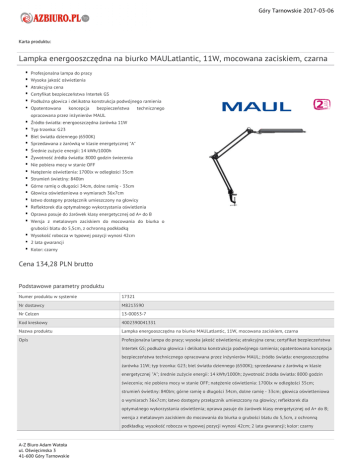 Góry Tarnowskie 2017-03-06 Karta produktu: Lampka energooszczędna na biurko MAULatlantic, 11W, mocowana zaciskiem, czarna Profesjonalna lampa do pracy Wysoka jakość oświetlenia Atrakcyjna cena Certyfikat bezpieczeństwa Intertek GS Podłużna głowica i delikatna konstrukcja podwójnego ramienia Opatentowana koncepcja bezpieczeństwa technicznego opracowana przez inżynierów MAUL Źródło światła: energooszczędna żarówka 11W Typ trzonka: G23 Biel światła dziennego (6500K) Sprzedawana z żarówką w klasie energetycznej "A" Średnie zużycie energii: 14 kWh/1000h Żywotność źródła światła: 8000 godzin świecenia Nie pobiera mocy w stanie OFF Natężenie oświetlenia: 1700lx w odległości 35cm Strumień świetlny: 840lm Górne ramię o długości 34cm, dolne ramię - 33cm Głowica oświetleniowa o wymiarach 36x7cm łatwo dostępny przełącznik umieszczony na głowicy Reflektorek dla optymalnego wykorzystania oświetlenia Oprawa pasuje do żarówek klasy energetycznej od A+ do B Wersja z metalowym zaciskiem do mocowania do biurka o grubości blatu do 5,5cm, z ochronną podkładką Wysokość robocza w typowej pozycji wynosi 42cm 2 lata gwarancji Kolor: czarny Cena 134,28 PLN brutto Podstawowe parametry produktu Numer produktu w systemie 17321 Nr dostawcy M8213590 Nr Celcen 13-00053-7 Kod kreskowy 4002390041331 Nazwa produktu Lampka energooszczędna na biurko MAULatlantic, 11W, mocowana zaciskiem, czarna Opis Profesjonalna lampa do pracy; wysoka jakość oświetlenia; atrakcyjna cena; certyfikat bezpieczeństwa Intertek GS; podłużna głowica i delikatna konstrukcja podwójnego ramienia; opatentowana koncepcja bezpieczeństwa technicznego opracowana przez inżynierów MAUL; źródło światła: energooszczędna żarówka 11W; typ trzonka: G23; biel światła dziennego (6500K); sprzedawana z żarówką w klasie energetycznej "A"; średnie zużycie energii: 14 kWh/1000h; żywotność źródła światła: 8000 godzin świecenia; nie pobiera mocy w stanie OFF; natężenie oświetlenia: 1700lx w odległości 35cm; strumień świetlny: 840lm; górne ramię o długości 34cm, dolne ramię - 33cm; głowica oświetleniowa o wymiarach 36x7cm; łatwo dostępny przełącznik umieszczony na głowicy; reflektorek dla optymalnego wykorzystania oświetlenia; oprawa pasuje do żarówek klasy energetycznej od A+ do B; wersja z metalowym zaciskiem do mocowania do biurka o grubości blatu do 5,5cm, z ochronną podkładką; wysokość robocza w typowej pozycji wynosi 42cm; 2 lata gwarancji; kolor: czarny A-Z Biuro Adam Watoła ul. Oświęcimska 3 41-600 Góry Tarnowskie Góry Tarnowskie 2017-03-06 Karta katalogowa produktu cd. Lampka energooszczędna na biurko MAULatlantic, 11W, mocowana zaciskiem, czarna Kategoria Lampki Klasa Premium Marka MAUL Cecha Cykl życia (h) 8000 Typ Energooszczędna Natężenie światła LUMEN 840 Natężenie światła LUX 1700 Klasa energetyczna A W ofercie od 2013-01 Rodzaj 11W Produkt Lampka mocowana do blatu Materiał Metal/plastik Certyfikaty Certyfikaty, normy, patenty Intertek GS Ilość lat gwarancji 2 Hit Hit Nowy produkt w ofercie Standard Wymiary Wysokość (mm) 420 Wspólny słownik zamówień CPV 31521100-5 Kolor Kolor Pozostałe zdjęcia produktu A-Z Biuro Adam Watoła ul. Oświęcimska 3 41-600 Góry Tarnowskie Czarny Góry Tarnowskie 2017-03-06 Serdecznie zapraszamy do współpracy A-Z Biuro Adam Watoła zespół. A-Z Biuro Adam Watoła ul. Oświęcimska 3 41-600 Góry Tarnowskie