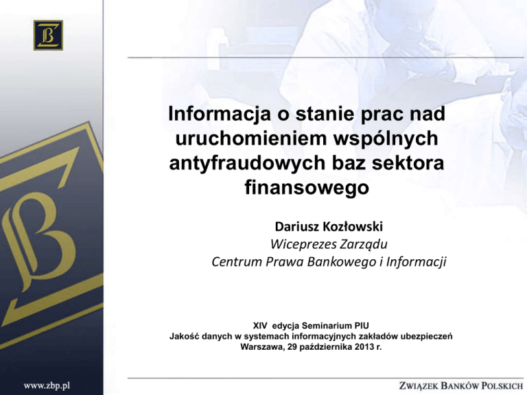 Informacja o stanie prac nad uruchomieniem wspólnych antyfraudowych baz sektora finansowego Dariusz Kozłowski Wiceprezes Zarządu Centrum Prawa Bankowego i Informacji XIV edycja Seminarium PIU Jakość danych w systemach informacyjnych zakładów ubezpieczeń Warszawa, 29 października 2013 r. BARIERY PRAWNE • ograniczenia wynikające z przepisów ustawy – Prawo bankowe. Gromadzone i przetwarzane w bazach informacje w zakresie, w jakim pochodzą od banków, instytucji kredytowych oraz oddziałów banków zagranicznych i dotyczą czynności bankowych i objęte są tajemnicą bankową. • ograniczenia wynikające z przepisów ustawy – Prawo ubezpieczeniowe. Zakład ubezpieczeń i osoby w nim zatrudnione lub osoby i podmioty, przy pomocy których zakład ubezpieczeń wykonuje czynności ubezpieczeniowe, są obowiązane do zachowania tajemnicy dotyczącej poszczególnych umów ubezpieczenia • brak gotowości administracji państwowej do szerokiego udostępniania rejestrów publicznych w celu budowania bezpiecznego obrotu gospodarczego i szybszego rozwoju współpracy • wysokość opłat jest poważną blokadą w wykorzystaniu elektronicznej współpracy z rejestrami publicznymi Jak można zmienić ???? NOWELIZACJA ODPOWIEDNICH USTAW Planowane przez ZBP zmiany do ustawy Prawo bankowe Art. 106d. 1. Banki i instytucje, o których mowa w art. 105 ust. 4, mogą przetwarzać i udostępniać innym bankom i zakładom ubezpieczeń informacje, w tym informacje objęte tajemnicą bankową, w przypadkach: 1) uzasadnionych podejrzeń, o których mowa w art. 106a ust. 3, 2) przestępstw dokonywanych na szkodę banków, instytucji kredytowych, oraz instytucji finansowych i ich klientów w celu i zakresie niezbędnym do zapobiegania tym przestępstwom. Oczekiwana przez środowisko bankowe tożsama zmiana do ustawy Prawo ubezpieczeniowe Współpraca w zakresie zmian prawa w kierunku poprawy zarządzania ryzykiem, ułatwiająca wymianę informacji (w tym zakresie dostępu do rejestrów publicznych) MOŻLIWE OBSZARY WSPÓŁPRACY Z SEKTOREM BANKOWYM 1. System AMRON - platforma dla gromadzenia danych o cenach transakcyjnych nieruchomości oraz danych o nieruchomościach rozproszonych w różnych zbiorach administracji publicznej i samorządowej 2. System ZORO - analiza i modelowanie ryzyka operacyjnego 3. System SWOZ - platforma wymiany informacji o próbach i przestępstwach w obrocie ubezpieczeniowym 4. System Lista Osób Poszukiwanych Listami Gończymi – ograniczenie ryzyka nawiązania relacji biznesowych z osobami poszukiwanymi przez Policję. 5. Budowa wspólnych zasobów bazodanowych np. baza podmiotów współpracujących z firmami ubezpieczeniowymi lub bankami, które dokonały fraudów. PODSTAWOWE INFORMACJE • ogólnopolska baza danych o nieruchomościach – charakterystyka i opis nieruchomości – szczegółowa lokalizacja (TERYT, mapy GIS) – informacje o cenach i wartościach nieruchomości w oparciu o udokumentowane źródła • standaryzacja gromadzonych danych – zakres danych obligatoryjnych – gwarancja minimum informacji – słowniki – brak przypadkowych wpisów • aktualny status bazy danych – zasoby bazy danych AMRON przekroczyły poziom 1 550 000 rekordów - w tym 757,5 tys. rekordów to dane bankowe – przyrost danych w roku 2010 – 164 tys. rekordów – przyrost danych w roku 2011 – ponad 185 tys. rekordów – przyrost danych w roku 2012 – 332 tys. rekordów Źródła informacji umowa przedwstępna (rynek pierwotny/ wtórny) kupno - sprzedaż (rynek pierwotny/ wtórny) wartość ubezpieczeniowa* operat szacunkowy wycena zabezpieczenia bankowego oferta darowizna aport do spółki przetarg sprzedaż przez komornika sprzedaż przez syndyka inne * możliwość wprowadzenia odrębnego źródła - polisy ubezpieczenia majątkowego Oferta współpracy • uczestnictwo w Systemie AMRON – dostęp do pełnych zasobów i funkcjonalności Systemu – aplikacja internetowa, logowanie za pomocą indywidualnego loginu i hasła • specjalne, dedykowane raporty/ analizy • aplikacja kalkulatorów wartości ubezpieczeniowej nieruchomości – możliwość wyliczenia wartości ubezpieczeniowej mieszkań (wartość rynkowa) i domów (wartość ubezpieczeniowa) – algorytm matematyczny oparty na zdefiniowanych atrybutach mających wpływ na wartość nieruchomości, uzupełniony o cyklicznie aktualizowane tabele z wartościami referencyjnymi, wskaźnikami i mnożnikami Oferta współpracy https://www.tu.pl/oferta/ubezpieczenia_mieszkaniowe.html ✓ LOKALIZACJA ✓ ROK BUDOWY ✓ ✓ POWIERZCHNIA UŻYTKOWA WARTOŚĆ UBEZPIECZENIOWA ………………………… ………………………… AKCEPTACJA KLIENTA ZAWARCIE POLISY UBEZPIECZENIOWEJ AKCEPTACJA KLIENTA ŚCIEŻKA EKSPERCKA Dyrektywa Solvency II - stworzenie systemu wypłacalności uwzględniającego profil ryzyka, na jakie narażone są zakłady ubezpieczeń i zakłady reasekuracji w związku z prowadzoną przez nie działalnością: • wprowadzenie nowych zasad szacowania wymogów kapitałowych w oparciu o indywidualną ocenę ryzyka firmy ubezpieczeniowej • powiązanie wielkości kapitałów, jakim dysponuje towarzystwo ubezpieczeniowe z wielkością ryzyka, jakie się naraża w związku z prowadzoną działalnością • możliwość indywidualnego wyboru przez firmę ubezpieczeniową pomiędzy stosowaniem metod standardowych lub bardziej zaawansowanych modeli wewnętrznych • modyfikacja metod i standardów sprawowania nadzoru nad rynkiem ubezpieczeniowym – na wzór wymogów zarządzania ryzykiem opartych na Dyrektywie CRD stosowanych obecnie w bankach, domach maklerskich, czy firmach inwestycyjnych . 1. Modelowanie ryzyka operacyjnego: Uwzględnienie zewnętrznych informacji o stratach narzucone przez wymagania nadzorcze (np. uchwała KNF nr 76/2010 zał .nr 14 § 55, rekomendacja M) Informacje zewnętrzne wykorzystane do modelowania dotkliwości strat ogona rozkładu (LDA) Skalowanie informacji dla 