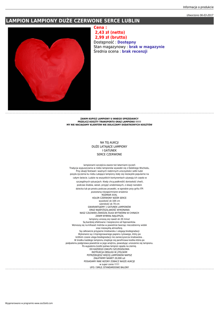 Informacje o produkcie Utworzono 06-03-2017 LAMPION LAMPIONY DUŻE CZERWONE SERCE LUBLIN Cena : 2,43 zł (netto) 2,99 zł (brutto) Dostępność : Dostępny Stan magazynowy : brak w magazynie Średnia ocena : brak recenzji ZANIM KUPISZ LAMPIONY U INNEGO SPRZEDAWCY PRZELICZ KOSZTY TRANSPORTU ORAZ LAMPIONU !!!!!! MY NIE NACIĄGAMY KLIENTÓW NIE DOLICZAMY DODATKOWYCH KOSZTÓW NA TEJ AUKCJI DUŻE LATAJĄCE LAMPIONY I GATUNEK SERCE CZERWONE lampionami szczęścia zwane też latarniami życzeń Tradycja wypuszczania w niebo lampionów wywodzi się z Dalekiego Wschodu, Przy okazji festiwali i ważnych rodzinnych uroczystości setki ludzi posyła życzenia ku niebu Latające lampiony stały się niezwykle popularne na całym świecie. Ludzie na wszystkich kontynentach używają ich często w szczególnych sytuacjach. Kiedy chcą podkreślić doniosłość chwili, podczas ślubów, wesel, przyjęć urodzinowych, z okazji narodzin dziecka lub po prostu podczas prywatki, w ogrodzie przy grillu ITP. pozostaną niezapomniane wrażenia ROZMIAR XXXL KOLOR CZERWONY WZÓR SERCE wysokość ok 104 cm szerokość ok 70 cm GWARANTUJEMY 1 GATUNEK LAMPIONÓW ORAZ NAJWYŻSZĄ JAKOŚĆ WYKONANIA NASZ CZŁOWIEK ZWIEDZIŁ KILKA WYTWÓRNI W CHINACH ZANIM WYBRAŁ NAJLEPSZĄ lampiony unoszą się nawet ok 20 minut Są bardziej efektowne i bezpieczne od fajerwerków. Wznoszą się na kilkaset metrów w powietrze tworząc niecodzienny widok oraz niezwykłą atmosferę. Są całkowicie przyjazne środowisku i ulegają biodegradacji Wykonane są z impregnowanego papieru ryżowego, który po krótkim czasie ulega biodegradacji nie zanieczyszcza środowiska . W środku każdego lampionu znajduje się parafinowa kostka która po podpaleniu podgrzewa powietrze w jego wnętrzu, powodując unoszenie się lampionu. Po wypaleniu kostki paliwa lampion opada na ziemię. DO KAŻDEGO ZAKUPU SZCZEGÓŁOWA INSTRUKCJA OBSŁUGI W J.POLSKIM POTRZEBUJESZ WIĘCEJ LAMPIONÓW NAPISZ ZAŁATWIMY NAWET 20,000 szt POSIADAMY INNE WZORY ZOBACZ NASZE AUKCJE w super cenie !!!!!! UFO / SMILE /STANDARDOWE BALONY Wygenerowano w programie www.oscGold.com