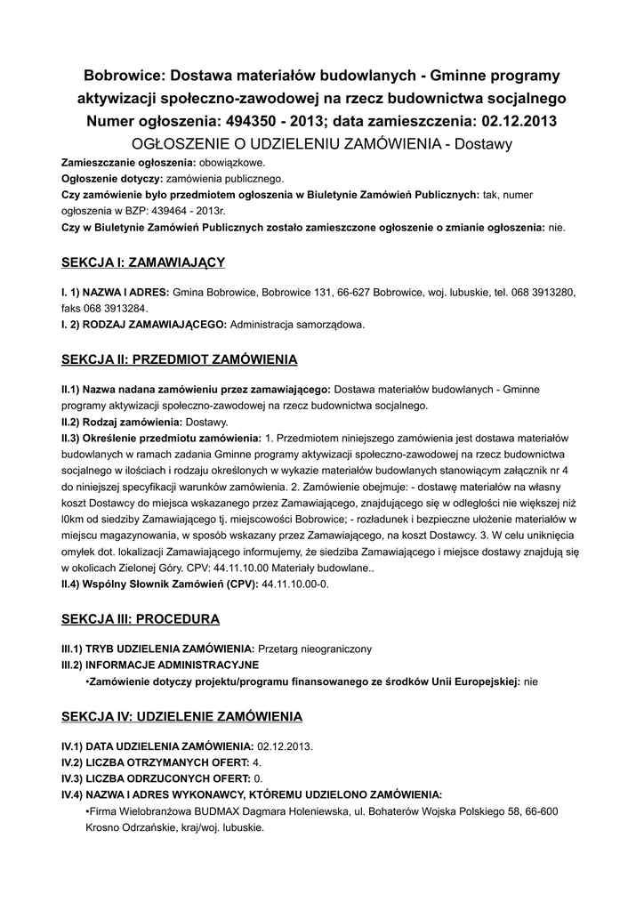 Bobrowice: Dostawa materiałów budowlanych - Gminne programy aktywizacji społeczno-zawodowej na rzecz budownictwa socjalnego Numer ogłoszenia: 494350 - 2013; data zamieszczenia: 02.12.2013 OGŁOSZENIE O UDZIELENIU ZAMÓWIENIA - Dostawy Zamieszczanie ogłoszenia: obowiązkowe. Ogłoszenie dotyczy: zamówienia publicznego. Czy zamówienie było przedmiotem ogłoszenia w Biuletynie Zamówień Publicznych: tak, numer ogłoszenia w BZP: 439464 - 2013r. Czy w Biuletynie Zamówień Publicznych zostało zamieszczone ogłoszenie o zmianie ogłoszenia: nie. SEKCJA I: ZAMAWIAJĄCY I. 1) NAZWA I ADRES: Gmina Bobrowice, Bobrowice 131, 66-627 Bobrowice, woj. lubuskie, tel. 068 3913280, faks 068 3913284. I. 2) RODZAJ ZAMAWIAJĄCEGO: Administracja samorządowa. SEKCJA II: PRZEDMIOT ZAMÓWIENIA II.1) Nazwa nadana zamówieniu przez zamawiającego: Dostawa materiałów budowlanych - Gminne programy aktywizacji społeczno-zawodowej na rzecz budownictwa socjalnego. II.2) Rodzaj zamówienia: Dostawy. II.3) Określenie przedmiotu zamówienia: 1. Przedmiotem niniejszego zamówienia jest dostawa materiałów budowlanych w ramach zadania Gminne programy aktywizacji społeczno-zawodowej na rzecz budownictwa socjalnego w ilościach i rodzaju określonych w wykazie materiałów budowlanych stanowiącym załącznik nr 4 do niniejszej specyfikacji warunków zamówienia. 2. Zamówienie obejmuje: - dostawę materiałów na własny koszt Dostawcy do miejsca wskazanego przez Zamawiającego, znajdującego się w odległości nie większej niż l0km od siedziby Zamawiającego tj. miejscowości Bobrowice; - rozładunek i bezpieczne ułożenie materiałów w miejscu magazynowania, w sposób wskazany przez Zamawiającego, na koszt Dostawcy. 3. W celu uniknięcia omyłek dot. lokalizacji Zamawiającego informujemy, że siedziba Zamawiającego i miejsce dostawy znajdują się w okolicach Zielonej Góry. CPV: 44.11.10.00 Materiały budowlane.. II.4) Wspólny Słownik Zamówień (CPV): 44.11.10.00-0. SEKCJA III: PROCEDURA III.1) TRYB UDZIELENIA ZAMÓWIENIA: Przetarg nieograniczony III.2) INFORMACJE ADMINISTRACYJNE •Zamówienie dotyczy projektu/programu finansowanego ze środków Unii Europejskiej: nie SEKCJA IV: UDZIELENIE ZAMÓWIENIA IV.1) DATA UDZIELENIA ZAMÓWIENIA: 02.12.2013. IV.2) LICZBA OTRZYMANYCH OFERT: 4. IV.3) LICZBA ODRZUCONYCH OFERT: 0. IV.4) NAZWA I ADRES WYKONAWCY, KTÓREMU UDZIELONO ZAMÓWIENIA: •Firma Wielobranżowa BUDMAX Dagmara Holeniewska, ul. Bohaterów Wojska Polskiego 58, 66-600 Krosno Odrzańskie, kraj/woj. lubuskie. IV.5) Szacunkowa wartość zamówienia (bez VAT): 15609,54 PLN. IV.6) INFORMACJA O CENIE WYBRANEJ OFERTY ORAZ O OFERTACH Z NAJNIŻSZĄ I NAJWYŻSZĄ CENĄ •Cena wybranej oferty: 17534,48 •Oferta z najniższą ceną: 17534,48 / Oferta z najwyższą ceną: 28025,25 •Waluta: PLN.