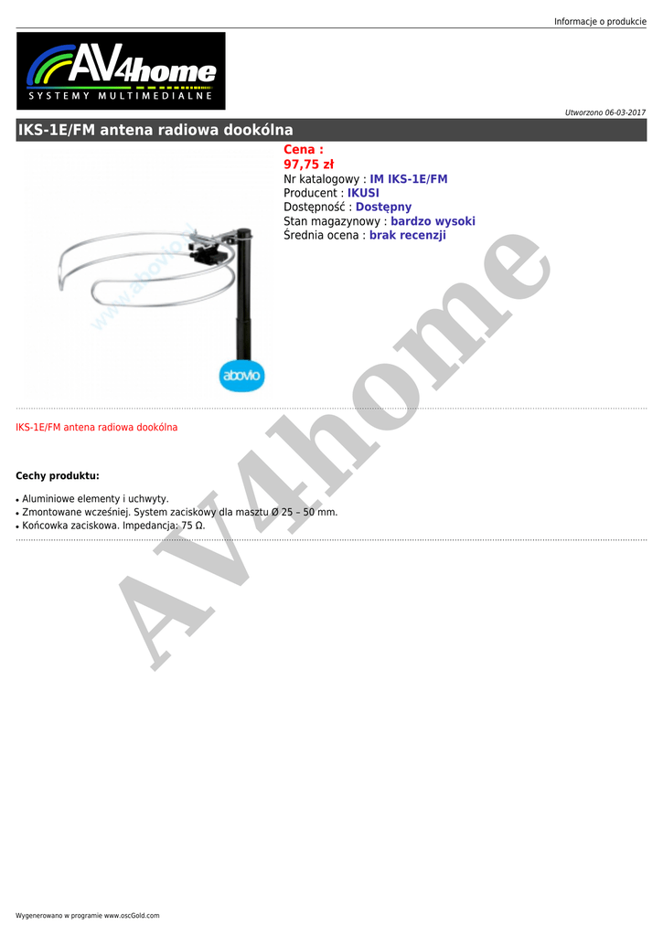 Informacje o produkcie Utworzono 06-03-2017 IKS-1E/FM antena radiowa dookólna Cena : 97,75 zł Cechy produktu: ● ● Aluminiowe elementy i uchwyty. Zmontowane wcześniej. System zaciskowy dla masztu Ø 25 – 50 mm. Końcowka zaciskowa. Impedancja: 75 Ω. AV ● 4h IKS-1E/FM antena radiowa dookólna om e Nr katalogowy : IM IKS-1E/FM Producent : IKUSI Dostępność : Dostępny Stan magazynowy : bardzo wysoki Średnia ocena : brak recenzji Wygenerowano w programie www.oscGold.com