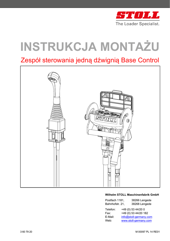 INSTRUKCJA MONTAŻU Zespół sterowania jedną dźwignią Base Control Wilhelm STOLL Maschinenfabrik GmbH Postfach 1181, Bahnhofstr. 21, Telefon: Fax: E-Mail: Web: 3 60 79 20 38266 Lengede 38268 Lengede +49 (0) 53 44/20 0 +49 (0) 53 44/20 182 [email protected] www.stoll-germany.com M 00097 PL 14 RE01 Treść 1 Bezpieczeństwo ............................................................................................................................ 3 1.1 Zalecenia dotyczące zapobiegania zagrożeniom podczas montażu i instalacji ................... 3 1.2 Zalecenia w celu uniknięcia zagrożeń z powodu wadliwej instalacji .................................... 3 1.3 Zastosowanie zgodne z przeznaczeniem ............................................................................. 3 2 Informacje odnośnie instrukcji montażu........................................................................................ 3 3 Przegląd instalacji ......................................................................................................................... 4 4 Montaż dźwigni obsługowej .......................................................................................................... 5 5 6 4.1 Montaż cięgien Bowdena na dźwigni obsługowej................................................................. 5 4.2 Dołączenie dźwigni obsługowej ............................................................................................ 5 4.3 Podłączenie przycisków na dźwigni sterującej (opcja) ......................................................... 6 Montaż zaworu proporcjonalnego................................................................................................. 7 5.1 Montaż cięgien Bowdena na zaworze proporcjonalnym ....................................................... 7 5.2 Dołączenie zaworu proporcjonalnego na ciągniku ............................................................... 8 5.3 Dołączenie hydrofixu (opcja) ................................................................................................ 9 5.3.1 Wersja standardowa ....................................................................................................... 9 5.3.2 Wyposażenie ze zintegrowanym łącznikiem elektrycznym ........................................... 10 Podłączenie przewodów hydraulicznych .................................................................................... 11 6.1 Przyporządkowanie przewodów ładowacza czołowego do punktów przyłączeniowych ..... 12 6.2 Base Control ST dla ciągników z hydrauliką Open-Center lub z hydrauliką ClosedCenter. ................................................................................................................................ 13 6.2.1 Zasada działania ........................................................................................................... 13 6.2.2 Przyłączenie przewodów hydraulicznych na ciągniku................................................... 14 6.2.3 Punkty przyłączeniowe na zaworach proporcjonalnych Base Control ST .................... 15 6.3 2 Base Control LS dla ciągników z hydrauliką Load-Sensing................................................ 16 6.3.1 Zasada działania ........................................................................................................... 16 6.3.2 Przyłączenie przewodów hydraulicznych na ciągniku................................................... 17 6.3.3 Punkty przyłączeniowe na zaworze proporcjonalnym Base Control LS ....................... 18 Instrukcja montażu M 00097 PL 14 RE01 1 Bezpieczeństwo 1.1 Zalecenia dotyczące zapobiegania zagrożeniom podczas montażu i instalacji ● Zabezpieczyć ciągnik przed przypadkowym uruchomieniem i przetoczeniem się! Niebezpieczeństwo przy pracach związanych z hydrauliką! Olej hydrauliczny może wyciekać pod wysokim ciśnieniem / z dużą prędkością i może spodować ciężkie obrażenia osób przebywających w pobliżu. Narzędzia hydrauliczne mogą się niespodziewanie poruszyć podczas spadku ciśnienia (np. przy poluzowaniu przewodu)! ● Przed rozpoczęciem prac na układzie hydraulicznym należy ustawić system bezciśnieniowo i zabezpieczyć przed ponownym włączeniem. Należy przy tym przestrzegać instrukcji obsługi ciągnika. ● W przypadku nieuniknionych prac na systemie hydraulicznym pod ciśnieniem (np. przy odpowietrzaniu): Należy zabezpieczyć się przed wypływającym olejem! Należy upewnić się, że żadne inne osoby nie są zagrożone! ● Podczas prac związanych z hydrauliką podwozia (np. poluzowanie i przekręcanie przewodów hydraulicznych kierowania): Należy podeprzeć osie ciągnika, aby zapobiec opuszczeniu czy ugięciu podczas pracy. 1.2 Zalecenia w celu uniknięcia zagrożeń z powodu wadliwej instalacji Błędnie poprowadzone przewody hydrauliczne mogą zagrażać operatorowi i innym osobom! ● Należy zainstalować właściwe i odpowiednie przewody hydrauliczne! Należy przestrzegać wskazówek dotyczących montażu przewodów hydraulicznych! (rozdział 6) ● Należy przestrzegać przepisów bezpieczeństwa i higieny pracy oraz norm technicznych dla przewodów hydraulicznych obowiązujących i wykorzystywanych w miejscu lokalizacji montażu względnie instalacji. 1.3 Zastosowanie zgodne z przeznaczeniem Opisane w tej instrukcji zespoły sterowania jedną dźwignią „Base Control“ przeznaczone są wyłącznie do montażu do ciągników wykorzystywanych w rolnictwie i leśnictwie w celu eksploatacji i pracy z ładowaczami czołowymi Stoll. Maksymalne dopuszczalne ciśnienie w układzie hydraulicznym wynosi 205 bar. Oprócz tego obowiązują tu dane do zastosowania zgodnego z przeznaczeniem i dane techniczne zawarte w instrukcji obsługi ładowacza czołowego. 2 Informacje odnośnie instrukcji montażu Ta instrukcja montażu opisuje różne wersje zespołów sterowania jedną dźwignią „Base Control“. Należy r