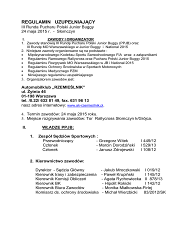 REGULAMIN UZUPEŁNIAJĄCY III Runda Pucharu Polski Junior Buggy 24 maja 2015 r. - Słomczyn I. ZAWODY I ORGANIZATOR 1. Zawody stanowią III Rundę Pucharu Polski Junior Buggy (PPJB) oraz III Rundę MO Warszawskiego w Junior Buggy i National 2015 2. Niniejsze zawody organizowane są na podstawie : Międzynarodowego Kodeksu Sportu Samochodowego FIA wraz z załącznikami Regulaminu Ramowego Rallycross oraz Pucharu Polski Junior Buggy 2015 Regulaminu Rozgrywek MO Warszawskiego w JB i National 2015 Regulaminu Ochrony Środowiska w Sportach Motorowych Regulaminu Medycznego PZM Niniejszego regulaminu uzupełniającego 3. Organizatorem zawodów jest: Automobilklub „RZEMIEŚLNIK” ul. Żytnia 46 01-198 Warszawa tel. /0.22/ 632 81 49, fax. 631 96 13 nasz adres internetowy: www.ak-rzemieślnik.pl. 4. Termin zawodów: 24 maja 2015 roku. 5. Miejsce rozgrywania zawodów: Tor Rallycross Słomczyn k/Grójca. II. WŁADZE PPJB: 1. Zespół Sędziów Sportowych : Przewodniczący - Grzegorz Witek Członek - Marcin Dorodziński Członek - Janusz Zdrojewski I 449/12 I 529/13 I 108/12 2. Kierownictwo zawodów: Dyrektor - Sędzia Główny Kierownik trasy i zabezpieczenia Kierownik Komisji Obliczeń Kierownik BK Kierownik Biura Zawodów Komisarz ds. ochrony środowiska - Jakub Mroczkowski I 019/12 - Paweł Krupiński I 145/12 - Agata Rychowiecka II 878/13 - Hipolit Rokicki I 142/12 - Monika Miałkowska-Firlej - Michał Wierzbicki 83/2012/SK III. PROGRAM NIEDZIELA, 24 maja 2015 r. Park Maszyn udostępniony w godz. 7.00 – 18.00 Harmonogram zawodów 7.30 - Otwarcie biura zawodów i wydawanie dokumentów 8.20 - Obowiązkowa odprawa z zawodnikami 8.30-10.00 - Badanie kontrolne 10.15 - I posiedzenie ZSS 9.45-10.30 - Treningi wolne (Tylko samochody dopuszczone po Badaniu Kontrolnym) 10.45 - Trening oficjalny 11.30 - II posiedzenie ZSS 11.45 - I kwalifikacja 13.00 - II kwalifikacja 14.15 - III kwalifikacja po zakończeniu III kwalifikacji - III posiedzenie ZSS 16.00 - Biegi finałowe D, C, B, A po zakończeniu biegów finałowych i BK-2 - IV posiedzenie ZSS - ogłoszenie wyników i rozdanie nagród IV.POSTANOWIENIA OGÓLNE 1. Wszystkich uczestników obowiązuje całkowity zakaz treningów i jazd testowych na torze RC poza wyznaczonymi godzinami, jak również na terenie Parku Maszyn i dróg dojazdowych pod rygorem wykluczenia z zawodów. Prędkość dozwolona na terenie Parku Maszyn max. 10 km/h. Treningi wolne zostaną zorganizowane wg. harmonogramu zawodów. Będą miały formę wyjazdu na 3 okrążenia toru. W czasie przeznaczonym na trening wolny, ilość wyjazdów dowolna. 2. Park Maszyn zostanie udostępniony w dniu zawodów od godz. 7.00. Zajęcie stanowiska w Parku Maszyn może nastąpić po odbiorze dokumentów w Biurze Zawodów . 3. Zgłoszenie do zawodów może być dokonane wyłącznie za pośrednictwem serwisu INSIDE PZM dostępnego m.in. ze strony internetowej www.pzm.pl lub www.ak-rzemieslnik.pl. Zawodnicy zobowiązani są do przestrzegania procedury zgłoszeń opisanej w art. 8 Regulaminu Ramowego Rallycross. Wydrukowany formularz zgłoszenia podpisany przez zawodnika i/lub kierowcę należy złożyć w biurze zawodów podczas OA. 4. Zgłoszenia: I termin zgłoszeń upływa z dniem - 17.05. 2015 roku II termin zgłoszeń upływa z dniem - 21.05. 2015 roku 5. Wpisowe: Zgłoszenie jest ważne wyłącznie z jednoczesnym dokonaniem wpłaty wpisowego na rachunek Automobilklubu Rzemieślnik: Bank BPH SA O/Warszawa 39 1060 0076 0000 3200 0133 6275 .5.1 Wpisowe na Rundę PPJB i MO wynosi – 150 zł. (w II terminie 150% - 225,- zł) 5.2 Wpisowe na Rundę MO w klasie National wynosi – 300 zł. ( w II terminie 150% - 450 zł. 6. Niesportowe zachowanie zawodnika lub jego serwisu/zespołu podczas imprezy będzie karane karą pieniężną od 50,- do 500,- zł. a następnie wykluczeniem zawodnika z zawodów. Pod rygorem wykluczenia z biegu na polach startowych obowiązuje kompletne wyposażenie bezpieczeństwa (zapięty kask, pasy, rękawiczki, osłona oczu) Czas oczekiwania na polach startowych na spóźnionego zawodnika –max. 2 min. Czas na tankowanie pomiędzy finałami –max. 5 min. 7. Dla PPJB i MO Junior Buggy kaucja za protest dotyczący wykroczeń regulaminowych, kar wyznaczonych przez sędziego lub wyników – 300 zł. Wysokość kaucji za protest techniczny – 750 zł. 7.1 Dla MO w Klasie National kaucja za protest dotyczący wykroczeń regulaminowych, kar wyznaczonych przez sędziego lub wyników – 600 zł. Wysokość kaucji za protest techniczny – 1500 zł. 8. Wykonanie Badania Kontrolnego w terminie innym niż podany w niniejszym regulaminie możliwe jest jedynie za zgodą Dyrektora Zawodów . 9. Odprawa z uczestnikami odbędzie się przed Biurem Zawodów. Nieobecność na odprawie - brak podpisu na liście obecności, karana będzie w zakresie: od kary finansowej min. 200 zł aż do wykluczenia włącznie. 10. Trening Oficjalny odbędzie się na dwóch okrążeniach toru, mierzone będą dwa okrążenia, liczone będzie jedno najlepsze okrążenie. 11. Biegi kwalifikacyjne odbędą się na dystansie 4 okrążeń toru. Pod karą wykluczenia obowiązuje jednokrotny przejazd odcinka Joker Lap na dowolnym okrążeniu. 12. Biegi finałowe odbędą się na dystansie 6 okrążeń toru. Pod karą wykluczenia obowiązuje jednokrotny przejazd odcinka Joker Lap na dowolnym okrążeniu. 13.”Park zamknięty” jest obowiązkowy dla uczestników biegów finałowych. 14.NAGRODY: Puchary dla pierwszych trzech uczestników w finale A. 15. Organizator nie rezerwuje hoteli na czas trwania imprezy . Zatw. Klub –S.Kołakowski Zatwierdzono ZO PZM: Wiza: nr S/122/2015 Dyrektor Zawodów z dn.24.04.2015r. Jakub Mroczkowski