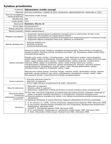 Sylabus przedmiotu Przedmiot: Odnawialne źródła energii Kierunek: Ochrona środowiska, I stopień [6 sem], stacjonarny, ogólnoakademicki, rozpoczęty w: 2012 Tytuł lub szczegółowa Odnawialne źródła energii nazwa przedmiotu: Rok/Semestr: III/6 Liczba godzin: 15,0 Nauczyciel: Kuśmierz, Marcin, dr Forma zajęć: konwersatorium Rodzaj zaliczenia: zaliczenie na ocenę Poziom trudności: średnio zaawansowany 1. 2. Wstępne wymagania: 3. 4. Znajomość Znajomość Znajomość Znajomość najważniejszych problemów energetycznych w skali świata, Europy i kraju roli enegetyki we współczesnym świecie podstawowych procesów technologicznych wykorzystywanych w produkcji energii wpływu energetyki klasycznej i jądrowej na środowisko • dyskusja dydaktyczna Metody dydaktyczne: • warsztaty grupowe • wykład konwersatoryjny Klasyczne źródła energii. Problemy energetyki konwencjonalnej. Nowe trendy w energetyce konwencjonalnej. Elementy polityki energetycznej Polski i UE. Odnawialne źródła energii (OZE) charakterystyka ogólna. Energia ruchu wody: zasoby i charakterystyka , duże elektrownie wodne, mała energetyka wodna (MEW), wpływ na środowisko. Energia pływów, energia ruchu fal, energia termiczna wody, zalety i wady. Energia wiatru: zasoby i charakterystyka, turbiny wiatrowe, morskie farmy Zakres tematów: wiatrowe (MFW), wpływ na środowisko, zalety i wady. Energia słoneczna: zasoby i charakterystyka, kolektory słoneczne, ogniwa fotowoltaiczne, aktywne i pasywne systemy energii słonecznej, perspektywy rozwoju, zalety i wady. Energia geotermalna: zasoby i charakterystyka, wpływ na środowisko, zalety i wady. Alternatywne nośniki energii: biomasa i biogaz, metanol, wodór, akumulatory energii. Ogniwa paliwowe: zasada działania, typy ogniw, zastosowania, perspektywy rozwoju, zalety i wady. Oszczędzanie energii i nowoczesne technologie energooszczędne. • końcowe zaliczenie pisemne Forma oceniania: • obecność na zajęciach • ocena ciągła (bieżące przygotowanie do zajęć i aktywność) 1. Obecność na zajęciach Warunki zaliczenia: 2. Aktywny udział w zajęciach 3. Wykonanie i wygłoszenie krótkiej prezentacji na temat wskazany przez prowadzącego 02 Zna rolę i znaczenie środowiska przyrodniczego dla funkcjonowania człowieka, wskazuje na Modułowe efekty istotę i znaczenie zasobów naturalnych, w szczególności surowców energetycznych kształcenia 04 Rozumie problemy energetyczne świata i zna metody pozyskiwania energii konwencjonalnej i realizowane w ramach odnawialnej przedmiotu: 13 Wykazuje ostrożność w ocenie informacji mających odniesienie do ochrony środowiska 1. G. W. vanLoon, S. J. Duffy, Chemia środowiska, Wydawnictwo Naukowe PWN, Warszawa 2008. 2. M. Kaczmarski, Bezpieczeństwo energetyczne Unii Europejskiej, Wydawnictwa Akademickie i Profesjonalne, Warszawa 2010. Literatura: 3. Celiński Z., Energetyka jądrowa, PWN, Warszawa 1991. 4. W. M. Lewandowski, Proekologiczne, odnawialne źrodła energii, WNT, Warszawa 2007. 5. R. Tytko, Odnawialne źródła energii, Wydawnictwo OWG, Warszawa 2009.