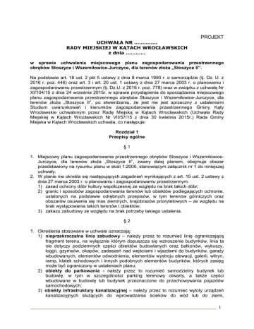 PROJEKT UCHWAŁA NR ………….. RADY MIEJSKIEJ W KĄTACH WROCŁAWSKICH z dnia ………… w sprawie uchwalenia miejscowego planu zagospodarowania przestrzennego obrębów Stoszyce i Wszemiłowice-Jurczyce, dla terenów złoża „Stoszyce II”. Na podstawie art. 18 ust. 2 pkt 5 ustawy z dnia 8 marca 1990 r. o samorządzie (tj. Dz. U. z 2016 r. poz. 446) oraz art. 3 i art. 20 ust. 1 ustawy z dnia 27 marca 2003 r. o planowaniu i zagospodarowaniu przestrzennym (tj. Dz.U. z 2016 r. poz. 778) oraz w związku z uchwałą Nr XI/104/15 z dnia 24 września 2015r. w sprawie przystąpienia do sporządzenia miejscowego planu zagospodarowania przestrzennego obrębów Stoszyce i Wszemiłowice-Jurczyce, dla terenów złoża „Stoszyce II”, po stwierdzeniu, że jest nie jest sprzeczny z ustaleniami Studium uwarunkowań i kierunków zagospodarowania przestrzennego Gminy Kąty Wrocławskie uchwalonym przez Radę Miejską w Kątach Wrocławskich (Uchwała Rady Miejskiej w Kątach Wrocławskich Nr VII/57/15 z dnia 30 kwietnia 2015r.) Rada Gminy Miejska w Kątach Wrocławskich uchwala, co następuje: Rozdział 1 Przepisy ogólne §1 1. Miejscowy planu zagospodarowania przestrzennego obrębów Stoszyce i WszemiłowiceJurczyce, dla terenów złoża „Stoszyce II”, zwany dalej planem, obejmuje obszar przedstawiony na rysunku planu w skali 1:2000, stanowiącym załącznik nr 1 do niniejszej uchwały. 2. W planie nie określa się następujących zagadnień wynikających z art. 15 ust. 2 ustawy z dnia 27 marca 2003 r. o planowaniu i zagospodarowaniu przestrzennym: 1) zasad ochrony dóbr kultury współczesnej ze względu na brak takich dóbr; 2) granic i sposobów zagospodarowania terenów lub obiektów podlegających ochronie, ustalonych na podstawie odrębnych przepisów, w tym terenów górniczych oraz obszarów osuwania się mas ziemnych, krajobrazów priorytetowych – ze względu na brak występowania takich terenów i obiektów; 3) zakazu zabudowy ze względu na brak potrzeby takiego ustalenia. §2 1. Określenia stosowane w uchwale oznaczają: 1) nieprzekraczalna linia zabudowy – należy przez to rozumieć linię ograniczającą fragment terenu, na wyłącznie którym dopuszcza się wznoszenie budynków, linia ta nie dotyczy podziemnych części obiektów budowlanych oraz balkonów, wykuszy, loggii, gzymsów, okapów, zadaszeń nad wejściami i wjazdami do budynków, garaży wbudowanych, elementów odwodnienia, elementów wystroju elewacji, galerii, witryn, ramp, klatek schodowych i innych podobnych elementów budynków, których zasięg może być ograniczony w ustaleniach planu; 2) obiekty do parkowania - należy przez to rozumieć samodzielny budynek lub budowlę, w tym w szczególności parking terenowy otwarty, a także części wbudowane w budowlę lub budynek przeznaczone do przechowywania pojazdów samochodowych; 3) obiekty infrastruktury kanalizacyjnej – należy przez to rozumieć wyloty urządzeń kanalizacyjnych służących do wprowadzania ścieków do wód lub do ziemi, 1 urządzenia podczyszczające i oczyszczające ścieki oraz przepompownie ścieków, a także obiekty do nich podobne nienależące do innego przeznaczenia terenu; 4) obiekty infrastruktury wodociągowej – należy przez to rozumieć studnie publiczne, urządzenia służące do magazynowania wód, pompownie wód, hydrofornie, urządzenia regulujące ciśnienie wody, a także obiekty do nich podobne, nienależące do innego przeznaczenia terenu; 5) obiekt towarzyszący – należy przez to rozumieć obiekt integralnie związany z danym przeznaczeniem, uzupełniający jego funkcję, takie jak budynki gospodarcze oraz inne obiekty i urządzenia pełniące pomocniczą rolę wobec przeznaczenia podstawowego lub uzupełniającego; 6) obszar zabudowany – należy przez to rozumieć obszar zajęty przez budynek lub budynki, ograniczony jego lub ich zewnętrznym obrysem ścian zewnętrznych na poziomie terenu; 7) przeznaczenie terenu – należy przez to rozumieć funkcję terenu identyfikowaną przez obiekty z przeznaczeń terenu, które jako jedyne są dopuszczone na danym terenie; 8) przeznaczenie podstawowe terenu – należy przez to rozumieć część przeznaczenia terenu, która powinna dominować na danym terenie; 9) przeznaczenie uzupełniające terenu – należy przez to rozumieć część przeznaczenia terenu, która uzupełnia lub wzbogaca przeznaczenie podstawowe; 10) sieci uzbrojenia – należy przez to rozumieć przewody wodociągowe i kanalizacyjne, gazociągi, sieci ciepłownicze, linie kablowe sieci telekomunikacyjnej i elektroenergetycznej oraz inne podobne przewody, a także urządzenia monitoringu wraz z urządzeniami niezbędnymi do ich funkcjonowania; 11) teren – należy przez to rozumieć część obszaru objętego planem wyznaczoną liniami rozgraniczającymi, oznaczoną symbolem; 12) wydzielenie wewnętrzne – część terenu wyodrębniona liniami wydzielenia wewnętrznego, na której obowiązuje inny zbiór ustaleń niż na pozostałej części terenu. 2. Nie zdefiniowane pojęcia należy rozumieć zgodnie z przepisami odrębnymi. §3 1. Rysunek planu w skali 1:2000 stanowi załącznik nr 1 do uchwały. 2. Następujące oznaczenia graficzne na rysunku planu są obowiązującymi ustaleniami planu: 1) granice obszaru objętego planem, tożsame z granicami strefy ochrony konserwatorskiej zabytków archeologicznych, równoznaczne z obszarem ujętym w wykazie zabytków; 2) linie rozgraniczające tereny o różnym przeznaczeniu lub różnych zasadach zagospodarowania; 3) symbole terenów; 4) szerokość drogi w liniach rozgraniczających w miejscu jej wskazania; 5) nieprzekraczalne linie zabudowy; 6) granice i obszary wydzieleń wewnętrznych; 7) symbole wydzieleń wewnętrznych; 8) określenie położenia linii zabudowy; 9) przebieg przesyłowych linii elektroenergetycznych napowietrznych wysokiego napięcia 110kV z pasem technologicznym; 10) maksymalne granice eksploatacji kruszywa. 3. Nie 