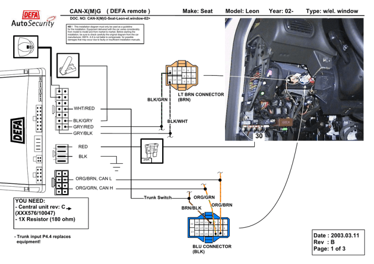 C A N -X (M )G ( D E F A M a k e : S e a t re m o te ) M o d e l: L e o n Y e a r: 0 2 - T y p e : w /e l. w in d o w D O C . N O : C A N -X (M )G -S e a t-L e o n -e l.w in d o w -0 2 > N B ! T h is in s f o r t h e in s t a lla fro m m o d e l to in s t a lla t io n , b e m a n u fa c tu re r. d a m a g e s th a t ta t io m s D m lla t io n d ia g r a m m u s t o n . E q u ip m e n t d e liv e r e o d e l a n d fr o m m a rk e t u r e t o c h e c k c a r e f u lly E F A A . S is n o t lia b le a y o c c u r d u e to fa u lt y n ly b e u s e d d w it h th e c to m a rk e t. B th e o r ig in a l to c o m p e n s o r in s u f fic ie a s a g u id e lin e a r v a r ie s c o n s id e r a b ly e fo r e s ta r tin g th e d ia g r a m fr o m th e c a r a te f o r p o s s ib le n t in s t a lla t io n m a n u a ls . 14 12 10 7 15 13 11 4 1 8 5 2 9 6 3 L T B R N (B R N ) B L K /G R N C O N N E C T O R W H T /R E D B L K /G R Y G R Y /R E D G R Y /B L K B L K /W H T 3 0 R E D B L K O R G /B R N , C A N O R G /G R N , C A N Y O - C (X - 1 U N E e n tr a X X 5 7 6 X R e s E D : l u n it r e v : C /1 0 0 4 7 ) is to r (1 8 0 o h m ) 2 5 A L H O R G /G R N T r u n k S w itc h B R N /B L K 22 O R G /B R N 19 16 13 10 7 4 1 20 17 14 11 8 5 2 21 18 15 12 9 6 3 23 - T r u n k in p u t P 4 .4 r e p la c e s e q u ip m e n t! B L U C O N N E C T O R (B L K ) D a te : 2 0 0 3 .0 3 .1 1 R e v : B P a g e : 1 o f 3 C A N -X (M )G ( D E F A re m o te ) M a k e : S e a t M o d e l: L e o n Y e a r: 0 2 - T y p e : w /e l. w in d o w D O C . N O : C A N -X (M )G -S e a t-L e o n -e l.w in d o w -0 2 > B L K C O N N E C T O R IN D R IV E R S D O O R 1 0 1 1 1 1 9 2 9 2 0 Y E L /G R N Y E L /B L U Y E L /B R N , U N L O C K 1 8 0 o h m W H T /B R N , L O C K F o P r - P - P r h a rd o g ra m R O G R O G w a r e r e v . J a n d la te r ! m in g : N R : 8 .2 . N R : 1 5 .1 . D a te : 2 0 0 3 .0 3 .1 1 R e v : B P a g e : 2 o f 3 C A N -X (M )G ( D E F A re m o te ) M a k e : S e a t M o d e l: L e o n Y e a r: 0 2 - T y p e : w /e l. w in d o w D O C . N O : C A N -X (M )G -S e a t-L e o n -e l.w in d o w -0 2 > Pass w ires through the rubber grom m et. D a te : 2 0 0 3 .0 3 .1 1 R e v : B P a g e : 3 o f 3