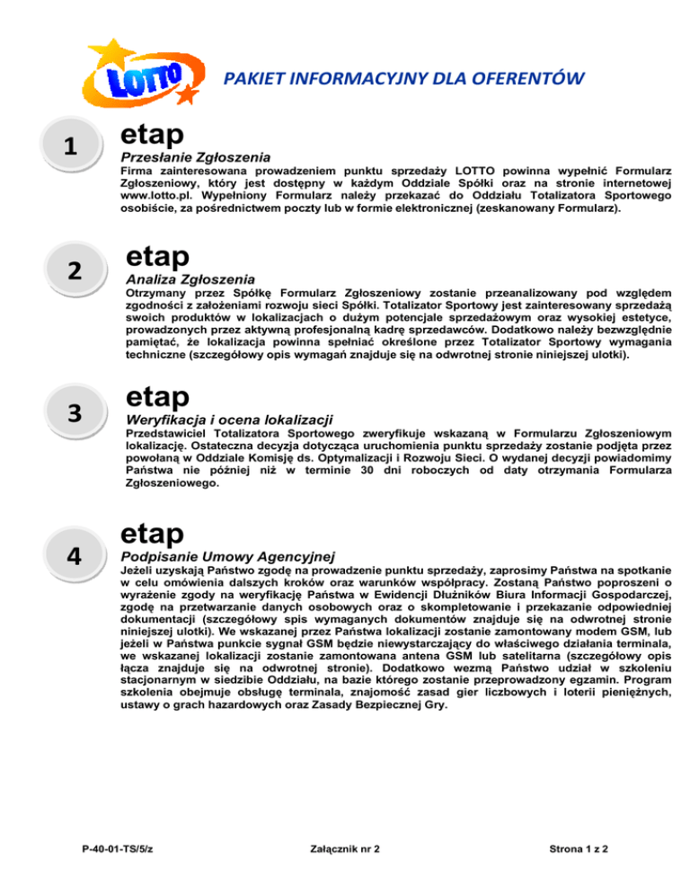 PAKIET INFORMACYJNY DLA OFERENTÓW etap 1 Przesłanie Zgłoszenia Firma zainteresowana prowadzeniem punktu sprzedaży LOTTO powinna wypełnić Formularz Zgłoszeniowy, który jest dostępny w każdym Oddziale Spółki oraz na stronie internetowej www.lotto.pl. Wypełniony Formularz należy przekazać do Oddziału Totalizatora Sportowego osobiście, za pośrednictwem poczty lub w formie elektronicznej (zeskanowany Formularz). 2 etap Analiza Zgłoszenia Otrzymany przez Spółkę Formularz Zgłoszeniowy zostanie przeanalizowany pod względem zgodności z założeniami rozwoju sieci Spółki. Totalizator Sportowy jest zainteresowany sprzedażą swoich produktów w lokalizacjach o dużym potencjale sprzedażowym oraz wysokiej estetyce, prowadzonych przez aktywną profesjonalną kadrę sprzedawców. Dodatkowo należy bezwzględnie pamiętać, że lokalizacja powinna spełniać określone przez Totalizator Sportowy wymagania techniczne (szczegółowy opis wymagań znajduje się na odwrotnej stronie niniejszej ulotki). 3 etap Weryfikacja i ocena lokalizacji Przedstawiciel Totalizatora Sportowego zweryfikuje wskazaną w Formularzu Zgłoszeniowym lokalizację. Ostateczna decyzja dotycząca uruchomienia punktu sprzedaży zostanie podjęta przez powołaną w Oddziale Komisję ds. Optymalizacji i Rozwoju Sieci. O wydanej decyzji powiadomimy Państwa nie później niż w terminie 30 dni roboczych od daty otrzymania Formularza Zgłoszeniowego. 4 etap Podpisanie Umowy Agencyjnej Jeżeli uzyskają Państwo zgodę na prowadzenie punktu sprzedaży, zaprosimy Państwa na spotkanie w celu omówienia dalszych kroków oraz warunków współpracy. Zostaną Państwo poproszeni o wyrażenie zgody na weryfikację Państwa w Ewidencji Dłużników Biura Informacji Gospodarczej, zgodę na przetwarzanie danych osobowych oraz o skompletowanie i przekazanie odpowiedniej dokumentacji (szczegółowy spis wymaganych dokumentów znajduje się na odwrotnej stronie niniejszej ulotki). We wskazanej przez Państwa lokalizacji zostanie zamontowany modem GSM, lub jeżeli w Państwa punkcie sygnał GSM będzie niewystarczający do właściwego działania terminala, we wskazanej lokalizacji zostanie zamontowana antena GSM lub satelitarna (szczegółowy opis łącza znajduje się na odwrotnej stronie). Dodatkowo wezmą Państwo udział w szkoleniu stacjonarnym w siedzibie Oddziału, na bazie którego zostanie przeprowadzony egzamin. Program szkolenia obejmuje obsługę terminala, znajomość zasad gier liczbowych i loterii pieniężnych, ustawy o grach hazardowych oraz Zasady Bezpiecznej Gry. P-40-01-TS/5/z Załącznik nr 2 Strona 1 z 2 PAKIET INFORMACYJNY DLA OFERENTÓW 5 6 etap Uruchomienie Punktu Sprzedaży Po zdaniu egzaminu oraz podpisaniu w siedzibie Oddziału umowy, otrzymają Państwo nieodpłatnie niezbędne materiały eksploatacyjne i wizualizacyjne. Następnie Państwa lokal zostanie przygotowany pod względem komunikacyjnym i wizualizacyjnym oraz zostanie zamontowany terminal, co umożliwi rozpoczęcie sprzedaży. wymagane dokumenty Podpisanie umowy na prowadzenie punktu sprzedaży ze Spółką Totalizator Sportowy, wymaga uprzednio złożenia następujących dokumentów: Kserokopia aktualnego odpisu z Krajowego Rejestru Sądowego (KRS) lub wpisu do ewidencji działalności gospodarczej rozszerzonego o aktualny nr PKD lub Wyciąg elektroniczny z CEIDG Centralnej Ewidencji i Informacji o Działalności Gospodarczej rozszerzony o aktualny nr Polskiej Klasyfikacji Działalności (PKD 92.00.Z lub 46.18. lub 46.19). Oświadczenie o spełnieniu wymogów art. 28 ust 3 Ustawy o grach hazardowych z dnia 19.11.2009 r. Kserokopia zaświadczenia o numerze identyfikacyjnym REGON. Kserokopia decyzji w sprawie nadania NIP. Zaświadczenie o niekaralności oferenta oraz osób obsługujących terminal. Zabezpieczenie finansowe zgodne z Procedurą zabezpieczeń funkcjonującą w Spółce Totalizator Sportowy w uzgodnionej z TS formie. Kserokopia tytułu prawnego do lokalu, w którym będzie usytuowana kolektura (akt notarialny, umowa najmu, dzierżawy). Zgoda właściciela budynku/administratora na montaż anteny GSM lub satelitarnej. Zgoda właściciela budynku/administratora na montaż zewnętrznej reklamy LOTTO. Dokumenty należy składać do Oddziału po otrzymaniu od Spółki formalnej zgody na uruchomienie punktu sprzedaży. Pozostałe wymagane dokumenty: Upoważnienie do weryfikacji w Ewidencji Dłużników. Zgoda na przetwarzanie danych osobowych Agenta oraz osób dedykowanych do obsługi Klientów. 7 wymagania techniczne Lokalizacja przeznaczona do prowadzenia punktu sprzedaży, powinna obowiązkowo spełniać następujące wymagania techniczne: P-40-01-TS/5/z Otwarta przestrzeń wokół terminala dla właściwej jego wentylacji oraz wymiany papieru w drukarce powinna wynosić około szer. 45x gł. 70 x wys. 60 cm przy założeniu, że drukarka umieszczona jest na półeczce nad terminalem. Jeśli drukarka leży obok terminala szerokość powinna być odpowiednio większa o szerokość drukarki – szer. 15 cm x wys. 22,5 cm x dług. 34,5 cm. Miejsce na montaż modemu GSM w pomieszczeniu kolektury bądź zewnętrznej anteny GSM lub satelitarnej na dachu/ ścianie bocznej budynku. Niezależny obwód elektryczny dla zasilania terminala i współpracującego z nim modemu GSM lub współpracującego z nim radia i modemu VSAT zabezpieczone wyłącznikiem różnicowo-prądowym. Lokalizacja powinna posiadać wyodrębnione miejsce na kącik dla gracza. Załącznik nr 2 Strona 2 z 2