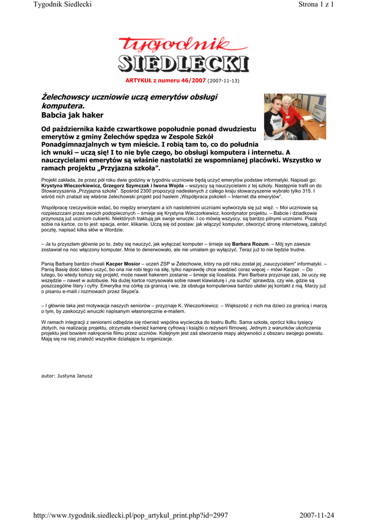 Tygodnik Siedlecki Strona 1 z 1 ARTYKUŁ z numeru 46/2007 (2007-11-13) Żelechowscy uczniowie uczą emerytów obsługi komputera. Babcia jak haker Od października każde czwartkowe popołudnie ponad dwudziestu emerytów z gminy Żelechów spędza w Zespole Szkół Ponadgimnazjalnych w tym mieście. I robią tam to, co do południa ich wnuki – uczą się! I to nie byle czego, bo obsługi komputera i internetu. A nauczycielami emerytów są właśnie nastolatki ze wspomnianej placówki. Wszystko w ramach projektu „Przyjazna szkoła”. Projekt zakłada, że przez pół roku dwie godziny w tygodniu uczniowie będą uczyć emerytów podstaw informatyki. Napisali go: Krystyna Wieczorkiewicz, Grzegorz Szymczak i Iwona Wojda – wszyscy są nauczycielami z tej szkoły. Następnie trafił on do Stowarzyszenia „Przyjazna szkoła”. Spośród 2300 propozycji nadesłanych z całego kraju stowarzyszenie wybrało tylko 315. I wśród nich znalazł się właśnie żelechowski projekt pod hasłem „Współpraca pokoleń – Internet dla emerytów”. Współpracę rzeczywiście widać, bo między emerytami a ich nastoletnimi uczniami wytworzyła się już więź. – Moi uczniowie są rozpieszczani przez swoich podopiecznych – śmieje się Krystyna Wieczorkiewicz, koordynator projektu. – Babcie i dziadkowie przynoszą już uczniom cukierki. Niektórych traktują jak swoje wnuczki. I co mówią wszyscy, są bardzo pilnymi uczniami. Piszą sobie na kartce, co to jest: spacja, enter, klikanie. Uczą się od postaw: jak włączyć komputer, otworzyć stronę internetową, założyć pocztę, napisać kilka słów w Wordzie. – Ja tu przyszłam głównie po to, żeby się nauczyć, jak wyłączać komputer – śmieje się Barbara Rozum. – Mój syn zawsze zostawiał na noc włączony komputer. Mnie to denerwowało, ale nie umiałam go wyłączyć. Teraz już to nie będzie trudne. Panią Barbarę bardzo chwali Kacper Mosior – uczeń ZSP w Żelechowie, który na pół roku został jej „nauczycielem" informatyki. – Panią Basię dość łatwo uczyć, bo ona nie robi tego na siłę, tylko naprawdę chce wiedzieć coraz więcej – mówi Kacper. – Do lutego, bo wtedy kończy się projekt, może nawet hakerem zostanie – śmieje się licealista. Pani Barbara przyznaje zaś, że uczy się wszędzie – nawet w autobusie. Na dużej kartce rozrysowała sobie nawet klawiaturę i „na sucho” sprawdza, czy wie, gdzie są poszczególne litery i cyfry. Emerytka ma córkę za granicą i wie, że obsługa komputerowa bardzo ułatwi jej kontakt z nią. Marzy już o pisaniu e-maili i rozmowach przez Skype'a. – I głównie taka jest motywacja naszych seniorów – przyznaje K. Wieczorkiewicz. – Większość z nich ma dzieci za granicą i marzą o tym, by zaskoczyć wnuczki napisanym własnoręcznie e-mailem. W ramach integracji z seniorami odbędzie się również wspólna wycieczka do teatru Buffo. Sama szkoła, oprócz kilku tysięcy złotych, na realizację projektu, otrzymała również kamerę cyfrową i książki o reżyserii filmowej. Jednym z warunków ukończenia projektu jest bowiem nakręcenie filmu przez uczniów. Kolejnym jest zaś stworzenie mapy aktywności z obszaru swojego powiatu. Mają się na niej znaleźć wszystkie działające tu organizacje. autor: Justyna Janusz http://www.tygodnik.siedlecki.pl/pop_artykul_print.php?id=2997 2007-11-24