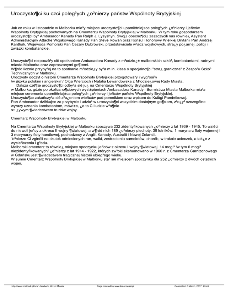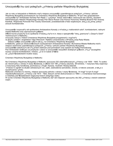 Uroczysto¶ci ku czci poleg³ych ¿o³nierzy pañstw Wspólnoty Brytyjskiej Jak co roku w listopadzie w Malborku mia³y miejsce uroczysto¶ci upamiêtniaj±ce poleg³ych ¿o³nierzy i jeñców Wspólnoty Brytyjskiej pochowanych na Cmentarzu Wspólnoty Brytyjskiej w Malborku. W tym roku gospodarzem uroczysto¶ci by³ Ambasador Kanady Pan Ralph J. Lysyshyn. Swoj± obecno¶ci± zaszczycili nas równie¿ Asystent Administracyjny Attache Wojskowego Kanady Pan Steve Rowan oraz Konsul Honorowy Wielkiej Brytanii Pan Andrzej Kanthak, Wojewoda Pomorski Pan Cezary D±browski, przedstawiciele w³adz wojskowych, stra¿y po¿arnej ,policji i zwi±zki kombatanckie. Uroczysto¶ci rozpoczê³y siê spotkaniem Ambasadora Kanady z m³odzie¿± malborskich szkó³, kombatantami, radnymi miasta Malborka oraz zaproszonymi go¶æmi. W¶ród licznie przyby³ej na to spotkanie m³odzie¿y by³a m.in. klasa o specjalno¶ci "stra¿ graniczna" z Zespo³u Szkó³ Technicznych w Malborku. Uroczysty odczyt o historii Cmentarza Wspólnoty Brytyjskiej przygotowa³y i wyg³osi³y /w jêzyku polskim i angielskim/ Olga Wiercioch i Natalia Lewandowska z M³odzie¿owej Rady Miasta. Dalsza czê¶æ uroczysto¶ci odby³a siê ju¿ na Cmentarzu Wspólnoty Brytyjskiej w Malborku, gdzie po okoliczno¶ciowych wyst±pieniach Ambasadora Kanady i Burmistrza Miasta Malborka mia³a miejsce ceremonia upamiêtniaj±ca poleg³ych ¿o³nierzy i jeñców pañstw Wspólnoty Brytyjskiej. Uroczysto¶æ zakoñczy³a siê z³o¿eniem wieñców pod pomnikiem oraz wpisem do Ksiêgi Pami±tkowej. Pan Ambasador dziêkuj±c za przybycie i udzia³ w uroczysto¶ci wszystkim dostojnym go¶ciom, z³o¿y³ szczególne wyrazy uznania kombatantom, mówi±c, ¿e to Ci ludzie w³a¶nie s± ¿ywym ¶wiadectwem trudów wojny. Cmentarz Wspólnoty Brytyjskiej w Malborku Na Cmentarzu Wspólnoty Brytyjskiej w Malborku spoczywa 232 zidentyfikowanych ¿o³nierzy z lat 1939 - 1945. To wziêci do niewoli jeñcy z okresu II wojny ¶wiatowej, a w¶ród nich 189 ¿o³nierzy piechoty, 39 lotników, 1 marynarz floty wojennej i 3 marynarzy floty handlowej, pochodz±cy z Anglii, Kanady, Australii i Nowej Zelandii. ¯o³nierze Ci zginêli na skutek odniesionych ran, walki, zestrzelenia samolotów, chorób, w trakcie ucieczek, a tak¿e z wycieñczenia i g³odu. Malborski cmentarz to równie¿ miejsce spoczynku jeñców z okresu I wojny ¶wiatowej. 14 mogi³ /w tym 6 mogi³ niezidentyfikowanych/ ¿o³nierzy z lat 1914 - 1922, których zw³oki ekshumowano w 1960 r. z Cmentarza Garnizonowego w Gdañsku jest ¶wiadectwem tragicznej historii ubieg³ego wieku. W sumie Cmentarz Wspólnoty Brytyjskiej w Malborku sta³ siê miejscem spoczynku dla 252 ¿o³nierzy z dwóch ostatnich wojen. http://www.malbork.pl/um/ - Malbork, Urz±d Miasta Page created by www.kraszewski.pl Generated: 6 March, 2017, 23:43