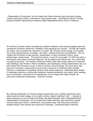 Pasterka w Radomskiej Katedrze - Odpowiadamy Chrystusowi, nie ma miejsca dla Ciebie wówczas, gdy odrzucamy zasady moralne dotyczące rodziny, małżeństwa i życia społecznego - mówił biskup Henryk Tomasik podczas Pasterki odprawianej w katedrze Opieki Najświętszej Maryi Panny w Radomiu. W homilii bp Tomasik mówił o przepięknych polskich kolędach, które pokazują głębię tajemnicy narodzenia Chrystusa. Mówił też o kolędach, które pokazują inny wymiar - "nie było dla miejsca dla Ciebie, choć zszedłeś jako zbawiciel na ziemię". Bp Tomasik zwrócił uwagę, że ta kolęda ma wymiar ponadczasowy, że podaje - jak mówił - niestety konkretną rzeczywistość. - Nie ma miejsca dla Chrystusa w wielu sercach, wspólnotach, w wielu wymiarach kultury, życia politycznego i społecznego - "Przyszedł do swoich, a swoi Go nie przyjęli". W 1978 roku jedno z niemieckich pism pisało o polskiej religijności. Na tle polskich gór widniał tytuł: Tam, gdzie Bóg ma jeszcze ojczyznę". Tak nazwano wówczas Polskę, kiedy świat został zaskoczony wyborem Ojca Świętego Jana Pawła II. Piękne określenie, ale niepokojące. Dzisiaj zastanawiamy się, czy jest miejsce dla Chrystusa w kraju, w którym nazwano ojczyzną Boga. Na nasze serca, gdy patrzymy na parafie i zastanawiamy się ile osób uczestniczy w niedzielnej Mszy świętej. Patrzymy z niepokojem na postawę młodych osób wobec katechezy, niedzielnej Mszy świętej. Z niepokojem patrzymy na dużą ilość związków niesakramentalnych oraz osoby, które uważają się za chrześcijan, a przecież to oni wyśpiewują: nie ma miejsca dla Ciebie Chryste, bo odrzucamy sakrament małżeństwa - mówił bp Tomasik. Bp radomski podkreślał, że Chrystus pragnie zgromadzić nas w wielkiej wspólnocie wiary. Jednocześnie zwrócił uwagę, że my często mówimy: jestem katolikiem "ale". - I właśnie to słowo pokazuje, że nie ma miejsca dla Boga, dla Jego Ewangelii, łaski i błogosławieństwa. Odpowiadamy Chrystusowi: nie ma miejsca dla Ciebie wówczas, gdy odrzucamy zasady moralne dotyczące rodziny, małżeństwa, życia społecznego. Gdy odrzucamy prawdę o świętości Boga, która również jest wyrażona w Dekalogu - powiedział biskup radomski. 1/2 Pasterka w Radomskiej Katedrze Na koniec bp Tomasik dziękował za Boże Narodzenie, za to, że Chrystus rodzi się w sercach otwartych, dobrych, wiernych, wrażliwych i konsekwentnych. W sercach, które chcą przyjąć Boga przychodzącego z miłości. Mówił, że trzeba prostoty świętych, aby dostrzec Boże Narodzenie w rzeczach najbardziej normalnych. Prosił także, aby Chrystus rodził się w naszych sercach przez wiarę i żeby to było czytelne w życiu. Przypomniał, że tym, którzy je przyjęli dało moc. 2/2