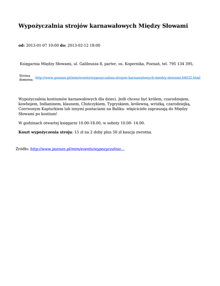 Wypożyczalnia strojów karnawałowych Między Słowami od: 2013-01-07 10:00 do: 2013-02-12 18:00 Księgarnia Między Słowami, ul. Galileusza 8, parter, os. Kopernika, Poznań, tel. 795 134 395, Strona http://www.poznan.pl/mim/events/wypozyczalnia-strojow-karnawalowych-miedzy-slowami,64032.html domowa: Wypożyczalnia kostiumów karnawałowych dla dzieci. Jeśli chcesz być królem, czarodziejem, kowbojem, Indianinem, klaunem, Chińczykiem, Tygryskiem, królewną, wróżką, czarodziejką, Czerwonym Kapturkiem lub innymi postaciami na Baliku- włąściciele zapraszają do Między Słowami po kostium! W godzinach otwartej księgarni 10.00-18.00, w soboty 10.00- 14.00. Koszt wypożyczenia stroju: 15 zł na 2 doby plus 50 zł kaucja zwrotna. Źródło: http://www.poznan.pl/mim/events/wypozyczalnia…