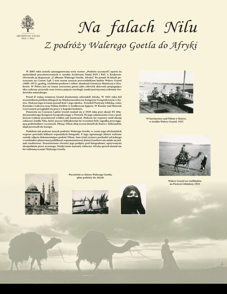 ARCHIWUM NAUKI PAN I PAU Na falach Nilu Z podróży Walerego Goetla do Afryki W 2005 roku została zainaugurowana seria wystaw „Podróże uczonych”, oparta na materiałach przechowywanych w zasobie Archiwum Nauki PAN i PAU w Krakowie. Otwierała ją ekspozycja „Z albumu Walerego Goetla. Afryka”. Po ponad 10 latach powracamy na Czarny Ląd. I tym razem naszym przewodnikiem będzie Walery Goetel (1889–1972), geolog, wieloletni profesor i rektor Akademii Górniczo-Hutniczej w Krakowie. W Polsce jest on znany szerszemu gronu jako człowiek aktywnie propagujący idee ochrony przyrody oraz twórca pojęcia sozologii, nauki poświęconej ochronie środowiska naturalnego. Przed II wojną światową Goetel dwukrotnie odwiedził Afrykę. W 1925 roku był uczestnikiem polskiej delegacji na Międzynarodowym Kongresie Geograficznym w Kairze. Podczas jego trwania poznał Kair i jego okolice. Zwiedził Pustynię Libijską, ruiny Karnaku i Luksoru oraz Dolinę Królów w środkowym Egipcie. W Kossier nad Morzem Czerwonym przyglądał się pracy w kopalni fosfatów. Ponownie na Czarnym Lądzie Goetel znalazł się w 1929 roku przy okazji XV Międzynarodowego Kongresu Geograficznego w Pretorii. Po jego zakończeniu wraz z prof. Jerzym Lothem przemierzył wzdłuż cały kontynent. Podczas tej wyprawy miał okazję zobaczyć źródła Nilu, które jeszcze kilkadziesiąt lat wcześniej były zagadką przyciągającą podróżników i uczonych. Płynąc Nilem obaj uczeni dotarli do Kairu i Aleksandrii, skąd powrócili do Europy. W kawiarence nad Nilem w Kairze, w środku Walery Goetel, 1925 Podobnie jak podczas innych podróży Walerego Goetla, w czasie jego afrykańskich wypraw powstało kilkaset wspaniałych fotografii. Z tego ogromnego zbioru wybrane zostały zdjęcia dokumentujące podróż Nilem. Sam tytuł wystawy pochodzi od jednego z rozdziałów planowanej publikacji wspomnieniowej, której Goetlowi nie udało się jednak zrealizować. Pozostawiono również jego podpisy pod fotografiami, opisywanymi skrupulatnie przez uczonego. Dzięki temu możemy zobaczyć Afrykę sprzed niemal stu lat widzianą oczami Walerego Goetla. Pocztówki ze zbioru Walerego Goetla, plon podróży do Afryki Walery Goetel na wielbłądzie na Pustyni Libijskiej, 1925