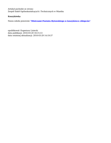 Artykuł pochodzi ze strony: Zespół Szkół Ogólnokształcących i Technicznych w Miastku Koszykówka Nasza szkoła ponownie "Mistrzami Powiatu Bytowskiego w koszykówce chłopców" opublikował: Eugeniusz Lisiecki data publikacji: 2016-03-20 18:15:13 data ostatniej aktualizacji: 2016-03-29 14:19:37