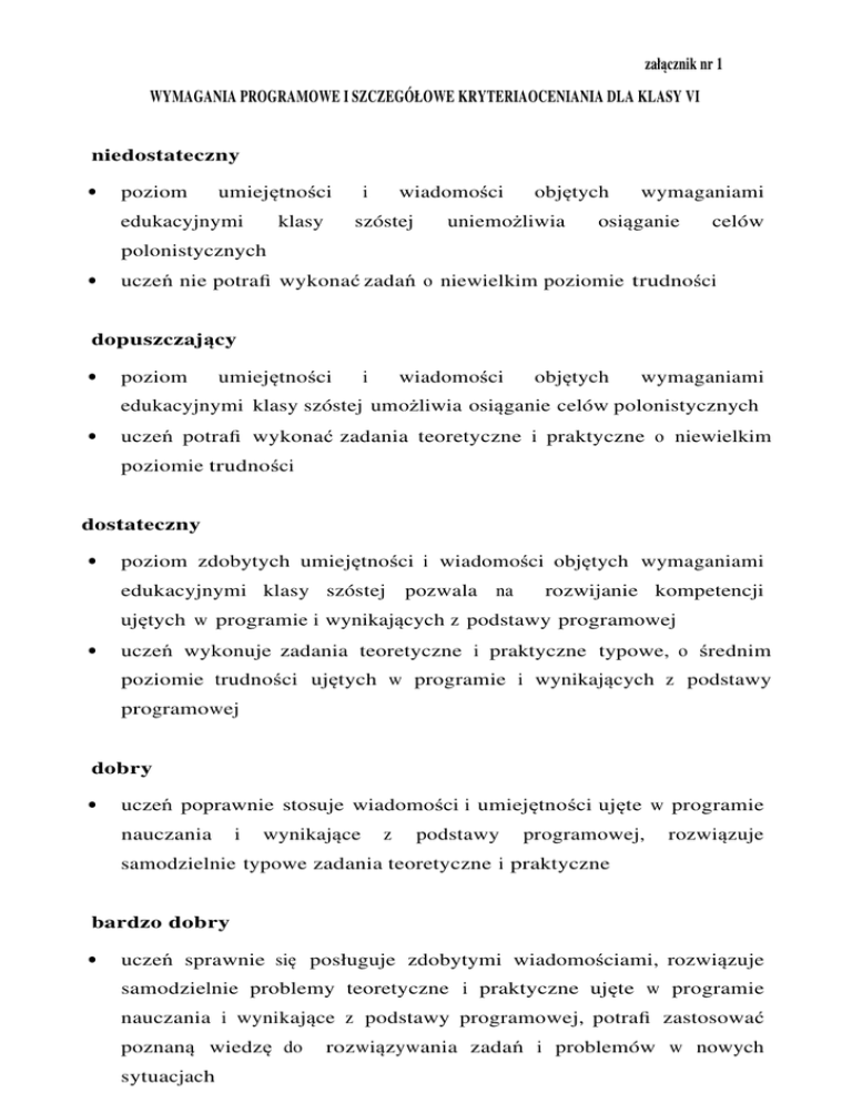 załącznik nr 1 WYMAGANIA PROGRAMOWE I SZCZEGÓŁOWE KRYTERIAOCENIANIA DLA KLASY VI niedostateczny • poziom umiejętności edukacyjnymi klasy i wiadomości szóstej objętych uniemożliwia wymaganiami osiąganie celów polonistycznych • uczeń nie potrafi wykonać zadań o niewielkim poziomie trudności dopuszczający • poziom umiejętności i wiadomości objętych wymaganiami edukacyjnymi klasy szóstej umożliwia osiąganie celów polonistycznych • uczeń potrafi wykonać zadania teoretyczne i praktyczne o niewielkim poziomie trudności dostateczny • poziom zdobytych umiejętności i wiadomości objętych wymaganiami edukacyjnymi klasy szóstej pozwala na rozwijanie kompetencji ujętych w programie i wynikających z podstawy programowej • uczeń wykonuje zadania teoretyczne i praktyczne typowe, o średnim poziomie trudności ujętych w programie i wynikających z podstawy programowej dobry • uczeń poprawnie stosuje wiadomości i umiejętności ujęte w programie nauczania i wynikające z podstawy programowej, rozwiązuje samodzielnie typowe zadania teoretyczne i praktyczne bardzo dobry • uczeń sprawnie się posługuje zdobytymi wiadomościami, rozwiązuje samodzielnie problemy teoretyczne i praktyczne ujęte w programie nauczania i wynikające z podstawy programowej, potrafi zastosować poznaną wiedzę do sytuacjach rozwiązywania zadań i problemów w nowych celujący • uczeń biegle się posługuje zdobytymi wiadomościami i umiejętnościami w rozwiązywaniu problemów teoretycznych i praktycznych objętych programem nauczania i wynikających z podstawy programowej, proponuje rozwiązania nietypowe; jest twórczy, rozwija własne uzdolnienia SZCZEGÓŁOWE KRYTERIA OCENIANIA Ocenę niedostateczną otrzymuje uczeń, który nie spełni wymagań kryterialnych na ocenę dopuszczającą. Ocenę dopuszczającą otrzymuje uczeń, który: Odbiór wypowiedzi i wykorzystywanie zawartych w nich informacji SŁUCHANIE • skupia uwagę na prostych wypowiedziach innych osób • reaguje na wypowiedzi innych werbalnie i niewerbalnie (mimiką, gestem, postawą) • rozumie polecenia nauczyciela, wypowiedzi innych uczniów • identyfikuje nadawcę i odbiorcę wypowiedzi w prostych tekstach literackich oraz typowych sytuacjach znanych uczniowi z doświadczenia i obserwacji • rozpoznaje proste intencje nadawcy, np. zaproszenie, gratulacje, życzenia, pytanie, prośbę, odmowę, przeprosiny, zawiadomienie, ogłoszenie, instrukcję, w tym przepis • wskazuje najważniejsze informacje w wysłuchanym tekście, zwłaszcza w jego warstwie dosłownej, i uzupełnia różne typy notatek graficznych o te informacje • rozumie ogólny sens słuchanych utworów • rozpoznaje nastrój słuchanych komunikatów • dostrzega etyczny wymiar języka (prawdę, kłamstwo, przemilczanie informacji, brutalizację wypowiedzi) • rozpoznaje manipulację CZYTANIE • identyfikuje nadawcę i odbiorcę wypowiedzi w prostych tekstach literackich oraz typowych sytuacjach znanych uczniowi z doświadczenia i obserwacji (autor, narrator, czytelnik, słuchacz) • rozpoznaje proste intencje nadawcy, np. zaproszenie, gratulacje, pytanie, prośbę, odmowę, przeprosiny, życzenia, zawiadomienie, instrukcję, ogłoszenie, w tym przepis • wskazuje najważniejsze informacje w przeczytanym tekście, zwłaszcza w dosłownej warstwie tekstu i wyrażone wprost, i uzupełnia na podstawie czytanego tekstu różne typy notatek graficznych o te informacje • wskazuje części składowe wypowiedzi (tytuł, wstęp, rozwinięcie, zakończenie) • rozumie dosłowne znaczenie wyrazów w wypowiedzi • rozumie ogólny sens czytanych utworów • określa nastrój wypowiedzi • wyciąga wnioski z przesłanek zawartych w tekście, w tym rozpoznaje w nim prawdę lub fałsz • rozpoznaje manipulację • rozumie mechanizmy oddziaływania reklam na odbiorcę • stara się czytać teksty płynnie i poprawnie pod względem artykulacyjnym, wyróżnia pauzą koniec wypowiedzenia • rozpoznaje podstawowe funkcje składniowe wyrazów użytych w wypowiedziach (orzeczenie, podmiot) • rozpoznaje w wypowiedziach podstawowe części mowy (rzeczownik, czasownik, przymiotnik, przysłówek, liczebnik, spójnik) • rozpoznaje zdanie pojedyncze i zdanie złożone • wskazuje cudzysłów zaimek, przyimek, DOCIERANIE DO INFORMACJI • sprawdza pisownię wyrazów w słowniku ortograficznym • wyszukuje synonimy w słowniku wyrazów bliskoznacznych • wybiera proste informacje z hasła encyklopedycznego, poradnika, leksykonu, czasopisma, podanej strony internetowej Analiza i interpretacja tekstów kultury • mówi o swoich reakcjach czytelniczych • porównuje swoje wrażenia związane z odbiorem innych tekstów • wyraża swój stosunek do postaci • odróżnia fikcję od rzeczywistości • rozpoznaje typowe elementy fikcji, charakterystyczne dla poznanych gatunków • odróżnia elementy fantastyczne od realistycznych w baśniach, legendach, mitach, bajkach, opowiadaniach, powieściach • odróżnia autora od osoby mówiącej w tekście literackim • charakteryzuje osobę mówiącą na podstawie jej wypowiedzi • określa najważniejsze elementy świata przedstawionego w utworze epickim, takie jak: czas, miejsce, bohaterowie, zdarzenia, omawia akcję • wyodrębnia w utworze epickim wydarzenia układające się w wątki • rozpoznaje baśń, legendę, bajkę, mit, powieść, opowiadanie, komiks, fraszkę, wiersz, przysłowie • rozpoznaje wers, strofę, rym, refren, rytm • odróżnia wiersz rymowany od nierymowanego (białego) • rozpoznaje przenośnię, porównane, epitet, wyraz dźwiękonaśladowczy, uosobienie, ożywienie • wyodrębnia film, program informacyjny, program rozrywkowy, spektakl teatralny spośród innych przekazów i tekstów kultury oraz potrafi nazwać ich tworzywo (ruchome dźwiękowa) • odczytuje informacje z plakatu teatralnego obrazy, warstwa Tworzenie wypowiedzi MÓWIENIE • nawiązuje i p