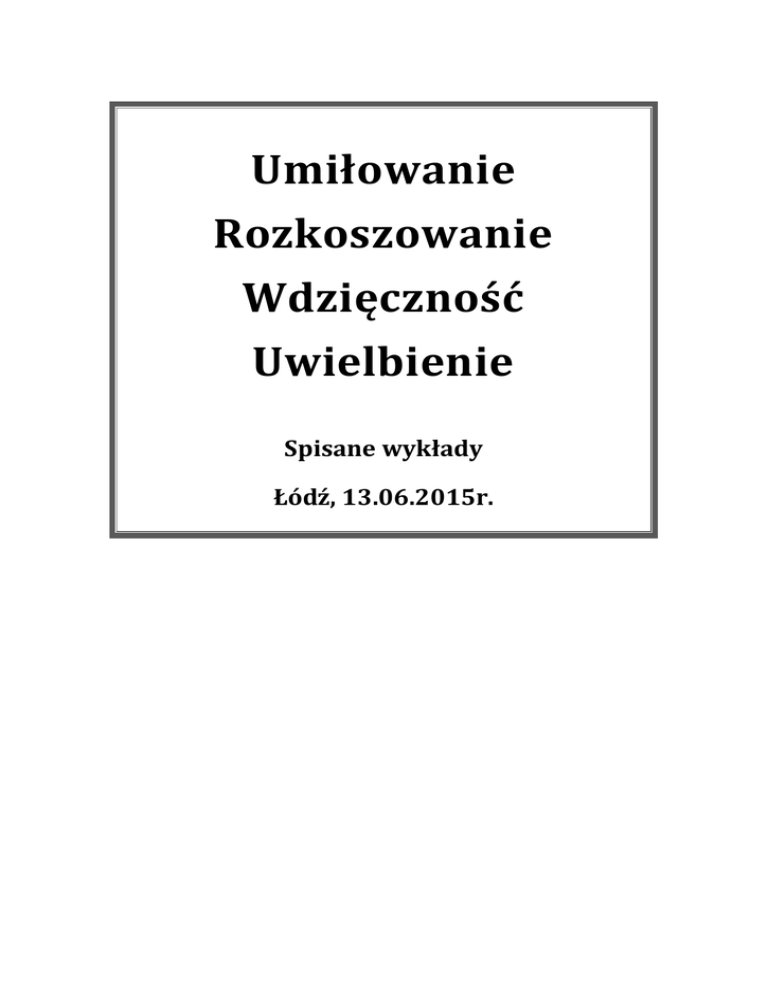 Umiłowanie Rozkoszowanie Wdzięczność Uwielbienie Spisane wykłady Łódź, 13.06.2015r. Umiłowanie Rozkoszowanie Wdzięczność Uwielbienie Część 1 Dzisiejsze nasze spotkanie, tak jak wcześniejsze spotkania, one coraz głębiej ukazują nam sens naszego człowieczeństwa. Właściwie ukazują nam naszą naturę. Ciekawą sytuacją jest to, że ludzie mówią często, że naturą człowieka jest agresja, przemoc, że życie takie zgodnie z Bogiem nie jest jego naturą. Przecież to jest niemądre. Dlaczego? Większość ludzi [99%] żyje głównie w stanie praw tego świata, dlatego że wydaje im się, że jest to ich właściwa natura, a natura Boża to jest natura jakby nie do końca związana z naturą człowieka. To nie jest prawda, ponieważ gdyby tak było, że natura Boża nie jest jego naturą, to by nie miał potrzeby wewnętrznej poszukiwać człowieka opanowanego, łagodnego, wiernego, dobrego, uprzejmego, cierpliwego, niosącego pokój, radość i miłość. Poszukuje takich ludzi, bo to jest jego wewnętrzna natura, to jest wewnętrzna natura człowieka poszukiwania człowieka właśnie takiego. Tu się odzwierciedla ta wewnętrzna prawdziwa natura człowieka. Dziwną sytuacją jest to, że mimo że ta natura powoduje w nich, krzyczy w nich, woła, aby szukać takiego człowieka, to dla nich jest ona tak obca, tak nieznana, tak o niej nie wiedzą, że widzą tylko tą swoją naturę gwałtowną, naturę agresywną, naturę egoistyczną, czyli ulegają jej, a nie dostrzegają tego, co tak naprawdę jest przyczyną tego wszystkiego. Dlaczego? Proszę zauważyć powiem tutaj bardzo prostą rzecz, o której wszyscy wiedzą. Bóg zakrył przed nami wszystko, zakrył przed nami drugiego człowieka, jego myśli, jego emocje, jego uczucia, jego pragnienia, jego intencje, zakrył. Możemy tylko zobaczyć je przez to, co on robi. Zakrył przed nami właśnie te sprawy, zakrył przed nami przeszłość, zakrył przed nami przyszłość, zakrył przed nami tajemnice nieba, zakrył przed nami wiele, wiele spraw, zakrył przed nami te wszystkie rzeczy. Jedną rzecz otworzył całkowicie, ona jest otwarta na oścież, bardzo mocno i właściwie wszystko o niej wiemy, jeśli tylko chcemy i nam niebo w tym pomaga. Co to jest za miejsce? To jest sam człowiek. O człowieku - o nas samych, wiemy jakie mamy myśli, jakie mamy uczucia, jakie mamy emocje, jakie mamy intencje, jakie mamy pragnienia, to wiemy. Tylko człowiek nie chce nic z tym zrobić, nie chce tego zmienić. Bóg ukazał człowiekowi jego samego, nie zakrył samego człowieka przed nim, otworzył. Dał mu świadomość jego myśli, dał mu świadomość jego uczuć, dał mu świadomości jego emocji, dał mu świadomości jego pragnień, dał mu świadomość jego intencji i dał mu świadomość zmiany tego wszystkiego, jeśli tylko będzie tego chciał. Dał mu tą świadomość. Więc wszystko zakrył, a odkrył człowieka. A człowiek, z Strona 2 uporem maniaka, nieustannie chce poznać to co zostało przed nim zakryte, a ucieka przed tym, co zostało przed nim odkryte. Jeśli Bóg zakrył wszystko przed nim, a odkrył tylko człowieka i nie w domysłach odkrył, ale w Łódź, 13.06.2015 r. pełnym poznaniu. Ponieważ my nie domyślamy się jakie mamy: myśli, emocje, intencje, nie domyślamy się jakie mamy pragnienia, czy wewnętrzny stan rzeczywisty. Nie domyślamy się, my po prostu to znamy z pierwszej ręki, my wiemy. My możemy się domyślać jakie emocje i myśli ma inny człowiek, jakie ma uczucia i pragnienia inny człowiek, możemy się tego domyślać, nie jesteśmy tego pewni nigdy, jakie one tam naprawdę są. Ale jeśli chodzi o nas jesteśmy pewni, ponieważ to są nasze myśli i one są przed nami odkryte, one przed nami są jawne, my jesteśmy ich całkowicie świadomi i wiemy jakie one są, kiedy się pojawiają lub kiedy nie, wiemy o czym myślimy. Tylko człowiek je ignoruje, ukrywa. Czyli Bóg zakrył przed człowiekiem wszystko, dlatego aby człowiek tam nie szukał, a odkrył człowieka przed samym człowiekiem, aby tutaj szukał. I niebo jest z nim w tym poszukiwaniu. I mówi św. Paweł o tym, że niebo jest z nim: Duch Święty poznaje głębokość człowieka i głębokość Boga. Więc gdy człowiek poszukuje, poznaje siebie do głębi, to Bóg jest z nim. Duch Święty daje mu poznanie w pełni jego myśli, jego uczuć, jego intencji, jego pragnień. I dalej zauważamy jedną bardzo ważną ewangeliczną prawdę. Jezus Chrystus mówi: kto pozna siebie, ten pozna Ojca. Więc dlatego Bóg zakrył przed nami wszystko co jest dookoła, bo to nas nie prowadzi bezpośrednio do Boga. Do Boga nas prowadzi to, że kierujemy się do własnego wnętrza, abyśmy się nauczyli widzieć to, co zewnętrzne. Kiedy się nauczymy widzieć to, co zewnętrzne, to sam Bóg w nas istnieje, bo to Duch Święty uczy nas widzenia tego co zewnętrzne i widzimy naturę serca człowieka, jego myśli, jego uczucia, widzimy tajemnicę świata, poznajemy wszelkie tajemnice, ponieważ Bóg sam w nas je poznaje. Dlatego jest powiedziane: kto pozna siebie, to pozna Ojca. I proszę zauważyć, zauważyliście zapewne w naszych poprzednich spotkaniach, medytacja, praktyka ukazała poznanie głębi owoców Ducha Świętego. Ludzie w początkowej postawie, fazie wymagania od siebie, oni starają się zapanować nad swoim wnętrzem całą swoją naturą wewnętrzną, tą którą Bóg przed nimi otworzył, nad swoimi myślami, nad swoją psychiką, nad swoimi emocjami, swoimi pragnieniami, intencjami i wszystkimi innymi przestrzeniami związanymi z różnymi sytuacjami dotyczącymi jego samego czy świata. Wytwarzając w sobie owoce Ducha Świętego, zmuszając siebie albo wymagając od siebie owoców Ducha Świętego, czyli opanowania, łagodności, wierności, dobroci, uprzejmości, cierpliwości, pokoju, radości i miłości, wymagając od siebie. W początkowej fazie jest to ogromny wysiłek, który angażuje naszą świa