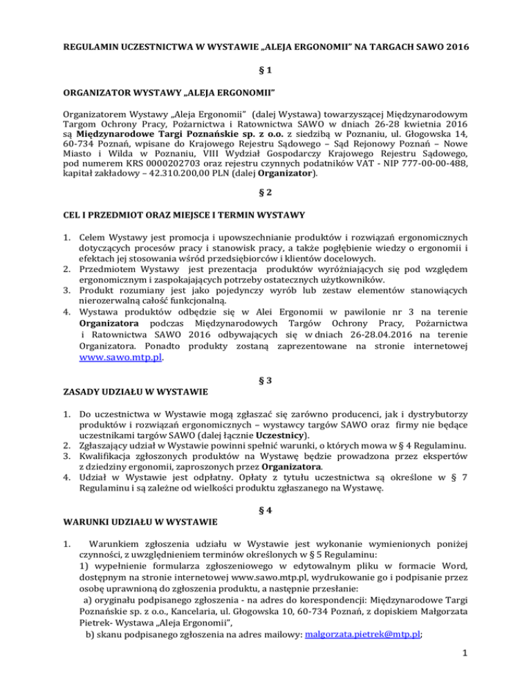 REGULAMIN UCZESTNICTWA W WYSTAWIE „ALEJA ERGONOMII” NA TARGACH SAWO 2016 §1 ORGANIZATOR WYSTAWY „ALEJA ERGONOMII” Organizatorem Wystawy „Aleja Ergonomii” (dalej Wystawa) towarzyszącej Międzynarodowym Targom Ochrony Pracy, Pożarnictwa i Ratownictwa SAWO w dniach 26-28 kwietnia 2016 są Międzynarodowe Targi Poznańskie sp. z o.o. z siedzibą w Poznaniu, ul. Głogowska 14, 60-734 Poznań, wpisane do Krajowego Rejestru Sądowego – Sąd Rejonowy Poznań – Nowe Miasto i Wilda w Poznaniu, VIII Wydział Gospodarczy Krajowego Rejestru Sądowego, pod numerem KRS 0000202703 oraz rejestru czynnych podatników VAT - NIP 777-00-00-488, kapitał zakładowy – 42.310.200,00 PLN (dalej Organizator). §2 CEL I PRZEDMIOT ORAZ MIEJSCE I TERMIN WYSTAWY 1. Celem Wystawy jest promocja i upowszechnianie produktów i rozwiązań ergonomicznych dotyczących procesów pracy i stanowisk pracy, a także pogłębienie wiedzy o ergonomii i efektach jej stosowania wśród przedsiębiorców i klientów docelowych. 2. Przedmiotem Wystawy jest prezentacja produktów wyróżniających się pod względem ergonomicznym i zaspokajających potrzeby ostatecznych użytkowników. 3. Produkt rozumiany jest jako pojedynczy wyrób lub zestaw elementów stanowiących nierozerwalną całość funkcjonalną. 4. Wystawa produktów odbędzie się w Alei Ergonomii w pawilonie nr 3 na terenie Organizatora podczas Międzynarodowych Targów Ochrony Pracy, Pożarnictwa i Ratownictwa SAWO 2016 odbywających się w dniach 26-28.04.2016 na terenie Organizatora. Ponadto produkty zostaną zaprezentowane na stronie internetowej www.sawo.mtp.pl. §3 ZASADY UDZIAŁU W WYSTAWIE 1. Do uczestnictwa w Wystawie mogą zgłaszać się zarówno producenci, jak i dystrybutorzy produktów i rozwiązań ergonomicznych – wystawcy targów SAWO oraz firmy nie będące uczestnikami targów SAWO (dalej łącznie Uczestnicy). 2. Zgłaszający udział w Wystawie powinni spełnić warunki, o których mowa w § 4 Regulaminu. 3. Kwalifikacja zgłoszonych produktów na Wystawę będzie prowadzona przez ekspertów z dziedziny ergonomii, zaproszonych przez Organizatora. 4. Udział w Wystawie jest odpłatny. Opłaty z tytułu uczestnictwa są określone w § 7 Regulaminu i są zależne od wielkości produktu zgłaszanego na Wystawę. §4 WARUNKI UDZIAŁU W WYSTAWIE 1. Warunkiem zgłoszenia udziału w Wystawie jest wykonanie wymienionych poniżej czynności, z uwzględnieniem terminów określonych w § 5 Regulaminu: 1) wypełnienie formularza zgłoszeniowego w edytowalnym pliku w formacie Word, dostępnym na stronie internetowej www.sawo.mtp.pl, wydrukowanie go i podpisanie przez osobę uprawnioną do zgłoszenia produktu, a następnie przesłanie: a) oryginału podpisanego zgłoszenia - na adres do korespondencji: Międzynarodowe Targi Poznańskie sp. z o.o., Kancelaria, ul. Głogowska 10, 60-734 Poznań, z dopiskiem Małgorzata Pietrek- Wystawa „Aleja Ergonomii”, b) skanu podpisanego zgłoszenia na adres mailowy: [email protected]; 1 2) przesłanie na adres mailowy [email protected] zdjęcia produktu zgłaszanego na Wystawę ; format zapisu: typ pliku – jpg, tiff lub psd w rozmiarze do 2 MB. 2. W przypadku zakwalifikowania produktu na Wystawę Uczestnik zobowiązany jest do : 1) wyboru pakietu uczestnictwa, o którym mowa w § 7 i dokonanie opłaty z tytułu udziału w Wystawie na podstawie przesłanej przez Organizatora faktury; należność należy wpłacić na rachunek bankowy Organizatora w terminie wskazanym na fakturze; wymagane jest przesłanie pod adres e-mail: [email protected] potwierdzenia wpłaty; 2) dostarczenia produktu na swój koszt zgodnie z terminami wymienionymi w § 7 Regulaminu; w przypadku zakwalifikowania na Wystawę produktu w postaci usługi lub produktu wielkogabarytowego Uczestnik dostarczy planszę z opisem słownograficznym produktu o wymiarach 2m x 1,5m. 3. Uczestnik może zgłosić dowolną liczbę produktów, przy czym każdy produkt wymaga osobnego zgłoszenia, a w przypadku zakwalifikowania na Wystawę, uiszczenia opłaty określonej w § 7. §5 PRZYGOTOWANIE WYSTAWY ETAP I 1. Do dnia 15.02.2016 należy dokonać zgłoszenia udziału i produktu / -ów wraz z przesłaniem zdjęcia / zdjęć na adres mailowy,o którym mowa w § 4. ust. 1 pkt.1 b). 2. Do dnia 10.03.2016 zostanie przyprowadzona kwalifikacja produktów na Wystawę, pod warunkiem otrzymania przez Organizatora oryginału zgłoszenia na adres do korespondencji, o którym mowa w § 4. ust. 1 pkt.1 a). 3. Wyniki przeprowadzonej kwalifikacji produktów na Wystawę zostaną przesłane Uczestnikowi przez Organizatora pocztą elektroniczną na podany w formularzu zgłoszeniowym adres mailowy do dnia 11.03.2016. ETAP II 1.Uczestnik, którego produkt/-ty zostały zakwalifikowane na Wystawę, jest zobowiązany do dokonania opłaty pakietu odpowiadającego wielkości produktu, zgodnie z § 7 Regulaminu, w terminie wskazanym na fakturze otrzymanej od Organizatora. 2. W dniach 23-25.04.2016 należy dostarczyć we własnym zakresie i na własny koszt produkt/ -ty zakwalifikowane na Wystawę , na adres : Międzynarodowe Targi Poznańskie sp. z o.o. Ul. Głogowska 14 60-734 Poznań Magazyn w paw. 12 z dopiskiem: Aleja Ergonomii – SAWO 2016 3. Umieszczenia produktów w miejscu Wystawy „Aleja Ergonomii” (pawilon nr 3) dokonuje Organizator. 4. Jeżeli jest wymagany montaż produktu wykonywany przez Uczestnika, to jest on możliwy w dniu 25.04.2016 w godzinach od 8:00 do 21:30. §6 PRZEBIEG WYSTAWY I JEJ ZAKOŃCZENIE 1. Produkty zakwalifikowane na Wystawę i dostarczone przez Uczestników zostaną zaprezentowane w Alei Ergonomii w pawilonie nr 3 na terenie Organizatora podczas targów SAWO 2016 odbywających się w dniach 26-28.04.2016 oraz na stronie internetowej www.sawo.mtp.pl. 2 2. Po zakończeniu Wystawy Uczestnik jest zobowiązany do odbioru we własnym zakresie i na własny koszt, w terminie do 5.05.2016, z Magazynu MTP w paw.12 na terenie Organizatora, prod