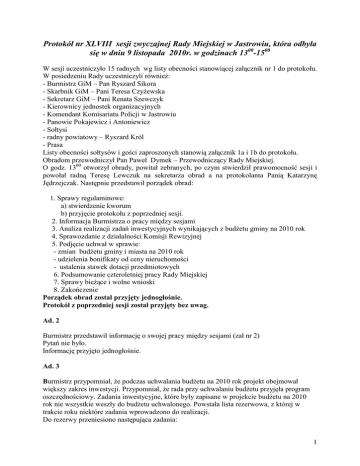 Protokół nr XLVIII sesji zwyczajnej Rady Miejskiej w Jastrowiu, która odbyła się w dniu 9 listopada 2010r. w godzinach 1300-1500 W sesji uczestniczyło 15 radnych wg listy obecności stanowiącej załącznik nr 1 do protokołu. W posiedzeniu Rady uczestniczyli równieŜ: - Burmistrz GiM – Pan Ryszard Sikora - Skarbnik GiM – Pani Teresa CzyŜewska - Sekretarz GiM – Pani Renata Szewczyk - Kierownicy jednostek organizacyjnych - Komendant Komisariatu Policji w Jastrowiu - Panowie Pokajewicz i Antoniewicz - Sołtysi - radny powiatowy – Ryszard Król - Prasa Listy obecności sołtysów i gości zaproszonych stanowią załącznik 1a i 1b do protokołu. Obradom przewodniczył Pan Paweł Dymek – Przewodniczący Rady Miejskiej. O godz. 1300 otworzył obrady, powitał zebranych, po czym stwierdził prawomocność sesji i powołał radną Teresę Lewczuk na sekretarza obrad a na protokolanta Panią Katarzynę Jędrzejczak. Następnie przedstawił porządek obrad: 1. Sprawy regulaminowe: a) stwierdzenie kworum b) przyjęcie protokołu z poprzedniej sesji. 2. Informacja Burmistrza o pracy między sesjami 3. Analiza realizacji zadań inwestycyjnych wynikających z budŜetu gminy na 2010 rok 4. Sprawozdanie z działalności Komisji Rewizyjnej 5. Podjęcie uchwał w sprawie: - zmian budŜetu gminy i miasta na 2010 rok - udzielenia bonifikaty od ceny nieruchomości - ustalenia stawek dotacji przedmiotowych 6. Podsumowanie czteroletniej pracy Rady Miejskiej 7. Sprawy bieŜące i wolne wnioski 8. Zakończenie Porządek obrad został przyjęty jednogłośnie. Protokół z poprzedniej sesji został przyjęty bez uwag. Ad. 2 Burmistrz przedstawił informację o swojej pracy między sesjami (zał nr 2) Pytań nie było. Informację przyjęto jednogłośnie. Ad. 3 Burmistrz przypomniał, Ŝe podczas uchwalania budŜetu na 2010 rok projekt obejmował większy zakres inwestycji. Przypomniał, Ŝe rada przy uchwalaniu budŜetu przyjęła program oszczędnościowy. Zadania inwestycyjne, które były zapisane w projekcie budŜetu na 2010 rok nie wszystkie weszły do budŜetu uchwalonego. Powstała lista rezerwowa, z której w trakcie roku niektóre zadania wprowadzono do realizacji. Do rezerwy przeniesiono następująca zadania: 1 - wykonanie elewacji budynku gimnazjum- nie zostało wprowadzone do realizacji w roku 2010 - remont budynku przystanku autobusowego w Sypniewie- wprowadzono do realizacji i wykonano - remont domu pogrzebowego w Sypniewie- wprowadzono i wykonano - zakup wyposaŜenia placu zabaw przy ul. Grunwaldzkiej- nie zostało wprowadzone -dofinansowanie zakupu wyposaŜenia placu zabaw na ul. Wojska Polskiego- wprowadzono i wykonano - remont Przychodni - wykonano - remont drogi na Wądołek- nie wykonano - budowa chodnika na ul. Poniatowskiego- nie wykonano - remont kąpieliska- nie wykonano - przebudowa ulic osiedlowych na ul. Roosevelta- nie wykonano - odwodnienie drogi gminnej w Brzeźnicy- nie wykonano Zadania te nie zostały wykonane ale środki na nie pochodzące z kredytu zostały przeznaczone na dofinansowanie w ramach podpisanej umowy na budowę drogi powiatowej JastrowieBrzeźnica. Następnie Burmistrz przedstawił realizację zadań inwestycyjnych zaplanowanych do wykonania w 2010 roku: - budowa przydomowej oczyszczalni ścieków przy Szkole Filialnej w Samborsku- wykonano - wodociągowanie wsi Budy- wykonano - dofinansowanie drogi Jastrowie-Brzeźnica- wykonano - budowa chodnika przy ul. Szkolnej w Sypniewie- wykonano - budowa ulicy Narutowicza II etap- wykonano - budowa nawierzchni ulic w północno-zachodniej części miasta Jastrowia- wykonano - budowa ulicy 2 Lutego – problemy z wykonawcą, ogłoszono II przetarg na wykonanie dalszej części, nikt się nie zgłosił - remont Przychodni Zdrowia w Jastrowiu- wykonano - wydatki na zakup i objęcie akcji dla ZECIUK- wykonano - budowa drewnianej wiaty w Brzeźnicy- wykonano - budowa wiaty widokowo-edukacyjnej- termin wykonania 30.11.2010 i są małe problemy - remont budynku przystanku autobusowego w Sypniewie- wykonano - wykonanie oświetlenia na ul. Granicznej, 1 Maja i na Zagórzu- ma być wykonane do końca listopada - wykonanie płyty z plbruku przy domu pogrzebowym w Sypniewie- wykonano - budowa świetlicy w Brzeźnicy Kolonii- środki przeniesione do budŜetu na rok 2011 - ocieplenie świetlicy wiejskiej w Samborsku- wykonano - zakup patelni dla świetlicy wiejskiej w Samborsku- wykonano - remont Wiejskiego Domu Kultury w Sypniewie- problemy z wykonawcą, odbiór ma nastąpić 19.11.2010r. naliczane są karne odsetki za niedotrzymanie terminu - budowa boisk sportowych ORLIK- wykonano - modernizacja stadionu ZRYW Sypniewo- wykonano - modernizacja stadionu POLONIA Jastrowie- wykonano - zakup namiotu o konstrukcji stalowej dla Ośrodka Kultury w Jastrowiu- wykonano Na zakończenie poinformował, Ŝe zagroŜenia z wykonania zadań inwestycyjnych zaplanowanych w budŜecie nie ma, podkreślił, Ŝę ZECIUK za własne środki wybudował kolektor sanitarny na ul. Sikorskiego i buduje na Jedności Robotniczej. Radny Kacprzak powiedział, Ŝe dziwi go kolejność wykonania prac remontowych w WDK w Sypniewie. Ostatnie ulewy spowodowały zalanie ścian w pomieszczeniach juŜ 2 wyremontowanych, gdyŜ dopiero remontowano dach. Zapytał czy są gwarancje na wykonane prace. Burmistrz odpowiedział, Ŝe ten wykonawca jest wyjątkowo niesolidny. Z-ca codziennie dogląda prac. Gwarancja zgodnie z umową obowiązuje 36 miesięcy. Więcej pytań nie było. Informację przyjęto jednogłośnie. Ad. 4 Stanisław Gawluk Przewodniczący Komisji Rewizyjnej przedstawił sprawozdanie z prac Komisji Rewizyjnej (zał nr 3) Pytań nie było. Informację przyjęto jednogłośnie. Ad. 5 - uchwała nr 287/2010 w sprawie zmian budŜetu gminy i miasta na 2010 rok (zał nr 4) przedstawiła pani Skarbnik. Pytań nie było. Uchwałę przyjęto jednogłośnie. - uchwała nr 288/2010 sprawie wyraŜenia zgody na udzielenie bonifikaty od ceny nieruchomości (za