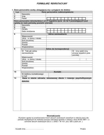 FORMULARZ REKRUTACYJNY I. Dane personalne osoby ubiegającej się o przyjęcie do żłobka: L.p. Dane personalne rodzica/opiekuna 1 Nazwisko 2 Imię 3 Pesel Dane personalne dziecka/dzieci od 21 tygodnia życia do lat 3 pozostających pod opieką (w razie potrzeby powielić wiersze) 4 Nazwisko 6 Imię 7 PESEL Data urodzenia 8 Adres zamieszkania Miejscowość Ulica , nr domu i lokalu Kod pocztowy Gmina Powiat Województwo 9 Adres do korespondencji Inny (jeśli inny proszę wypełnić pola poniżej) Taki jak adres zamieszkania Miejscowość Ulica , nr domu i lokalu Kod pocztowy Gmina Powiat Województwo 10 14 Kontakt Nr telefonu kontaktowego e-mail Dane o stanie zdrowia, stosowanej diecie i rozwoju psychofizycznym dziecka: Oświadczenie Wyrażam zgodę na przetwarzanie moich danych osobowych zawartych w ofercie pracy dla potrzeb niezbędnych do realizacji procesu rekrutacji zgodnie z ustawą z dnia 29.08.1997 r. o ochronie danych osobowych (Dz.U. z 2002 r. Nr 101, poz. 926 z późn.zm. ) Suwałki dnia………………………….. Podpis