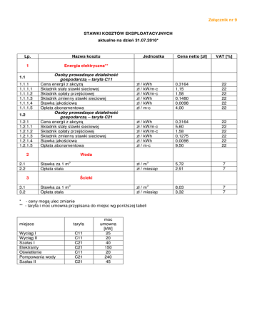 Załącznik nr 9 STAWKI KOSZTÓW EKSPLOATACYJNYCH aktualne na dzień 31.07.2010* Lp. Nazwa kosztu 1 Energia elektryczna** 1.1 1.1.1 1.1.1.1 1.1.1.2 1.1.1.3 1.1.1.4 1.1.1.5 1.2 1.2.1 1.2.1.1 1.2.1.2 1.2.1.3 1.2.1.4 1.2.1.5 Osoby prowadzące działalność gospodarczą – taryfa C11 Cena energii z akcyzą Składnik stały stawki sieciowej Składnik opłaty przejściowej Składnik zmienny stawki sieciowej Stawka jakościowa Opłata abonamentowa Osoby prowadzące działalność gospodarczą – taryfa C21 Cena energii z akcyzą Składnik stały stawki sieciowej Składnik opłaty przejściowej Składnik zmienny stawki sieciowej Stawka jakościowa Opłata abonamentowa 2 2.1 2.2 Cena netto [zł] VAT [%] zł / kWh zł / kW/m-c zł / kW/m-c zł / kWh zł / kWh zł / m-c 0,3164 1,15 1,58 0,1480 0,0098 4,00 22 22 22 22 22 22 zł / kWh zł / kW/m-c zł / kW/m-c zł / kWh zł / kWh zł / m-c 0,3164 5,60 1,58 0,1275 0,0098 9,50 22 22 22 22 22 22 zł / m zł / miesiąc 3 5,72 2,91 7 7 3 8,03 3,32 7 7 Woda Stawka za 1 m Opłata stała 3 3 3.1 3.2 Jednostka Ścieki Stawka za 1 m Opłata stała 3 zł / m zł / miesiąc * - ceny mogą ulec zmianie ** - taryfa i moc umowna przypisana do miejsc wg poniższej tabeli miejsce Wyciąg I Wyciąg II Szałas I Elektranty Oświetlenie Pompowania wody Szałas II taryfa C11 C11 C21 C21 C11 C21 C21 moc umowna [kW] 25 20 40 150 20 240 45