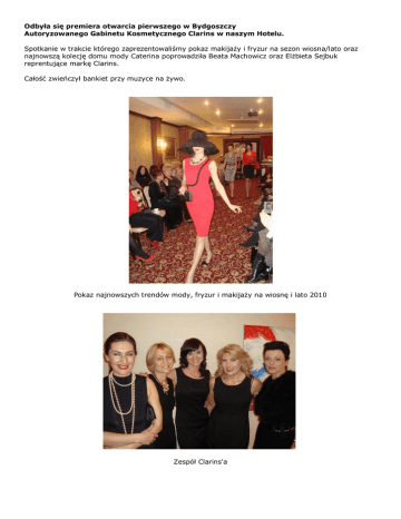 Odbyła się premiera otwarcia pierwszego w Bydgoszczy Autoryzowanego Gabinetu Kosmetycznego Clarins w naszym Hotelu. Spotkanie w trakcie którego zaprezentowaliśmy pokaz makijaży i fryzur na sezon wiosna/lato oraz najnowszą kolecję domu mody Caterina poprowadziła Beata Machowicz oraz Elżbieta Sejbuk reprentujące markę Clarins. Całość zwieńczył bankiet przy muzyce na żywo. Pokaz najnowszych trendów mody, fryzur i makijaży na wiosnę i lato 2010 Zespół Clarins'a Elżbieta Sejbuk - stylistka Clarins i TVN Style wykonuje makijaż pokazowy