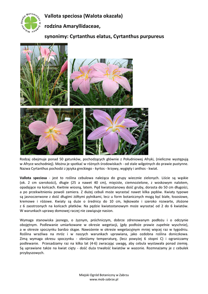 Vallota speciosa (Walota okazała) rodzina Amaryllidaceae, synonimy: Cyrtanthus elatus, Cyrtanthus purpureus Rodzaj obejmuje ponad 50 gatunków, pochodzących głównie z Południowej Afryki, (nieliczne występują w Afryce wschodniej). Można je spotkać w różnych środowiskach - od stale wilgotnych do prawie pustynne. Nazwa Cyrtanthus pochodzi z języka greckiego - kyrtos - krzywy, wygięty i anthos - kwiat. Vallota speciosa - jest to roślina cebulowa należąca do grupy wiecznie zielonych. Liście są wąskie (ok. 2 cm szerokości), długie (25 a nawet 40 cm), mięsiste, ciemnozielone, z woskowym nalotem, opadające na końcach. Kwitnie wiosną, latem. Pęd kwiatostanowy dość gruby, dorasta do 50 cm długości, a po przekwitnieniu powoli zamiera. Z dużej cebuli może wyrastać nawet kilka pędów. Kwiaty typowe są jasnoczerwone z dość długimi żółtymi pylnikami, lecz u form botanicznych mogą być białe, łososiowe, kremowe i różowe. Kwiaty są duże o średnicy do 10 cm, lejkowate i szeroko rozwarte, złożone z 6 zaostrzonych na końcach płatków. Na pędzie kwiatostanowym może wyrastać od 2 do 6 kwiatów. W warunkach uprawy domowej raczej nie zawiązuje nasion. Wymaga stanowiska jasnego, o żyznym, próchniczym, dobrze zdrenowanym podłożu i o odczynie obojętnym. Podlewanie umiarkowane w okresie wegetacji, (gdy podłoże prawie zupełnie wyschnie), a w okresie spoczynku bardzo skąpe. Nawożenie w okresie wegetacyjnym mniej więcej raz w tygodniu. Roślina wrażliwa na mróz i w naszych warunkach uprawiana, jako ozdobna roślina doniczkowa. Zimą wymaga okresu spoczynku - obniżamy temperaturę, (lecz powyżej 6 stopni C) i ograniczamy podlewanie. Przesadzamy raz na kilka lat (4-6) zwracając uwagę, aby cebula wystawała ponad ziemię. Są uprawiane także na kwiat cięty - dość duża trwałość kwiatów w wazonie. Rozmnażamy je z cebulek przybyszowych. Miejski Ogród Botaniczny w Zabrzu www.mob-zabrze.pl