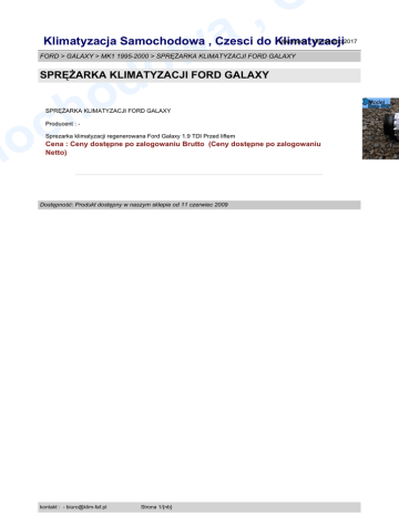w o d o h , a Utworzono : 06 marzec 2017 Klimatyzacja Samochodowa , Czesci do Klimatyzacji FORD > GALAXY > MK1 1995-2000 > SPRĘŻARKA KLIMATYZACJI FORD GALAXY SPRĘŻARKA KLIMATYZACJI FORD GALAXY c o m SPRĘŻARKA KLIMATYZACJI FORD GALAXY Producent : - Sprezarka klimatyzacji regenerowana Ford Galaxy 1.9 TDI Przed liftem Cena : Ceny dostępne po zalogowaniu Brutto (Ceny dostępne po zalogowaniu Netto) Dostępność: Produkt dostępny w naszym sklepie od 11 czerwiec 2009 kontakt : - [email protected] Strona 1/{nb} Model : -