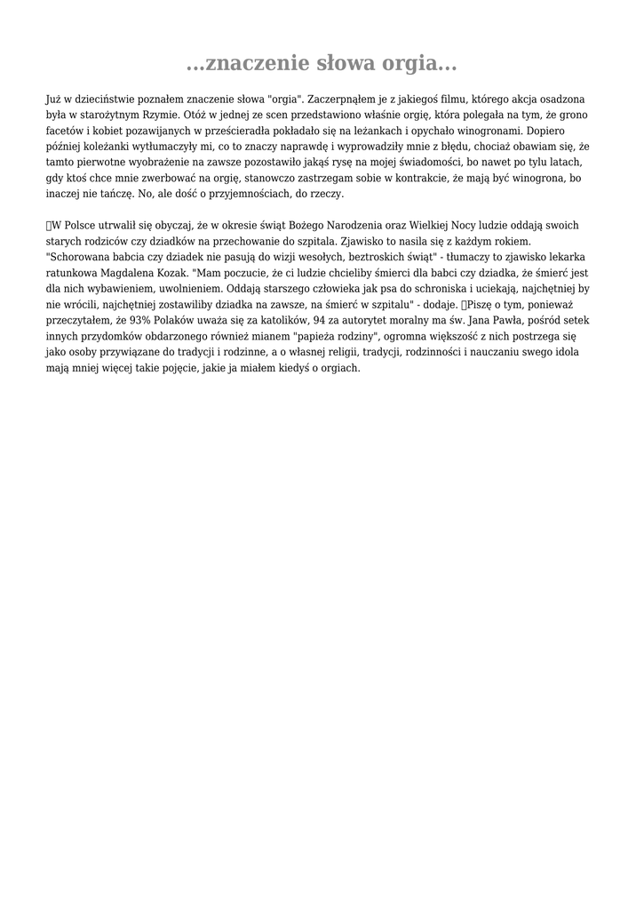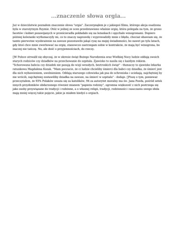 ...znaczenie słowa orgia... Już w dzieciństwie poznałem znaczenie słowa "orgia". Zaczerpnąłem je z jakiegoś filmu, którego akcja osadzona była w starożytnym Rzymie. Otóż w jednej ze scen przedstawiono właśnie orgię, która polegała na tym, że grono facetów i kobiet pozawijanych w prześcieradła pokładało się na leżankach i opychało winogronami. Dopiero później koleżanki wytłumaczyły mi, co to znaczy naprawdę i wyprowadziły mnie z błędu, chociaż obawiam się, że tamto pierwotne wyobrażenie na zawsze pozostawiło jakąś rysę na mojej świadomości, bo nawet po tylu latach, gdy ktoś chce mnie zwerbować na orgię, stanowczo zastrzegam sobie w kontrakcie, że mają być winogrona, bo inaczej nie tańczę. No, ale dość o przyjemnościach, do rzeczy. W Polsce utrwalił się obyczaj, że w okresie świąt Bożego Narodzenia oraz Wielkiej Nocy ludzie oddają swoich starych rodziców czy dziadków na przechowanie do szpitala. Zjawisko to nasila się z każdym rokiem. "Schorowana babcia czy dziadek nie pasują do wizji wesołych, beztroskich świąt" - tłumaczy to zjawisko lekarka ratunkowa Magdalena Kozak. "Mam poczucie, że ci ludzie chcieliby śmierci dla babci czy dziadka, że śmierć jest dla nich wybawieniem, uwolnieniem. Oddają starszego człowieka jak psa do schroniska i uciekają, najchętniej by nie wrócili, najchętniej zostawiliby dziadka na zawsze, na śmierć w szpitalu" - dodaje. Piszę o tym, ponieważ przeczytałem, że 93% Polaków uważa się za katolików, 94 za autorytet moralny ma św. Jana Pawła, pośród setek innych przydomków obdarzonego również mianem "papieża rodziny", ogromna większość z nich postrzega się jako osoby przywiązane do tradycji i rodzinne, a o własnej religii, tradycji, rodzinności i nauczaniu swego idola mają mniej więcej takie pojęcie, jakie ja miałem kiedyś o orgiach.