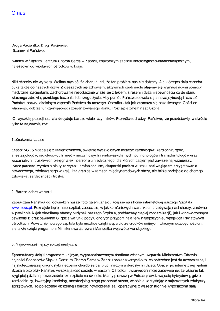 O nas Droga Pacjentko, Drogi Pacjencie, Szanowni Państwo, witamy w Śląskim Centrum Chorób Serca w Zabrzu, znakomitym szpitalu kardiologiczno-kardiochirugicznym, należącym do wiodących ośrodków w kraju. Nikt choroby nie wybiera. Wolimy myśleć, że chorują inni, że ten problem nas nie dotyczy. Ale któregoś dnia choroba puka także do naszych drzwi. Z cieszących się zdrowiem, aktywnych osób nagle stajemy się wymagającymi pomocy medycznej pacjentami. Zachorowanie nieodłącznie wiąże się z lękiem, stresem i dużą niepewnością co do stanu własnego zdrowia, przebiegu leczenia i dalszego życia. Aby pomóc Państwu oswoić się z nową sytuacją i rozwiać Państwa obawy, chciałbym zaprosić Państwa do naszego Ośrodka - tak jak zaprasza się oczekiwanych Gości do własnego, dobrze funkcjonującego i zorganizowanego domu. Poznajcie zatem nasz Szpital. O wysokiej pozycji szpitala decyduje bardzo wiele czynników. Pozwólcie, drodzy Państwo, że przedstawię w skrócie tylko te najważniejsze: 1. Znakomici Ludzie Zespół SCCS składa się z utalentowanych, świetnie wyszkolonych lekarzy: kardiologów, kardiochirurgów, anestezjologów, radiologów, chirurgów naczyniowych i endowaskularnych, pulmonologów i transplantologów oraz wspaniałych i troskliwych pielęgniarek i personelu medycznego, dla których pacjent jest zawsze najważniejszy. Nasz personel wyróżnia nie tylko wysoki profesjonalizm, ekspercki poziom w kraju, pod względem przygotowania zawodowego, zdobywanego w kraju i za granicą w ramach międzynarodowych staży, ale także podejście do chorego człowieka, serdeczność i troska. 2. Bardzo dobre warunki Zapraszam Państwa do odwiedzin naszej foto galerii, znajdującej się na stronie internetowej naszego Szpitala www.sccs.pl. Poznajcie lepiej nasz szpital, zobaczcie, w jak komfortowych warunkach przebywają nasi chorzy, zarówno w pawilonie A (jak określamy starszy budynek naszego Szpitala, poddawany ciągłej modernizacji), jak i w nowoczesnym pawilonie B oraz pawilonie C, gdzie warunki pobytu chorych przypominają te w najlepszych europejskich i światowych ośrodkach. Powstanie nowego szpitala było możliwe dzięki wsparciu ze środków unijnych, własnym oszczędnościom, ale także dzięki programom Ministerstwa Zdrowia i Marszałka województwa śląskiego. 3. Najnowocześniejszy sprzęt medyczny Zgromadzony dzięki programom unijnym, wygospodarowanym środkom własnym, wsparciu Ministerstwa Zdrowia i hojności Sponsorów Śląskie Centrum Chorób Serca w Zabrzu posiada wszystko to, co potrzebne jest do nowoczesnej i najskuteczniejszej diagnostyki i leczenia chorób serca, płuc i naczyń u dorosłych i dzieci. Spacer po internetowej galerii Szpitala przybliży Państwu wysoką jakość sprzętu w naszym Ośrodku i uwiarygodni moje zapewnienie, że właśnie tak wyglądają dziś najnowocześniejsze szpitale na świecie. Mamy pierwszą w Polsce prawdziwą salę hybrydową, gdzie kardiochirurg, inwazyjny kardiolog, anestezjolog mogą pracować razem, wspólnie korzystając z najnowszych zdobyczy sprzętowych. To połączenie obszernej i bardzo nowoczesnej sali operacyjnej z wszechstronnie wyposażoną salą Strona 1/4 hemodynamiczną. Wykonywać można tutaj takie zabiegi kardiochirurgiczne, jak małoinwazyjne operacje wieńcowe, zastawkowe i naczyniowe, ablacje, implantacje stengraftów aortalnych - krótko mówiąc: zakres możliwości przeprowadzanych tu zabiegów jest bardzo szeroki. To właśnie połączenie znakomitego, doświadczonego i oddanego Pacjentowi Zespołu z dostępem do nowoczesnego sprzętu gwarantuje sukces w ratowaniu życia i przywracaniu zdrowia. 4. Nowoczesna organizacja procesu diagnostycznego i leczenia W szpitalu funkcjonują trzy oddziały kliniczne kardiologii dorosłych, liderami których są wybitni polscy kardiolodzy: prof. Zbigniew Kalarus, (I Kardiologia), prof. Mariusz Gąsior, prof. Lech Poloński, prof. Andrzej Lekston, doc. Marek Gierlotka (III Oddział Kardiologii). Katedrą Kardiologii, Wrodzonych Wad Serca i Elektroterapii z Oddziałem Kardiologii Dziecięcej SUM kieruje prof. Jacek Białkowski, jeden z uznanych polskich ekspertów w tej dziedzinie. Oddział Kliniczny Kardioanestezji i Intensywnej Terapii prowadzony jest przez prof. Piotra Knapika, wybitnego polskiego anestezjologa,prezesa Polskiego Towarzystwa Anestezjologii i Intensywnej Terapii, wspieranego przez bardzo doświadczony zespół. Katedra i Oddział Kliniczny Kardiochirurgii, Transplantologii, Chirurgii Naczyniowej i Endowaskularnej, którą przejąłem od prof. Zbigniewa Religii w roku 1999, wykonała tylko w latach 1985-2015 ponad 37 600 operacji serca u dorosłych i dzieci. W tej chwili NIE MA takiej operacji serca na świecie, której nie wykonywano by w zabrzańskim Ośrodku. Dziś nowoczesna zabrzańska kardiochirurgia to 12 operacji serca dziennie, w tym wyraźna przewaga operacji małoinwazyjnych. Naszymi Pacjentami są zarówno osoby z województwa śląskiego, opolskiego, dolnośląskiego, małopolskiego, jak i z terenu całego kraju oraz z zagranicy. Więcej informacji na temat działalności klinicznej i naukowej klinik i oddziałów naszego Szpitala znajdziecie Państwo na stronie i podstronach naszego Szpitala: w zakładkach: Kliniki a także Działalność Kliniczna i Działalność Naukowa. 5. Akademickość zobowiązuje Śląskie Centrum Chorób Serca w Zabrzu to wiodący szpital wysokospecjalistyczny, ale jednocześnie akademicki ośrodek, związany bardzo ściśle ze Śląskim Uniwersytetem Medycznym (SUM) w zakresie szkolenia zawodowego studentów medycyny, ratownictwa medycznego i pielęgniarstwa oraz szkolenia podyplomowego dla specjalizujących się lekarzy. Jesteśmy dumni z naszych możliwości szkolenia przed i podyplomowego z wykorzystaniem najnowszych osiągnięć, m.in. biosymulatorów, które są trwałym elementem szkolenia i doskonalenia zawodowego kardiologów, kardiochirurgów, anestezjologów, inter