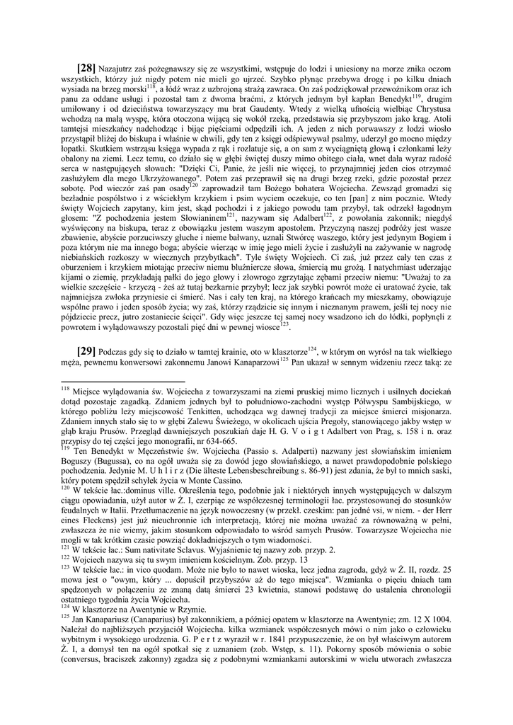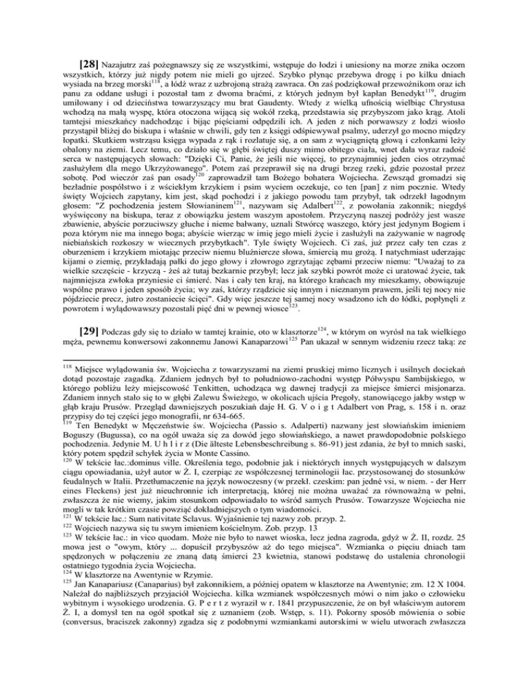 [28] Nazajutrz zaś pożegnawszy się ze wszystkimi, wstępuje do łodzi i uniesiony na morze znika oczom wszystkich, którzy już nigdy potem nie mieli go ujrzeć. Szybko płynąc przebywa drogę i po kilku dniach wysiada na brzeg morski118, a łódź wraz z uzbrojoną strażą zawraca. On zaś podziękował przewoźnikom oraz ich panu za oddane usługi i pozostał tam z dwoma braćmi, z których jednym był kapłan Benedykt 119, drugim umiłowany i od dzieciństwa towarzyszący mu brat Gaudenty. Wtedy z wielką ufnością wielbiąc Chrystusa wchodzą na małą wyspę, która otoczona wijącą się wokół rzeką, przedstawia się przybyszom jako krąg. Atoli tamtejsi mieszkańcy nadchodząc i bijąc pięściami odpędzili ich. A jeden z nich porwawszy z łodzi wiosło przystąpił bliżej do biskupa i właśnie w chwili, gdy ten z księgi odśpiewywał psalmy, uderzył go mocno między łopatki. Skutkiem wstrząsu księga wypada z rąk i rozlatuje się, a on sam z wyciągniętą głową i członkami leży obalony na ziemi. Lecz temu, co działo się w głębi świętej duszy mimo obitego ciała, wnet dała wyraz radość serca w następujących słowach: "Dzięki Ci, Panie, że jeśli nie więcej, to przynajmniej jeden cios otrzymać zasłużyłem dla mego Ukrzyżowanego". Potem zaś przeprawił się na drugi brzeg rzeki, gdzie pozostał przez sobotę. Pod wieczór zaś pan osady120 zaprowadził tam Bożego bohatera Wojciecha. Zewsząd gromadzi się bezładnie pospólstwo i z wściekłym krzykiem i psim wyciem oczekuje, co ten [pan] z nim pocznie. Wtedy święty Wojciech zapytany, kim jest, skąd pochodzi i z jakiego powodu tam przybył, tak odrzekł łagodnym głosem: "Z pochodzenia jestem Słowianinem121, nazywam się Adalbert122, z powołania zakonnik; niegdyś wyświęcony na biskupa, teraz z obowiązku jestem waszym apostołem. Przyczyną naszej podróży jest wasze zbawienie, abyście porzuciwszy głuche i nieme bałwany, uznali Stwórcę waszego, który jest jedynym Bogiem i poza którym nie ma innego boga; abyście wierząc w imię jego mieli życie i zasłużyli na zażywanie w nagrodę niebiańskich rozkoszy w wiecznych przybytkach". Tyle święty Wojciech. Ci zaś, już przez cały ten czas z oburzeniem i krzykiem miotając przeciw niemu bluźniercze słowa, śmiercią mu grożą. I natychmiast uderzając kijami o ziemię, przykładają pałki do jego głowy i złowrogo zgrzytając zębami przeciw niemu: "Uważaj to za wielkie szczęście - krzyczą - żeś aż tutaj bezkarnie przybył; lecz jak szybki powrót może ci uratować życie, tak najmniejsza zwłoka przyniesie ci śmierć. Nas i cały ten kraj, na którego krańcach my mieszkamy, obowiązuje wspólne prawo i jeden sposób życia; wy zaś, którzy rządzicie się innym i nieznanym prawem, jeśli tej nocy nie pójdziecie precz, jutro zostaniecie ścięci". Gdy więc jeszcze tej samej nocy wsadzono ich do łódki, popłynęli z powrotem i wylądowawszy pozostali pięć dni w pewnej wiosce 123. [29] Podczas gdy się to działo w tamtej krainie, oto w klasztorze124, w którym on wyrósł na tak wielkiego męża, pewnemu konwersowi zakonnemu Janowi Kanaparzowi 125 Pan ukazał w sennym widzeniu rzecz taką: ze 118 Miejsce wylądowania św. Wojciecha z towarzyszami na ziemi pruskiej mimo licznych i usilnych dociekań dotąd pozostaje zagadką. Zdaniem jednych był to południowo-zachodni występ Półwyspu Sambijskiego, w którego pobliżu leży miejscowość Tenkitten, uchodząca wg dawnej tradycji za miejsce śmierci misjonarza. Zdaniem innych stało się to w głębi Zalewu Świeżego, w okolicach ujścia Pregoły, stanowiącego jakby wstęp w głąb kraju Prusów. Przegląd dawniejszych poszukiań daje H. G. V o i g t Adalbert von Prag, s. 158 i n. oraz przypisy do tej części jego monografii, nr 634-665. 119 Ten Benedykt w Męczeństwie św. Wojciecha (Passio s. Adalperti) nazwany jest słowiańskim imieniem Boguszy (Bugussa), co na ogół uważa się za dowód jego słowiańskiego, a nawet prawdopodobnie polskiego pochodzenia. Jedynie M. U h l i r z (Die älteste Lebensbeschreibung s. 86-91) jest zdania, że był to mnich saski, który potem spędził schyłek życia w Monte Cassino. 120 W tekście łac.:dominus ville. Określenia tego, podobnie jak i niektórych innych występujących w dalszym ciągu opowiadania, użył autor w Ż. I, czerpiąc ze współczesnej terminologii łac. przystosowanej do stosunków feudalnych w Italii. Przetłumaczenie na język nowoczesny (w przekł. czeskim: pan jedné vsi, w niem. - der Herr eines Fleckens) jest już nieuchronnie ich interpretacją, której nie można uważać za równoważną w pełni, zwłaszcza że nie wiemy, jakim stosunkom odpowiadało to wśród samych Prusów. Towarzysze Wojciecha nie mogli w tak krótkim czasie powziąć dokładniejszych o tym wiadomości. 121 W tekście łac.: Sum nativitate Sclavus. Wyjaśnienie tej nazwy zob. przyp. 2. 122 Wojciech nazywa się tu swym imieniem kościelnym. Zob. przyp. 13 123 W tekście łac.: in vico quodam. Może nie było to nawet wioska, lecz jedna zagroda, gdyż w Ż. II, rozdz. 25 mowa jest o "owym, który ... dopuścił przybyszów aż do tego miejsca". Wzmianka o pięciu dniach tam spędzonych w połączeniu ze znaną datą śmierci 23 kwietnia, stanowi podstawę do ustalenia chronologii ostatniego tygodnia życia Wojciecha. 124 W klasztorze na Awentynie w Rzymie. 125 Jan Kanapariusz (Canaparius) był zakonnikiem, a później opatem w klasztorze na Awentynie; zm. 12 X 1004. Należał do najbliższych przyjaciół Wojciecha. kilka wzmianek współczesnych mówi o nim jako o człowieku wybitnym i wysokiego urodzenia. G. P e r t z wyraził w r. 1841 przypuszczenie, że on był właściwym autorem Ż. I, a domysł ten na ogół spotkał się z uznaniem (zob. Wstęp, s. 11). Pokorny sposób mówienia o sobie (conversus, braciszek zakonny) zgadza się z podobnymi wzmiankami autorskimi w wielu utworach zwłaszcza szczytu 