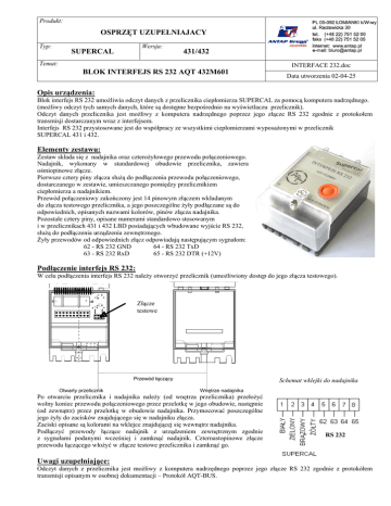 Produkt: OSPRZĘT UZUPEŁNIAJACY Typ: Wersja: SUPERCAL 431/432 Temat: INTERFACE 232.doc BLOK INTERFEJS RS 232 AQT 432M601 Data utworzenia 02-04-25 Opis urządzenia: Blok interfejs RS 232 umożliwia odczyt danych z przelicznika ciepłomierza SUPERCAL za pomocą komputera nadrzędnego. (możliwy odczyt tych samych danych, które są dostępne bezpośrednio na wyświetlaczu przelicznik). Odczyt danych przelicznika jest możliwy z komputera nadrzędnego poprzez jego złącze RS 232 zgodnie z protokołem transmisji dostarczanym wraz z interfejsem. Interfejs RS 232 przystosowane jest do współpracy ze wszystkimi ciepłomierzami wyposażonymi w przelicznik SUPERCAL 431 i 432. Elementy zestawu: Zestaw składa się z nadajnika oraz czterożyłowego przewodu połączeniowego. Nadajnik, wykonany w standardowej obudowie przelicznika, zawiera ośmiopinowe złącze. Pierwsze cztery piny złącza służą do podłączenia przewodu połączeniowego, dostarczanego w zestawie, umieszczanego pomiędzy przelicznikiem ciepłomierza a nadajnikiem. Przewód połączeniowy zakończony jest 14 pinowym złączem wkładanym do złącza testowego przelicznika, a jego poszczególne żyły podłączane są do odpowiednich, opisanych nazwami kolorów, pinów złącza nadajnika. Pozostałe cztery piny, opisane numerami standardowo stosowanym i w przelicznikach 431 i 432 LBD posiadających wbudowane wyjście RS 232, służą do podłączenia urządzenia zewnętrznego. Żyły przewodów od odpowiednich złącz odpowiadają następującym sygnałom: 62 - RS 232 GND 64 - RS 232 TxD 63 - RS 232 RxD 65 - RS 232 DTR (+12V) Podłączenie interfejs RS 232: W celu podłączenia interfejs RS 232 należy otworzyć przelicznik (umożliwiony dostęp do jego złącza testowego). - + Złącze testowe Przewód łączący Otwarty przelicznik Schemat wklejki do nadajnika Wnętrze nadajnika Po otwarciu przelicznika i nadajnika należy (od wnętrza przelicznika) przełożyć wolny koniec przewodu połączeniowego przez przelotkę w jego obudowie, następnie (od zewnątrz) przez przelotkę w obudowie nadajnika. Przymocować poszczególne jego żyły do zacisków znajdującego się w nadajniku złącza. Zaciski opisane są kolorami na wklejce znajdującej się wewnątrz nadajnika. Podłączyć przewody łączące nadajnik z urządzeniem zewnętrznym zgodnie z sygnałami podanymi wcześniej i zamknąć nadajnik. Czternastopinowe złącze przewodu łączącego włożyć w złącze testowe przelicznika i zamknąć go. RS 232 Uwagi uzupełniające: Odczyt danych z przelicznika jest możliwy z komputera nadrzędnego poprzez jego złącze RS 232 zgodnie z protokółem transmisji opisanym w osobnej dokumentacji – Protokół AQT-BUS.