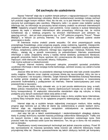 Od zachwytu do uzależnienia Nazwa "Internet" staje się w szybkim tempie jednym z najpopularniejszych i najczęściej używanych słów współczesnego człowieka. Można zaobserwować swoistego rodzaju zachwyt tym przecież ciągle nowym medium. Ktoś, kto nie wie, co to jest Internet i nie korzysta z tego zaczyna być postrzegany jako zacofany. Włączamy radio i co pewien czas redaktor audycji informuje nas, że informacje na poruszany temat możemy znaleźć na stronach internetowych WWW. Oglądamy program telewizyjny i jest podobnie. Coraz częściej w audycji telewizyjnej pojawia się napis z adresem internetowym albo prowadzący informuję nas, że można kontaktować się z redakcją programu na stronach internetowych pod adresem np. www.tvp.com.pl/... Jest już dużo programów (np. w TVP cykliczne programy "Forum", "Rower Błażeja"), w których za pomocą Internetu "na żywo" można zadawać pytania osobie goszczącej w studio. W Internecie można znaleźć prawie wszystko. Od stron prezentujących osobę przeciętnego Kowalskiego, przez prognozę pogody, prasę codzienną, tygodniki, miesięczniki, rozgłośnie radiowe, programy telewizyjne po wyższe uczelnie i najwyższe urzędy państwowe. Politycy, związkowcy, partie polityczne, różnego typu organizacje i instytucje, Kościoły, firmy, sklepy,... starają się w sposób nowoczesny za pośrednictwem Internetu prezentować informacje o sobie. Znajdziemy strony z każdej niemal dziedziny (poświęcone literaturze, geografii, przyrodzie, historii, fizyce, sportowi, itd.), przeznaczone dla: dzieci, młodzieży kobiet, mężczyzn, osób starszych, nauczycieli, lekarzy, hobbystów... I tak można wyliczać w nieskończoność. Poprzez Internet możemy dokonywać zakupów, prowadzić sprzedaż produktów, uzyskiwać informacje o stanie swojego konta bankowego, zamówić wczasy czy udział w kursie szkoleniowym. Jeszcze kilka lat temu na posiadanie własnego komputera stać było przede wszystkim osoby majętne. Obecnie coraz częściej uczniowie dziwią się nauczycielowi, który nie ma w domu komputera i nie korzysta z Internetu. Dzięki finansom Ministerstwa Edukacji Narodowej w każdej gminie znajduje się szkoła, zwykle gimnazjum, wyposażona w nowoczesną pracownie multimedialną z podłączeniem do Internetu. Internet wykorzystywany jest coraz powszechniej w nauczaniu. Dziś prawie każdy młody człowiek wie, co to jest poczta elektroniczna (ang. e-mail). Blisko połowa mieszkańców Europy i Stanów Zjednoczonych korzysta na co dzień z takiej formy korespondencji. W większości dokumentów standardem staje się rubryka, w której podajemy przy danych osobowych także swój adres e-mail. Są już tacy ludzie, którzy zamiast telewizora mają w domu szybkie łącza Internetowe, a dobrej klasy komputer służy im do oglądania programu telewizyjnego, kaset video czy płyt DVD. Internet staje się w szybkim tempie najbardziej znaczącym medium, które według prognoz jego twórców już za kilka lat stanie się codziennością w prawie każdym domu. Internet staje się najpotężniejszym narzędziem oddziaływania na społeczeństwa, pozostawiając w tyle pozostałe media. Jest więc tak jak w latach sześćdziesiątych i siedemdziesiątych ubiegłego stulecia, kiedy to postęp techniczny wywołał masową produkcję odbiorników telewizyjnych. Trafiły one do naszych domów i stały się prawie koniecznym elementem codziennego życia. Dziś przecież mało kto wyobraża sobie życie bez telewizora. Ten, kto go w domu nie ma uważany jest za dziwaka. Współczesny rozwój nowoczesnych technologii jest jednak znacznie szybszy. Przed 30 laty wprowadzanie do masowej sprzedaży takiej nowości jak odbiornik telewizyjny trwało przynajmniej kilka lat. Obecnie upowszechnienie się takich zdobyczy techniki jak komputery osobiste, telewizja satelitarna czy telefonia komórkowa odbywa się wprost w zawrotnym tempie. Konkurencja na rynku jest tak wielka, że wybór nowego komputera czy telefonu komórkowego przysparza o zawrót głowy. Można by jeszcze długo pisać o nowościach i zaletach rozwoju technologii informatycznej i zastosowaniach jej w Internecie. Trzeba jednak równocześnie napisać o towarzyszącym im nowym, ważnym i znaczącym zjawisku, o którym mało kto wspomina. Olbrzymi przemysł związany z branżą informatyczną poparty wielkimi nakładami finansowymi na rozwój nowoczesnych technologii i profesjonalną reklamę w mediach powoduje, że stajemy się coraz bardziej uzależnieni od jego produktów. Powyżej przytoczone przykłady, prawie wszechobecności Internetu w naszym życiu, pokazują jak potężny jest to środek medialny. Tak niezwykłe i wygodne w użyciu zdobycze techniki zaczynają coraz częściej nad nami panować i to w sposób, którego sobie nie uświadamiamy. Rzadko się mówi czy pisze o tym, że oddziaływanie przedmiotów martwych, wytworów pracy człowieka takich jak telefony komórkowe czy komputery, doprowadziło do sytuacji, w której oficjalnie mówi się o uzależnieniu milionów ludzi na świecie od Internetu. Okazuje się, że od Internetu można się uzależnić tak samo jak od alkoholu, narkotyków czy hazardu. W 1999 roku w Stanach Zjednoczonych przeprowadzono poważne i reprezentatywne badania wśród użytkowników sieci Internetowej. Opracowano specjalne kwestionariusze, podobne do tych, przy pomocy których sprawdza się stopień uzależnienia od gier hazardowych. Okazało się wówczas, że około 10 procent ankietowanych wykazało objawy chorobowe. Za osobę uzależnioną przyjmuje się taką, która korzysta średnio 5 godzin dzienne z Internetu. Konsekwencjami przekroczenia tej granicy są między innymi: brak czasu dla najbliższych, opuszczenie się w nauce, zaniedbanie obowiązków zawodowych, wycofanie z życia towarzyskiego. W roku 1999 liczbę użytkowników Internetu szacowano na około 200 milionów, co oznaczało wówczas, że na świecie u 20 milionów ludz