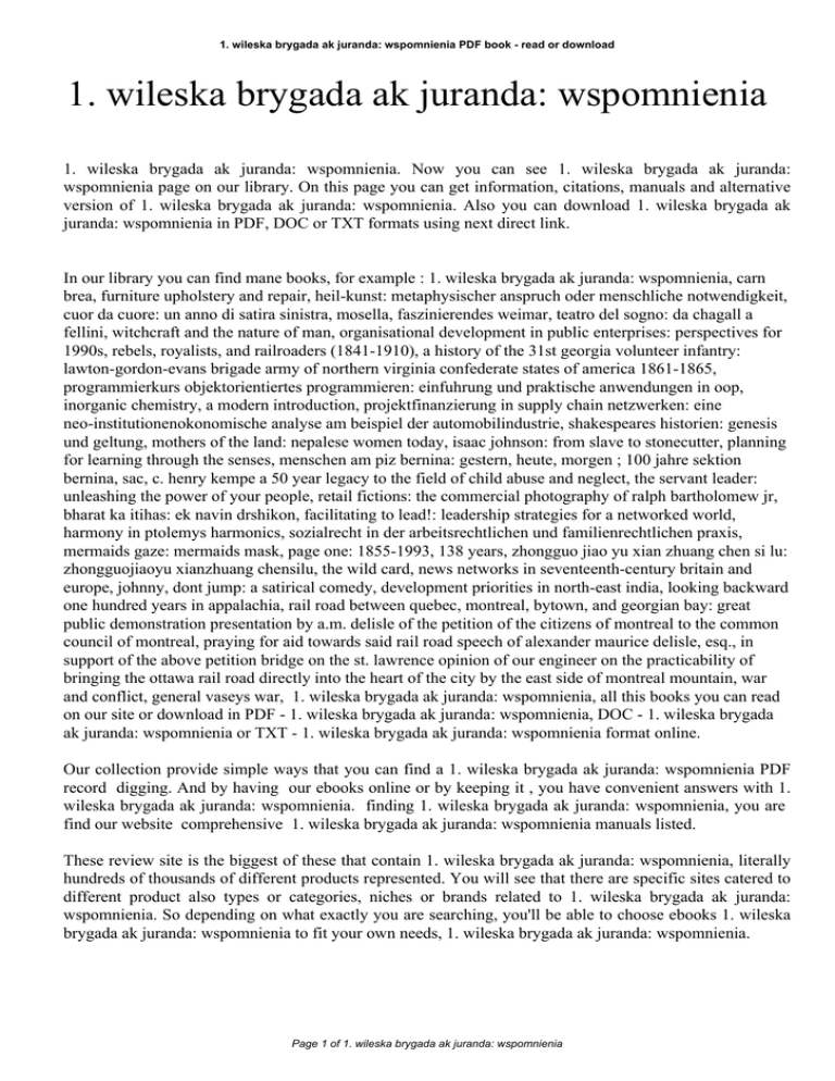 1. wileska brygada ak juranda: wspomnienia PDF book - read or download 1. wileska brygada ak juranda: wspomnienia 1. wileska brygada ak juranda: wspomnienia. Now you can see 1. wileska brygada ak juranda: wspomnienia page on our library. On this page you can get information, citations, manuals and alternative version of 1. wileska brygada ak juranda: wspomnienia. Also you can download 1. wileska brygada ak juranda: wspomnienia in PDF, DOC or TXT formats using next direct link. In our library you can find mane books, for example : 1. wileska brygada ak juranda: wspomnienia, carn brea, furniture upholstery and repair, heil-kunst: metaphysischer anspruch oder menschliche notwendigkeit, cuor da cuore: un anno di satira sinistra, mosella, faszinierendes weimar, teatro del sogno: da chagall a fellini, witchcraft and the nature of man, organisational development in public enterprises: perspectives for 1990s, rebels, royalists, and railroaders (1841-1910), a history of the 31st georgia volunteer infantry: lawton-gordon-evans brigade army of northern virginia confederate states of america 1861-1865, programmierkurs objektorientiertes programmieren: einfuhrung und praktische anwendungen in oop, inorganic chemistry, a modern introduction, projektfinanzierung in supply chain netzwerken: eine neo-institutionenokonomische analyse am beispiel der automobilindustrie, shakespeares historien: genesis und geltung, mothers of the land: nepalese women today, isaac johnson: from slave to stonecutter, planning for learning through the senses, menschen am piz bernina: gestern, heute, morgen ; 100 jahre sektion bernina, sac, c. henry kempe a 50 year legacy to the field of child abuse and neglect, the servant leader: unleashing the power of your people, retail fictions: the commercial photography of ralph bartholomew jr, bharat ka itihas: ek navin drshikon, facilitating to lead!: leadership strategies for a networked world, harmony in ptolemys harmonics, sozialrecht in der arbeitsrechtlichen und familienrechtlichen praxis, mermaids gaze: mermaids mask, page one: 1855-1993, 138 years, zhongguo jiao yu xian zhuang chen si lu: zhongguojiaoyu xianzhuang chensilu, the wild card, news networks in seventeenth-century britain and europe, johnny, dont jump: a satirical comedy, development priorities in north-east india, looking backward one hundred years in appalachia, rail road between quebec, montreal, bytown, and georgian bay: great public demonstration presentation by a.m. delisle of the petition of the citizens of montreal to the common council of montreal, praying for aid towards said rail road speech of alexander maurice delisle, esq., in support of the above petition bridge on the st. lawrence opinion of our engineer on the practicability of bringing the ottawa rail road directly into the heart of the city by the east side of montreal mountain, war and conflict, general vaseys war, 1. wileska brygada ak juranda: wspomnienia, all this books you can read on our site or download in PDF - 1. wileska brygada ak juranda: wspomnienia, DOC - 1. wileska brygada ak juranda: wspomnienia or TXT - 1. wileska brygada ak juranda: wspomnienia format online. Our collection provide simple ways that you can find a 1. wileska brygada ak juranda: wspomnienia PDF record digging. And by having our ebooks online or by keeping it , you have convenient answers with 1. wileska brygada ak juranda: wspomnienia. finding 1. wileska brygada ak juranda: wspomnienia, you are find our website comprehensive 1. wileska brygada ak juranda: wspomnienia manuals listed. These review site is the biggest of these that contain 1. wileska brygada ak juranda: wspomnienia, literally hundreds of thousands of different products represented. You will see that there are specific sites catered to different product also types or categories, niches or brands related to 1. wileska brygada ak juranda: wspomnienia. So depending on what exactly you are searching, you'll be able to choose ebooks 1. wileska brygada ak juranda: wspomnienia to fit your own needs, 1. wileska brygada ak juranda: wspomnienia. Page 1 of 1. wileska brygada ak juranda: wspomnienia