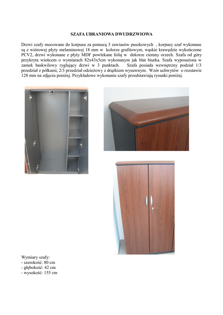SZAFA UBRANIOWA DWUDRZWIOWA Drzwi szafy mocowane do korpusu za pomocą 3 zawiasów puszkowych , korpusy szaf wykonane są z wiórowej płyty melaminowej 18 mm w kolorze grafitowym, wąskie krawędzie wykończone PCV2, drzwi wykonane z płyty MDF powlekane folią w dekorze ciemny orzech. Szafa od góry przykryta wieńcem o wymiarach 82x43x5cm wykonanym jak blat biurka. Szafa wyposażona w zamek baskwilowy ryglujący drzwi w 3 punktach. Szafa posiada wewnętrzny podział 1/3 przedział z półkami, 2/3 przedział odzieżowy z drążkiem wysuwnym. Wzór uchwytów o rozstawie 128 mm na zdjęciu poniżej. Przykładowe wykonanie szafy przedstawiają rysunki poniżej. Wymiary szafy: - szerokość: 80 cm - głębokość: 42 cm - wysokość: 155 cm