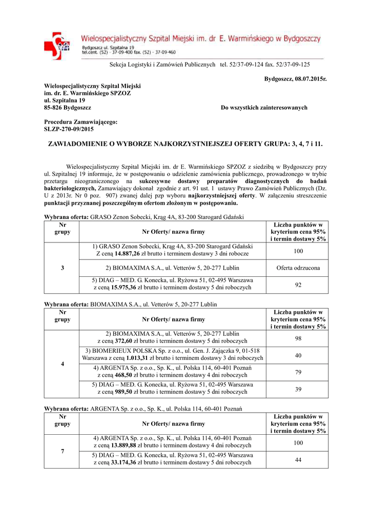 Sekcja Logistyki i Zamówień Publicznych tel. 52/37-09-124 fax. 52/37-09-125 Bydgoszcz, 08.07.2015r. Wielospecjalistyczny Szpital Miejski im. dr. E. Warmińskiego SPZOZ ul. Szpitalna 19 85-826 Bydgoszcz Do wszystkich zainteresowanych Procedura Zamawiającego: SLZP-270-09/2015 ZAWIADOMIENIE O WYBORZE NAJKORZYSTNIEJSZEJ OFERTY GRUPA: 3, 4, 7 i 11. Wielospecjalistyczny Szpital Miejski im. dr E. Warmińskiego SPZOZ z siedzibą w Bydgoszczy przy ul. Szpitalnej 19 informuje, że w postępowaniu o udzielenie zamówienia publicznego, prowadzonego w trybie przetargu nieograniczonego na sukcesywne dostawy preparatów diagnostycznych do badań bakteriologicznych, Zamawiający dokonał zgodnie z art. 91 ust. 1 ustawy Prawo Zamówień Publicznych (Dz. U z 2013r. Nr 0 poz. 907) zwanej dalej pzp wyboru najkorzystniejszej oferty. W załączeniu streszczenie punktacji przyznanej poszczególnym ofertom złożonym w postępowaniu. Wybrana oferta: GRASO Zenon Sobecki, Krąg 4A, 83-200 Starogard Gdański Nr grupy Nr Oferty/ nazwa firmy 3 1) GRASO Zenon Sobecki, Krąg 4A, 83-200 Starogard Gdański Z ceną 14.887,26 zł brutto i terminem dostawy 3 dni robocze 100 2) BIOMAXIMA S.A., ul. Vetterów 5, 20-277 Lublin Oferta odrzucona 5) DIAG – MED. G. Konecka, ul. Ryżowa 51, 02-495 Warszawa z ceną 15.975,36 zł brutto i terminem dostawy 5 dni roboczych 92 Wybrana oferta: BIOMAXIMA S.A., ul. Vetterów 5, 20-277 Lublin Nr grupy Nr Oferty/ nazwa firmy 4 Liczba punktów w kryterium cena 95% i termin dostawy 5% 2) BIOMAXIMA S.A., ul. Vetterów 5, 20-277 Lublin z ceną 372,60 zł brutto i terminem dostawy 5 dni roboczych 98 3) BIOMERIEUX POLSKA Sp. z o.o., ul. Gen. J. Zajączka 9, 01-518 Warszawa z ceną 1.013,31 zł brutto i terminem dostawy 3 dni roboczych 40 4) ARGENTA Sp. z o.o., Sp. K., ul. Polska 114, 60-401 Poznań z ceną 468,50 zł brutto i terminem dostawy 4 dni roboczych 79 5) DIAG – MED. G. Konecka, ul. Ryżowa 51, 02-495 Warszawa z ceną 989,50 zł brutto i terminem dostawy 5 dni roboczych 39 Wybrana oferta: ARGENTA Sp. z o.o., Sp. K., ul. Polska 114, 60-401 Poznań Nr grupy Nr Oferty/ nazwa firmy 7 Liczba punktów w kryterium cena 95% i termin dostawy 5% Liczba punktów w kryterium cena 95% i termin dostawy 5% 4) ARGENTA Sp. z o.o., Sp. K., ul. Polska 114, 60-401 Poznań z ceną 13.889,88 zł brutto i terminem dostawy 4 dni roboczych 100 5) DIAG – MED. G. Konecka, ul. Ryżowa 51, 02-495 Warszawa z ceną 33.174,36 zł brutto i terminem dostawy 5 dni roboczych 44 Wybrana oferta: DIAG – MED. G. Konecka, ul. Ryżowa 51, 02-495 Warszawa Nr grupy Nr Oferty/ nazwa firmy 2) BIOMAXIMA S.A., ul. Vetterów 5, 20-277 Lublin z ceną 6.966,00 zł brutto i terminem dostawy 5 dni roboczych 3) BIOMERIEUX POLSKA Sp. z o.o., ul. Gen. J. Zajączka 9, 01-518 Warszawa z ceną 6.091,20 zł brutto i terminem dostawy 3 dni robocze 11 4) ARGENTA Sp. z o.o., Sp. K., ul. Polska 114, 60-401 Poznań z ceną 4.309,20 zł brutto i terminem dostawy 4 dni roboczych 5) DIAG – MED. G. Konecka, ul. Ryżowa 51, 02-495 Warszawa z ceną 5.880,60 zł brutto i terminem dostawy 5 dni roboczych Liczba punktów w kryterium cena 95% i termin dostawy 5% Oferta odrzucona 72 Oferta odrzucona 73 Wybrani wykonawcy złożyli najkorzystniejszą ofertę w w/w grupach i uzyskali maksymalną liczbę punktów w kryterium cena i termin dostawy. W związku z powyższym Zamawiający prześle umowę pocztą. Wielospecjalistyczny Szpital Miejski im. dr E. Warmińskiego SPZOZ z siedzibą w Bydgoszczy przy ul. Szpitalnej 19 działając na podstawie art. 89, ust. 1, pkt. 2 ustawy Prawo Zamówień Publicznych (Dz. U z 2013r. Nr 0 poz. 907 ze zmianami) w skrócie pzp, odrzuca ofertę firmy BIOMAXIMA S.A., ul. Vetterów 5, 20-277 Lublin na zadanie – grupę 3 – podłoża chromogenie do hodowli bakterii na płytkach petriego jako niezgodną ze specyfikacją istotnych warunków zamówienia (w skrócie siwz). Zamawiający w formularzu cenowym w grupie 3, pozycji 4 wymagał 180 sztuk płytki dwudzielnej z podłożem chromogennym pozwalającym różnicować szczepy Staphylococcus MRSA i MSSA, natomiast Wykonawca zaoferował 5 sztuk płytek. Złożona oferta jest niezgodna ze siwz. Wielospecjalistyczny Szpital Miejski im. dr E. Warmińskiego SPZOZ z siedzibą w Bydgoszczy przy ul. Szpitalnej 19 działając na podstawie art. 89, ust. 1, pkt. 2 ustawy pzp, odrzuca ofertę firmy BIOMAXIMA S.A., ul. Vetterów 5, 20-277 Lublin i ofertę firmy ARGENTA Sp. z o.o., Sp. K.., ul. Polska 114, 60-401 Poznań na zadanie - grupę 11 (podłoże do identyfikacji Streptococcus agalactiae) – jako niezgodną z siwz. Zaoferowane produkty firmy Biomaxima S.A. i Argenta Sp. z o.o., Sp. K. nie zawierają wymaganego podłoża do identyfikacji S. agalactiae na podstawie wytwarzania granadyny. Zamawiający w odpowiedziach na pytania do przetargu z dnia 17-03-2015r. w odpowiedzi na pytanie odpowiedział, że wymaga podłoża do identyfikacji S. agalactiae na podstawie wytwarzania granadyny. W związku z powyższym Zamawiający orzeka jak na wstępie. Dziękujemy za udział w postępowaniu. ZamawiającyZamawiający