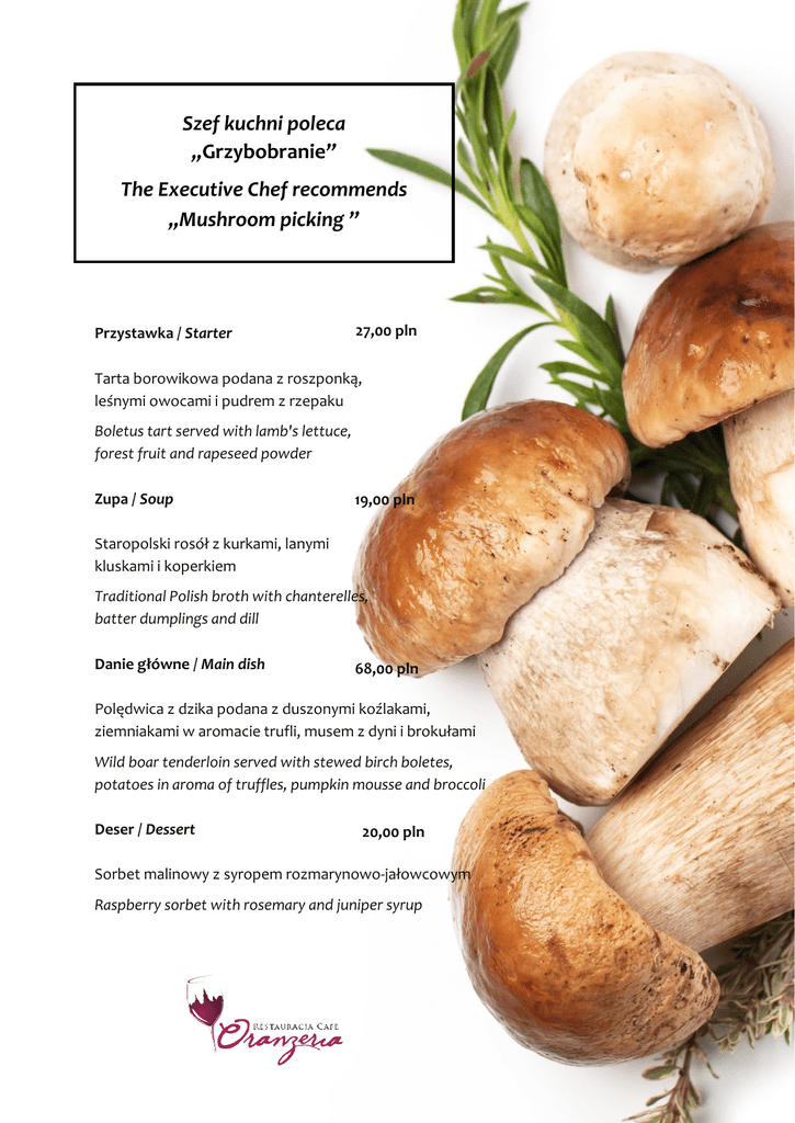 Szef kuchni poleca „Grzybobranie” The Executive Chef recommends „Mushroom picking ” Przystawka / Starter 27,00 pln Tarta borowikowa podana z roszponką, leśnymi owocami i pudrem z rzepaku Boletus tart served with lamb's lettuce, forest fruit and rapeseed powder Zupa / Soup 19,00 pln Staropolski rosół z kurkami, lanymi kluskami i koperkiem Traditional Polish broth with chanterelles, batter dumplings and dill Danie główne / Main dish 68,00 pln Polędwica z dzika podana z duszonymi koźlakami, ziemniakami w aromacie trufli, musem z dyni i brokułami Wild boar tenderloin served with stewed birch boletes, potatoes in aroma of truffles, pumpkin mousse and broccoli Deser / Dessert 20,00 pln Sorbet malinowy z syropem rozmarynowo-jałowcowym Raspberry sorbet with rosemary and juniper syrup