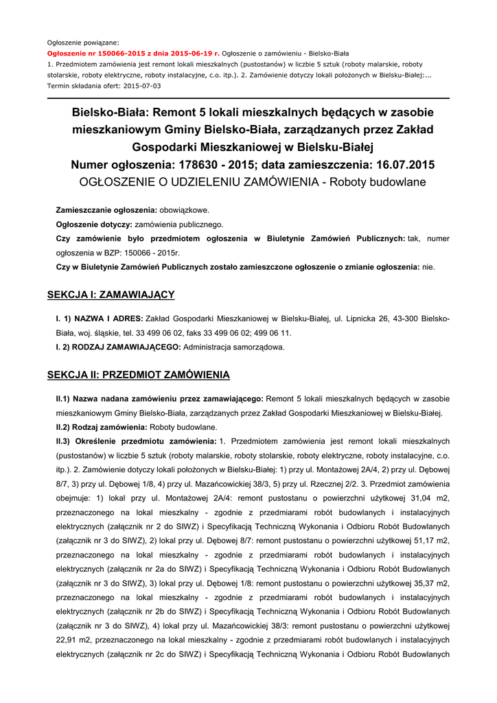 Ogłoszenie powiązane: Ogłoszenie nr 150066-2015 z dnia 2015-06-19 r. Ogłoszenie o zamówieniu - Bielsko-Biała 1. Przedmiotem zamówienia jest remont lokali mieszkalnych (pustostanów) w liczbie 5 sztuk (roboty malarskie, roboty stolarskie, roboty elektryczne, roboty instalacyjne, c.o. itp.). 2. Zamówienie dotyczy lokali położonych w Bielsku-Białej:... Termin składania ofert: 2015-07-03 Bielsko-Biała: Remont 5 lokali mieszkalnych będących w zasobie mieszkaniowym Gminy Bielsko-Biała, zarządzanych przez Zakład Gospodarki Mieszkaniowej w Bielsku-Białej Numer ogłoszenia: 178630 - 2015; data zamieszczenia: 16.07.2015 OGŁOSZENIE O UDZIELENIU ZAMÓWIENIA - Roboty budowlane Zamieszczanie ogłoszenia: obowiązkowe. Ogłoszenie dotyczy: zamówienia publicznego. Czy zamówienie było przedmiotem ogłoszenia w Biuletynie Zamówień Publicznych: tak, numer ogłoszenia w BZP: 150066 - 2015r. Czy w Biuletynie Zamówień Publicznych zostało zamieszczone ogłoszenie o zmianie ogłoszenia: nie. SEKCJA I: ZAMAWIAJĄCY I. 1) NAZWA I ADRES: Zakład Gospodarki Mieszkaniowej w Bielsku-Białej, ul. Lipnicka 26, 43-300 BielskoBiała, woj. śląskie, tel. 33 499 06 02, faks 33 499 06 02; 499 06 11. I. 2) RODZAJ ZAMAWIAJĄCEGO: Administracja samorządowa. SEKCJA II: PRZEDMIOT ZAMÓWIENIA II.1) Nazwa nadana zamówieniu przez zamawiającego: Remont 5 lokali mieszkalnych będących w zasobie mieszkaniowym Gminy Bielsko-Biała, zarządzanych przez Zakład Gospodarki Mieszkaniowej w Bielsku-Białej. II.2) Rodzaj zamówienia: Roboty budowlane. II.3) Określenie przedmiotu zamówienia: 1. Przedmiotem zamówienia jest remont lokali mieszkalnych (pustostanów) w liczbie 5 sztuk (roboty malarskie, roboty stolarskie, roboty elektryczne, roboty instalacyjne, c.o. itp.). 2. Zamówienie dotyczy lokali położonych w Bielsku-Białej: 1) przy ul. Montażowej 2A/4, 2) przy ul. Dębowej 8/7, 3) przy ul. Dębowej 1/8, 4) przy ul. Mazańcowickiej 38/3, 5) przy ul. Rzecznej 2/2. 3. Przedmiot zamówienia obejmuje: 1) lokal przy ul. Montażowej 2A/4: remont pustostanu o powierzchni użytkowej 31,04 m2, przeznaczonego na lokal mieszkalny - zgodnie z przedmiarami robót budowlanych i instalacyjnych elektrycznych (załącznik nr 2 do SIWZ) i Specyfikacją Techniczną Wykonania i Odbioru Robót Budowlanych (załącznik nr 3 do SIWZ), 2) lokal przy ul. Dębowej 8/7: remont pustostanu o powierzchni użytkowej 51,17 m2, przeznaczonego na lokal mieszkalny - zgodnie z przedmiarami robót budowlanych i instalacyjnych elektrycznych (załącznik nr 2a do SIWZ) i Specyfikacją Techniczną Wykonania i Odbioru Robót Budowlanych (załącznik nr 3 do SIWZ), 3) lokal przy ul. Dębowej 1/8: remont pustostanu o powierzchni użytkowej 35,37 m2, przeznaczonego na lokal mieszkalny - zgodnie z przedmiarami robót budowlanych i instalacyjnych elektrycznych (załącznik nr 2b do SIWZ) i Specyfikacją Techniczną Wykonania i Odbioru Robót Budowlanych (załącznik nr 3 do SIWZ), 4) lokal przy ul. Mazańcowickiej 38/3: remont pustostanu o powierzchni użytkowej 22,91 m2, przeznaczonego na lokal mieszkalny - zgodnie z przedmiarami robót budowlanych i instalacyjnych elektrycznych (załącznik nr 2c do SIWZ) i Specyfikacją Techniczną Wykonania i Odbioru Robót Budowlanych (załącznik nr 3 do SIWZ), 5) lokal przy ul. Rzecznej 2/2: remont pustostanu o powierzchni użytkowej 33,83 m2, przeznaczonego na lokal mieszkalny - zgodnie z przedmiarami robót budowlanych i instalacyjnych elektrycznych (załącznik nr 2d do SIWZ) i Specyfikacją Techniczną Wykonania i Odbioru Robót Budowlanych (załącznik nr 3 do SIWZ). II.4) Wspólny Słownik Zamówień (CPV): 45.21.13.41-1, 45.42.10.00-4, 45.42.11.00-5, 45.44.21.00-8, 45.31.00.00-3, 45.33.00.00-9, 45.33.30.00-0, 45.26.26.00-7, 45.33.10.00-6. SEKCJA III: PROCEDURA III.1) TRYB UDZIELENIA ZAMÓWIENIA: Przetarg nieograniczony III.2) INFORMACJE ADMINISTRACYJNE • Zamówienie dotyczy projektu/programu finansowanego ze środków Unii Europejskiej: nie SEKCJA IV: UDZIELENIE ZAMÓWIENIA IV.1) DATA UDZIELENIA ZAMÓWIENIA: 15.07.2015. IV.2) LICZBA OTRZYMANYCH OFERT: 1. IV.3) LICZBA ODRZUCONYCH OFERT: 0. IV.4) NAZWA I ADRES WYKONAWCY, KTÓREMU UDZIELONO ZAMÓWIENIA: • F.U.H. COMPLEXBUD Łukasz Hansel, ul. Korczaka 34, 43-300 Bielsko-Biała, kraj/woj. śląskie. • M-TECH Marcin Kiszka, Mazańcowice 767, 43-391 Mazańcowice, kraj/woj. śląskie. IV.5) Szacunkowa wartość zamówienia (bez VAT): 39809,48 PLN. IV.6) INFORMACJA O CENIE WYBRANEJ OFERTY ORAZ O OFERTACH Z NAJNIŻSZĄ I NAJWYŻSZĄ CENĄ • Cena wybranej oferty: 42830,87 • Oferta z najniższą ceną: 42830,87 / Oferta z najwyższą ceną: 42830,87 • Waluta: PLN. W imieniu Zamawiającego Anna Nawrocka …………………………………………. Dyrektor Zakładu Gospodarki Mieszkaniowej w Bielsku-Białej Tablica ogłoszeń ZGM: ………………….. - …………………..