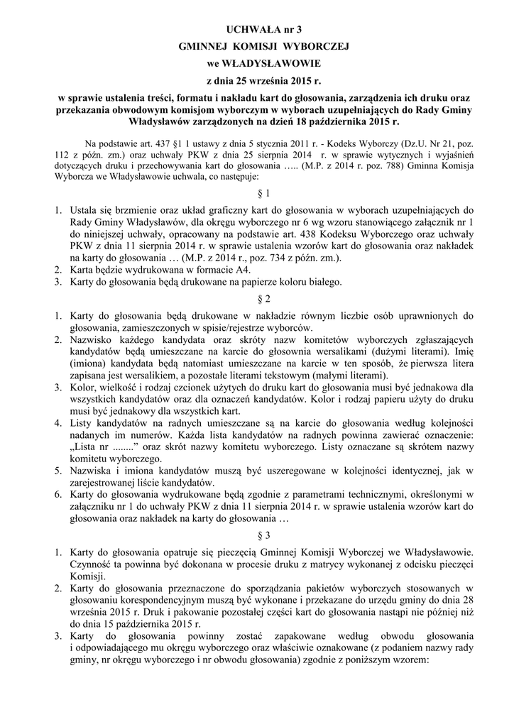UCHWAŁA nr 3 GMINNEJ KOMISJI WYBORCZEJ we WŁADYSŁAWOWIE z dnia 25 września 2015 r. w sprawie ustalenia treści, formatu i nakładu kart do głosowania, zarządzenia ich druku oraz przekazania obwodowym komisjom wyborczym w wyborach uzupełniających do Rady Gminy Władysławów zarządzonych na dzień 18 października 2015 r. Na podstawie art. 437 §1 1 ustawy z dnia 5 stycznia 2011 r. - Kodeks Wyborczy (Dz.U. Nr 21, poz. 112 z późn. zm.) oraz uchwały PKW z dnia 25 sierpnia 2014 r. w sprawie wytycznych i wyjaśnień dotyczących druku i przechowywania kart do głosowania ….. (M.P. z 2014 r. poz. 788) Gminna Komisja Wyborcza we Władysławowie uchwala, co następuje: §1 1. Ustala się brzmienie oraz układ graficzny kart do głosowania w wyborach uzupełniających do Rady Gminy Władysławów, dla okręgu wyborczego nr 6 wg wzoru stanowiącego załącznik nr 1 do niniejszej uchwały, opracowany na podstawie art. 438 Kodeksu Wyborczego oraz uchwały PKW z dnia 11 sierpnia 2014 r. w sprawie ustalenia wzorów kart do głosowania oraz nakładek na karty do głosowania … (M.P. z 2014 r., poz. 734 z późn. zm.). 2. Karta będzie wydrukowana w formacie A4. 3. Karty do głosowania będą drukowane na papierze koloru białego. §2 1. Karty do głosowania będą drukowane w nakładzie równym liczbie osób uprawnionych do głosowania, zamieszczonych w spisie/rejestrze wyborców. 2. Nazwisko każdego kandydata oraz skróty nazw komitetów wyborczych zgłaszających kandydatów będą umieszczane na karcie do głosownia wersalikami (dużymi literami). Imię (imiona) kandydata będą natomiast umieszczane na karcie w ten sposób, że pierwsza litera zapisana jest wersalikiem, a pozostałe literami tekstowym (małymi literami). 3. Kolor, wielkość i rodzaj czcionek użytych do druku kart do głosowania musi być jednakowa dla wszystkich kandydatów oraz dla oznaczeń kandydatów. Kolor i rodzaj papieru użyty do druku musi być jednakowy dla wszystkich kart. 4. Listy kandydatów na radnych umieszczane są na karcie do głosowania według kolejności nadanych im numerów. Każda lista kandydatów na radnych powinna zawierać oznaczenie: „Lista nr ........” oraz skrót nazwy komitetu wyborczego. Listy oznaczane są skrótem nazwy komitetu wyborczego. 5. Nazwiska i imiona kandydatów muszą być uszeregowane w kolejności identycznej, jak w zarejestrowanej liście kandydatów. 6. Karty do głosowania wydrukowane będą zgodnie z parametrami technicznymi, określonymi w załączniku nr 1 do uchwały PKW z dnia 11 sierpnia 2014 r. w sprawie ustalenia wzorów kart do głosowania oraz nakładek na karty do głosowania … §3 1. Karty do głosowania opatruje się pieczęcią Gminnej Komisji Wyborczej we Władysławowie. Czynność ta powinna być dokonana w procesie druku z matrycy wykonanej z odcisku pieczęci Komisji. 2. Karty do głosowania przeznaczone do sporządzania pakietów wyborczych stosowanych w głosowaniu korespondencyjnym muszą być wykonane i przekazane do urzędu gminy do dnia 28 września 2015 r. Druk i pakowanie pozostałej części kart do głosowania nastąpi nie później niż do dnia 15 października 2015 r. 3. Karty do głosowania powinny zostać zapakowane według obwodu głosowania i odpowiadającego mu okręgu wyborczego oraz właściwie oznakowane (z podaniem nazwy rady gminy, nr okręgu wyborczego i nr obwodu głosowania) zgodnie z poniższym wzorem: KARTY DO GŁOSOWANIA Wybory uzupełniające do Rady Gminy Władysławów Obwód głosowania nr .............. Okręg wyborczy nr .................. Liczba kart do głosowania .................... §4 1. Druk kart do głosowania winien odbywać się z zachowaniem warunków najwyższej staranności, z uwzględnieniem zasad kontroli określonych w uchwale PKW z dnia 25 sierpnia 2014 r. w sprawie wytycznych i wyjaśnień dotyczących druku i przechowywania kart do głosowania ….. 2. Wprowadza się następujące zasady kontroli druku kart - do bezwzględnego przestrzegania: 1) Korektę składów kart do głosowania w zakresie zgodności z ustaloną treścią karty i jej wzorem prowadzą dwa niezależnie od siebie działające zespoły wyznaczonych pracowników Urzędu Gminy Władysławów. Stwierdzone błędy oba zespoły wzajemnie konfrontują i przekazują wykonawcy (kierownikowi drukarni), zatrzymując po 1 egz. odbitki karty. Po usunięciu błędów, zespoły dokonują ponownego sprawdzenia kart do głosowania na podstawie materiału wyjściowego, tj. ustalonej treści karty; 2) Ostatecznej kontroli składu każdej karty do głosowania dokonują wyznaczeni członkowie Gminnej Komisji Wyborczej we Władysławowie, którzy zezwalają na uruchomienie druku pełnego nakładu karty, wspólnie podpisując kartę do druku. 3) W zakładzie drukującym karty konieczne jest zapewnienie dyżuru w przeddzień wyborów i w dniu głosowania. §5 Przekazanie kart do głosowania obwodowym komisjom wyborczym następuje w trybie i terminie określonym przez Komisarza Wyborczego w Koninie. Przekazanie kart do głosowania powinno nastąpić w formie protokolarnej. Karty do głosowania przyjmują co najmniej trzy osoby wchodzące w skład obwodowej komisji wyborczej, w tym przewodniczący komisji lub jego zastępca. §6 Wykonanie uchwały powierza się Wójtowi Gminy Władysławów §7 Uchwała wchodzi w życie z dniem podjęcia. Przewodniczący Gminnej Komisji Wyborczej we Władysławowie /-/ Beata Turos Załącznik nr 1 do uchwały nr 3 Gminnej Komisji Wyborczej we Władysławowie z dnia 25 września 2015 r. Załącznik nr 2 do uchwały nr 3 Gminnej Komisji Wyborczej we Władysławowie z dnia 25 września 2015 r. NAKŁAD KART DO GŁOSOWANIA W WYBORACH DO RADY GMINY WŁADYSŁAWÓW ZARZĄDZONYCH NA DZIEŃ 18 PAŹDZIERNIKA 2015 R. , L.P. NR OKRĘGU WYBORCZEGO LICZBA OSÓB UPRAWNIONYCH DO GŁOSOWANIA 1. 6 417 LICZBA WYDRUKOWNYCH FORMAT KOLOR UWAGI KART 400 A4 biały
