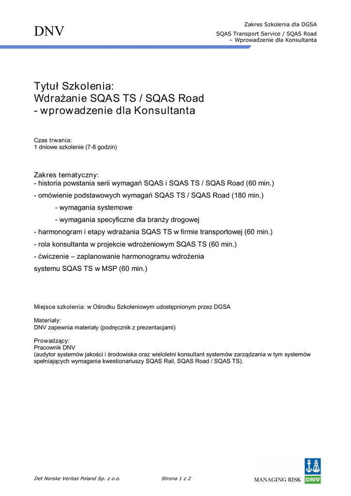 Zakres Szkolenia dla DGSA DNV SQAS Transport Service / SQAS Road – Wprowadzenie dla Konsultanta Tytuł Szkolenia: Wdrażanie SQAS TS / SQAS Road wprowadzenie dla Konsultanta Czas trwania: 1 dniowe szkolenie (78 godzin) Zakres tematyczny: historia powstania serii wymagań SQAS i SQAS TS / SQAS Road (60 min.) omówienie podstawowych wymagań SQAS TS / SQAS Road (180 min.) wymagania systemowe wymagania specyficzne dla branży drogowej harmonogram i etapy wdrażania SQAS TS w firmie transportowej (60 min.) rola konsultanta w projekcie wdrożeniowym SQAS TS (60 min.) ćwiczenie – zaplanowanie harmonogramu wdrożenia systemu SQAS TS w MSP (60 min.) Miejsce szkolenia: w Ośrodku Szkoleniowym udostępnionym przez DGSA Materiały: DNV zapewnia materiały (podręcznik z prezentacjami) Prowadzący: Pracownik DNV (audytor systemów jakości i środowiska oraz wieloletni konsultant systemów zarządzania w tym systemów spełniających wymagania kwestionariuszy SQAS Rail, SQAS Road / SQAS TS). Det Norske Veritas Poland Sp. z o.o. Strona 1 z 2 Zakres Szkolenia dla DGSA DNV SQAS Transport Service / SQAS Road – Wprowadzenie dla Konsultanta Wprowadzenie do systemów SQAS Transport Service Przemysł Chemiczny w znacznej mierze korzysta z usług podwykonawców w zakresie transportu materiałów, półproduktów i produktów chemicznych. Firmy chemiczne w ramach strategii odpowiedzialnego biznesu, potrzebują zapewnienia, że działania te są prowadzone w sposób zaplanowany, odpowiedzialny i bezpieczny dla pracowników, społeczności i środowiska. W przeszłości nadzór nad bezpieczeństwem i jakością przewozów był zapewniony poprzez przeprowadzanie przez Firmy Chemiczne audytów u swoich podwykonawców – takie rozwiązanie było drogie i nieefektywne zarówno dla producenta jak i usługodawcy w procesach transportowych. We wczesnych latach 90tych Zrzeszenie Producentów Przemysłu Chemicznego CEFIC w ramach programu Responsible Care nakierowanego na poprawę bezpieczeństwa podczas przewozu, magazynowania substancji chemicznych rozpoczął pracę nad opracowaniem Kwestionariusza SQAS Road jako systemowego narzędzia do oceny systemu jakości i bezpieczeństwa u dostawcy usług logistycznych. Od 1 stycznia roku 2007 standard SQAS Road po weryfikacji zostanie zastąpiony przez SQAS TS (SQAS Transport Service). System SQAS Transport Service / Road (Safety and Quality Assessment System – system oceny jakości i bezpieczeństwa) w przewozie towarów niebezpiecznych, składa się z kwestionariusza (checklisty) oraz wskazówek do audytowania systemu. Sprawdzanie stopnia wdrożenia systemu przeprowadzanie jest przez niezależnego weryfikatora – zaakceptowanego i zarejestrowanego w bazie w CEFIC. Weryfikacje przeprowadzane są co 3 lata, a wyniki umieszczane w plikach bazy danych dostępnej dla Członków Zrzeszonych w CEFIC. Kilka Faktów na temat SQAS TS: • System oceny – 436 pytań w tym 80% to pytania specyficzne dla Transportu Drogowego • Spełnienie ok. 80% wymagań SQAS TS w zasadzie daje pewność możliwości uzyskania certyfikatów ISO 9001 / ISO 14001 / OHSAS 18001 • Struktura wymagań: • Zarządzanie (50 pytań) • BHP i Środowisko (27) • Bezpieczeństwo (16) • Zarządzanie łańcuchem logistycznym i podwykonawcami (50) • Wyposażenie (53) • BBS – behaviour based safety; dobre praktyki bezpieczeństwa (22) • Bezpieczeństwo podczas transportu (28) • Procedury operacyjne i kontakt z klientem (48) • Działania związane z realizacją zamówienia (86) • Specyficzne rodzaje usług transportowych (14) • Inspekcja budynków (42) W związku z coraz większym zainteresowaniem producentów Chemicznych posiadaniem przez firmy transportowe „gwarancji” bezpieczeństwa, szacuje się, że w najbliższych 35 latach większość z firm zajmujących się transportem towarów niebezpiecznych podda się weryfikacji SQAS. Na dzień dzisiejszy, ocenie SQAS Road poddało się ok. 1000 firm w Europie. • Niemcy (296) • Francja (122) • Wielka Brytania (89) • Hiszpania (83) • Polska (19 firm) Zdobycie wiedzy na temat wymagań SQAS TS daje możliwość podniesienia kompetencji DORADCY oraz poszerzenia możliwości obsługi Klientów – poprzez konsulting w zakresie wdrażania SQAS, przygotowania systemu do weryfikacji SQAS, utrzymania i nadzoru nad systemem SQAS. Więcej informacji na stronach: http://www.sqas.org/ts/index.html Det Norske Veritas Poland Sp. z o.o. Strona 2 z 2