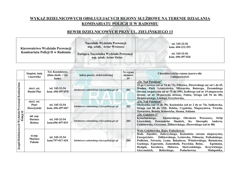 WYKAZ DZIELNICOWYCH OBSŁUGUJĄCYCH REJONY SŁUŻBOWE NA TERENIE DZIAŁANIA KOMISARIATU POLICJI II W RADOMIU REWIR DZIELNICOWYCH PRZY UL. ZIELIŃSKIEGO 13 Kierownictwo Wydziału Prewencji Komisariatu Policji II w Radomiu Zespół Dzielnicowych Wydziału Prewencji Komisariatu Policji II Stopień, imię i nazwisko Tel. Kontaktowy (linia służb. + tel. kom.) Naczelnik Wydziału Prewencji asp. sztab. Artur Wrzeszcz tel. 345-32-56 kom. 604-212-393 Zastępca Naczelnika Wydziału Prewencji asp. sztab. Artur Ocios tel. 345-32-56 kom. 696-497-026 Adres poczty elektronicznej Nr rejonu służbowe go sierż. szt. Daniel Plęs tel. 345-32-54 kom. 696-497-070 dzielnicowy.radomskiego [email protected] 201 sierż. szt. Piotr Dorożyński tel. 345-32-54 kom. 696-497-067 dzielnicowy.radomskiego [email protected] 202 mł. asp. Dariusz Rektus tel. 345-32-54 kom.696-497-033 dzielnicowy.radomskiego [email protected] 203 st.asp. Mariusz Pakuła tel. 345-32-54 kom.797-017-424 dzielnicowy.radomskiego [email protected] 204 Charakterystyka rejonu (nazwa ulic i miejscowości) „Os. Nad Potokiem” 25-go Czerwca (od nr 54 do 72), Filtrowa, Zbrowskiego (nr od 1 do 45, Wodna, Park Leśniczówka, Młynarska, Batorego, Żeromskiego (Strona nieparzysta od nr 75 do 109), Kolberga (od nr 15-nieparzysta strona; od nr 20-parzysta strona), Fałata, Struga (od 54 do 60), Siemierackiego, Lindego, Grzybowska, „Os. Nad Potokiem” Olsztyńska (od 25 do 39), Kozienicka (od nr 2 do nr 74), Sadkowska, Struga (od 88 do 110), Daleka, Cygańska, Magazynowa, Twarda, Towarowa, Beneta, Katowicka, Sienna, Szklana „Os. Gołębiów I” Kotarbińskiego, Zientarskiego, Obrońców Warszawy, Orląt Lwowskich, Powstańców Śląskich, Ks. Skorupki, Andersa, Gołębiowska, Gryczana, Żółkiewskiego, Zbrowskiego (od nr 80) Wola Gołębiowska, Rajec Poduchowny Rodz. Ziętalów, Zubrzyckiego, Kozienicka (strona nieparzysta), Energetyków, Żółkiewskiego, Lesiowska, Północna, Potkańskiego, Podleśna, Nowacia, Lema, Bakalarza, Wiśniewskiego, Botaniczna, Gackiego, Esperanto, Zamenhofa, Pacyńska, Beina, Egeimana, Hempla, Koralowa, Makowa, Skowrońskiego, Krzywickiego, Gierymskich, Bełżeckiego, Poduchowna, Małopolska, asp. Wojciech Minda p.o. dzielnicowego sierż. szt. Sławomir Kopeć asp. szt. Sławomir Węgrzyn tel. 345-32-56 tel. 696-497-020 dzielnicowy.radomskiego [email protected] 205 tel. 345-32-56 tel. 696-497-034 dzielnicowy.radomskiego [email protected] 206 tel. 3453254 kom. 600-449-277 dzielnicowy.radomskiego [email protected] 207 st.asp. Dominik Barszcz tel. 345-32-56 kom.600-493-452 dzielnicowy.radomskiego [email protected] 208 mł. asp. Radosław Ślusarczyk tel. 345-32-56 kom.797-017-538 dzielnicowy.radomskiego [email protected] 209 Chmielnickiego, Haliny Hermanowicz. Marii Gajl, Kędzierskiego, Królikowskiego, Zwolińskiego. Kozienicka (od nr 76 strona parzysta) „Os. Sadków”, Długojów, Malenice Poranna, Lubelska (od nr 118), Lotnicza, Ogrodnicza (od nr 68), Hubalczyków, Inspektowa, Reymonta, Skaryszewska, Potrzebna, Skrzydlata, Bystra, Kmicica, Płaska, Szara, Malenicka, Tęczowa, Rzeckiego, Błękitna, Oleńki, Leszczynowa, Grota-Roweckiego, Szeroka Droga, Słowackiego (strona nieparzysta od nr 171), Wojska Polskiego „Os. Dzierzków”, Glinice Ciemna, Gdańska, Długojowska, Dzielna, Daleka, Giserska, Górna, Gromadzka, Janowiecka, Jasna, Kaszubska, Kościelna, Kwiatowa, Krzyżowa, Komunalna, Kochanowskiego, Kalińska, Kozienicka, Ludwinowska, Lechicka, Lubelska, Metalowa, Miedziana, Małęczyńska, Magazynowa, Nałęczowska, Okrzei, Odrodzenia, Ogrodnicza, Odechowska, Promyka, Puławska, Podmiejska, Pomorska, Średnia, Szeregowa, Wróblewskiego, Wrocławska, Wesoła, Twarda, Tadeuszowska, Zwoleńska, Przelotna, Smolna, Szeregowa, Szczecińska, Słowackiego (od nr 57 do 169 i od 24 do 146), Pomorska, Żurawia, Akacjowa, Słowackiego (od nr 22 i 51 do ronda z ul. Grzecznarowskiego) „Os. Czachówek” Czachowskiego, Nowogrodzka, Dzierzkowska, 25-goCzerwca (od 2 do 52), Żeromskiego (od 74 do 120), Zacisze, Prażmowskiego (od 22 do Czachowskiego), Słowackiego (od 2 do 22 i od 19 do 51), Czachowskiego, Żeromskiego (od 25 ego Czerwca do wiaduktu) „Os. Glinice” Biała, Błotnia, Czeremchowa, Domagalskiego, Dygasińskiego, Dąbrowskiego, Fabryczna, Grzecznarowskiego, Graniczna, Hoża, Inwalidów Woj., Jarzynowa, Jaśminowa, Kolejowa, Kośna, Kwiatkowskiego, Klinowa, Konopnickiej, Lubońskiego, Mikołaja z Radomia, Makowska, Niemcewicza, Norwida, Owocowa, Poznańska, Placowa, Prosta, Pusta, Strzelecka, Śląska, Wrześniowskiego, Wschodnia, Zagłoby, Zielińskiego, Zapolskiej „Os. Idalin”, Janiszpol Bursztynowa, Bluszczowa, Bliska, Brzechwy, Bieszczadzka, Banacha, Brailla, Bacewicza, Borowa, Diamentowa, Derkacza, Deparasińskiego, Gdańska, Gliwicka, Gnieźnieńska, Gałczyńskiego, Gojawiczyńskiej, Gołaszewskiego, Grzebieniowa, Galla, Indycza, Idalińska, Iwaszkiewicza, Jagodowa, Janiszpolska, Sadowa, Korczaka, Kruczkowskiego, Kasprowicza, Laskowa, Ludowa, Łomżyńska, Makuszyńskiego, Matejki, Mazowiecka, Mikosa, Milenijna, Majątkowa, Nałkowskiej, Naruszewicza, Osińskiego, Połabska, Perłowa, Przejazd, Piękna, Paciaka, Rzeszowska, Równoległa, Rumiankowa, Szmaragdowa, Starachowicka, Kalinowa, Piotra Skargi, Sołtykowska, Studzienna, Śnieżna, Świerkowa, Wiosenna, Willowa, Wiśniowa, Wiertnicza, Wnukowskiego, Wodociągowa, Tuwima, Zbożowa, Zamknięta, Wyścigowa, Syrokomli, Długosza, Jarzębinowa, Majowa, Źródłowa, Bacha, Witkacego, Jastrzębskiego, Słowackiego (od ronda z ul. Grzecznarowskiego) st.asp. Tomasz Pałgan tel. 345-32-56 kom.797-017-423 dzielnicowy.radomskiego [email protected] 210 p.o. dzielnicowego st. sierż. Przemysław Kowalczyk Tel. 345-32-55 kom.797-017-539 dzielnicowy.radomskiego [email protected] 211 sierż. szt. Marcin Błesznowski tel. 345-32-54 kom.797-017-422 dzielnicowy.radomskiego [email protected] 212 st.asp. Wojciech Kogut tel. 345-32-56 kom.797-017-425 dziel