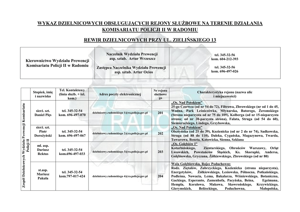 Wykaz dzielnicowych Komisariatu II Policji w Radomiu
