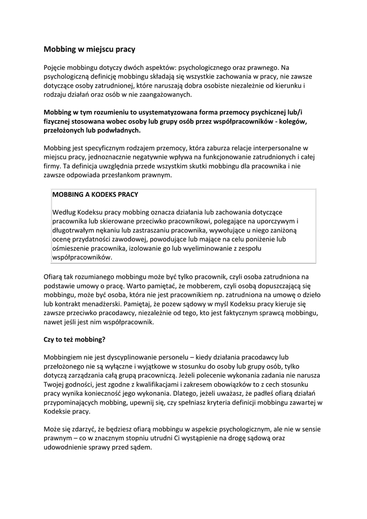 Mobbing w miejscu pracy Pojęcie mobbingu dotyczy dwóch aspektów: psychologicznego oraz prawnego. Na psychologiczną definicję mobbingu składają się wszystkie zachowania w pracy, nie zawsze dotyczące osoby zatrudnionej, które naruszają dobra osobiste niezależnie od kierunku i rodzaju działań oraz osób w nie zaangażowanych. Mobbing w tym rozumieniu to usystematyzowana forma przemocy psychicznej lub/i fizycznej stosowana wobec osoby lub grupy osób przez współpracowników - kolegów, przełożonych lub podwładnych. Mobbing jest specyficznym rodzajem przemocy, która zaburza relacje interpersonalne w miejscu pracy, jednoznacznie negatywnie wpływa na funkcjonowanie zatrudnionych i całej firmy. Ta definicja uwzględnia przede wszystkim skutki mobbingu dla pracownika i nie zawsze odpowiada przesłankom prawnym. MOBBING A KODEKS PRACY Według Kodeksu pracy mobbing oznacza działania lub zachowania dotyczące pracownika lub skierowane przeciwko pracownikowi, polegające na uporczywym i długotrwałym nękaniu lub zastraszaniu pracownika, wywołujące u niego zaniżoną ocenę przydatności zawodowej, powodujące lub mające na celu poniżenie lub ośmieszenie pracownika, izolowanie go lub wyeliminowanie z zespołu współpracowników. Ofiarą tak rozumianego mobbingu może być tylko pracownik, czyli osoba zatrudniona na podstawie umowy o pracę. Warto pamiętać, że mobberem, czyli osobą dopuszczającą się mobbingu, może być osoba, która nie jest pracownikiem np. zatrudniona na umowę o dzieło lub kontrakt menadżerski. Pamiętaj, że pozew sądowy w myśl Kodeksu pracy kieruje się zawsze przeciwko pracodawcy, niezależnie od tego, kto jest faktycznym sprawcą mobbingu, nawet jeśli jest nim współpracownik. Czy to też mobbing? Mobbingiem nie jest dyscyplinowanie personelu – kiedy działania pracodawcy lub przełożonego nie są wyłączne i wyjątkowe w stosunku do osoby lub grupy osób, tylko dotyczą zarządzania całą grupą pracowniczą. Jeżeli polecenie wykonania zadania nie narusza Twojej godności, jest zgodne z kwalifikacjami i zakresem obowiązków to z cech stosunku pracy wynika konieczność jego wykonania. Dlatego, jeżeli uważasz, że padłeś ofiarą działań przypominających mobbing, upewnij się, czy spełniasz kryteria definicji mobbingu zawartej w Kodeksie pracy. Może się zdarzyć, że będziesz ofiarą mobbingu w aspekcie psychologicznym, ale nie w sensie prawnym – co w znacznym stopniu utrudni Ci wystąpienie na drogę sądową oraz udowodnienie sprawy przed sądem. Przesłanki definicji kodeksowej muszą być spełnione łącznie, co oznacza, że przed sądem będziesz musiał udowodnić istnienie wszystkich elementów. To sąd pracy orzeka, czy mobbing zaistniał. Rozpoznaj mobbing Jeżeli twierdzisz, że jesteś ofiarą mobbingu, to zanim wystąpisz na drogę sądową, zastanów się, czy spełniasz kryteria prawne pozwalające uznać Cię za faktyczną ofiarę tych praktyk: Czy zachowania lub działania uważane za mobbing są uporczywe i długotrwałe? Ważna jest nie tyle Twoja subiektywna ocena, ile obiektywny czas trwania i nasilenie zachowań. Na pewno mobbing nie może wystąpić jednorazowo; możemy mówić o nim, jeśli nękanie i zastraszanie trwa przez co najmniej 6 miesięcy od pierwszych sygnałów. Sąd bada każdy przypadek mobbingu oddzielnie. Warto jednak pamiętać, że w sprawach mobbingowych funkcjonuje wzorzec tzw. ofiary rozsądnej. Oznacza to, że są osoby bardziej i mniej podatne na stres oraz radzące sobie lepiej lub gorzej ze stresem wywołanym mobbingiem. Sąd m.in. przy pomocy biegłego sądowego oceni Twoją sytuację. Czy działania lub zachowania mobbingujące budzą Twój jednoznaczny sprzeciw? Sam mobbing jako zjawisko psychologiczne nie jest karalny. Liczy się skutek mobbingu oraz jednoznaczny sprzeciw przeciwko takim praktykom. Odwiedź lekarza Oceń i sprawdź diagnostycznie czy doznałeś rozstroju zdrowia. Jeżeli tak, to musisz go obiektywnie wykazać. Warto uzyskać długoterminowe zwolnienie chorobowe od psychiatry lub innego lekarza specjalisty, wskazujące na tzw. objawy osiowe, czyli dominujące w reakcji organizmu, np.: w sferze neurologicznej, kardiologicznej itp. Za rozstrój zdrowia wywołany mobbingiem przysługuje Ci zadośćuczynienie w nielimitowanej kwocie. Znaczenie ma stopień utraty zdrowia, następstwa zawodowe, prywatne, społeczne itp. Ustal fakty Jeżeli wystąpił u Ciebie rozstrój zdrowia ustal jego związek z mobbingiem, Czy jesteś gotowy do wypowiedzenia umowy o pracę? Pamiętaj, że jedynie wypowiedzenie złożone na piśmie upoważnia Cię do odszkodowania, Zbierz odpowiednie dowody potwierdzające zaistnienie mobbingu. W przypadku mobbingu to Ty musisz udowodnić, że mobbing rzeczywiście zaistniał. Zawsze możesz zasięgnąć pomocy prawnej w Państwowej Inspekcji Pracy. Więcej informacji na stronie www.pip.gov.pl Pamiętaj jednak! PIP nie orzeka o istnieniu mobbingu w zakładzie pracy. Inspektor pracy jedynie weryfikuje prawdopodobieństwo wystąpienia działań noszących znamiona mobbingu na podstawie stworzonej przez PIP GIP anonimowej ankiety antymobbingowej. Naucz się bronić Zapisuj wszystkie niepokojące zachowania i działania mobbingowe, notuj miejsce, czas oraz okoliczności im towarzyszące, Rozmawiaj na temat Twojej sytuacji z jak największą liczbą osób, Szukaj pomocy poza pracą, Przechowuj zapisy wszystkich incydentów, nawet jeśli nie ma na to świadków, Jeśli zauważysz pierwsze oznaki mobbingu, od razu rozmawiaj o tym z rodziną, kolegami, związkami zawodowymi, Szukaj możliwości mediacji – pierwsze problemy rozwiązuj polubownie, jeśli się nie uda, szukaj innych możliwości, Naucz się odpowiadać na zaczepki słowne, bądź asertywny. Wyrażaj własne emocje i zdanie bez naruszania godności osobistej rozmówcy. Nie reaguj agresją. Działania lub zachowania mobbingowe dzielą się na bezprawne np.: poniżanie, lekceważ