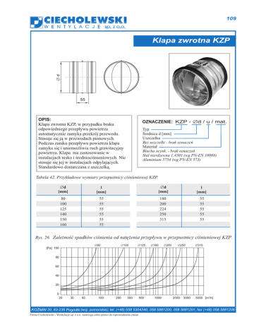 109 W E N T Y L A C J E sp. z o.o. Æd Klapa zwrotna KZP 55 OPIS: Klapa zwrotna KZP, w przypadku braku odpowiedniego przep³ywu powietrza automatycznie zamyka przekrój przewodu. Stosuje siê j¹ w przewodach pionowych. Podczas zaniku przep³ywu powietrza klapa zamyka siê i uniemo¿liwia ruch grawitacyjny powietrza. Klapa ma zastosowanie w instalacjach nisko i œredniociœnieniowych. Nie stosuje siê jej w instalacjach odpylaj¹cych. Standardowo dostarczana z uszczelk¹. OZNACZENIE: KZP - Æd / u / mat. Typ Œrednica d [mm] Uszczelka Bez uszczelki - brak oznaczeñ Materia³ Blacha ocynk. - brak oznaczeñ Stal nierdzewna 1.4301 (wg PN-EN 10088) Aluminium 5754 (wg PN-EN 573) Tabela 42. Przyk³adowe wymiary przepustnicy ciœnieniowej KZP. Æd [mm] l [mm] Æd [mm] l [mm] 80 100 125 140 150 160 55 55 55 55 55 55 180 200 224 250 315 55 55 55 55 55 Rys. 26. Zale¿noœæ spadków ciœnienia od natê¿enia przep³ywu w przepustnicy ciœnieniowej KZP. Æ80 Æ100 Æ125 Æ160 Æ200 Æ250 Æ315 [Pa] 100 80 60 40 20 0 20 30, 83-236 30 50 100 200 300 500 1000 2000 3000 5000 [m3/h] (woj. pomorskie); tel. (+48) 058 5304340, 058 5881200, 058 5881201; fax (+48) 058 5881208 Firma Ciecholewski - Wentylacje sp. z o.o. zastrzega sobie prawo do wprowadzania zmian