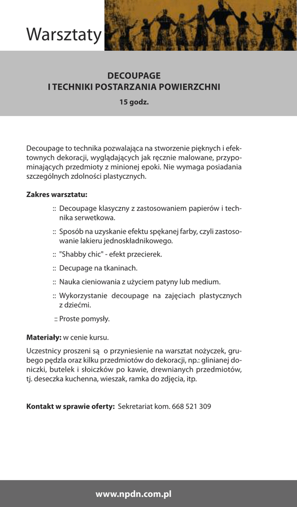 Warsztaty DECOUPAGE I TECHNIKI POSTARZANIA POWIERZCHNI 15 godz. Decoupage to technika pozwalająca na stworzenie pięknych i efektownych dekoracji, wyglądających jak ręcznie malowane, przypominających przedmioty z minionej epoki. Nie wymaga posiadania szczególnych zdolności plastycznych. Zakres warsztatu: :: Decoupage klasyczny z zastosowaniem papierów i technika serwetkowa. :: Sposób na uzyskanie efektu spękanej farby, czyli zastosowanie lakieru jednoskładnikowego. :: "Shabby chic" - efekt przecierek. :: Decupage na tkaninach. :: Nauka cieniowania z użyciem patyny lub medium. :: Wykorzystanie decoupage na zajęciach plastycznych z dziećmi. :: Proste pomysły. Materiały: w cenie kursu. Uczestnicy proszeni są o przyniesienie na warsztat nożyczek, grubego pędzla oraz kilku przedmiotów do dekoracji, np.: glinianej doniczki, butelek i słoiczków po kawie, drewnianych przedmiotów, tj. deseczka kuchenna, wieszak, ramka do zdjęcia, itp. Kontakt w sprawie oferty: Sekretariat kom. 668 521 309 www.npdn.com.pl