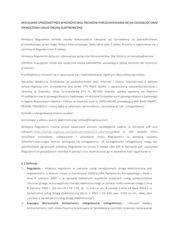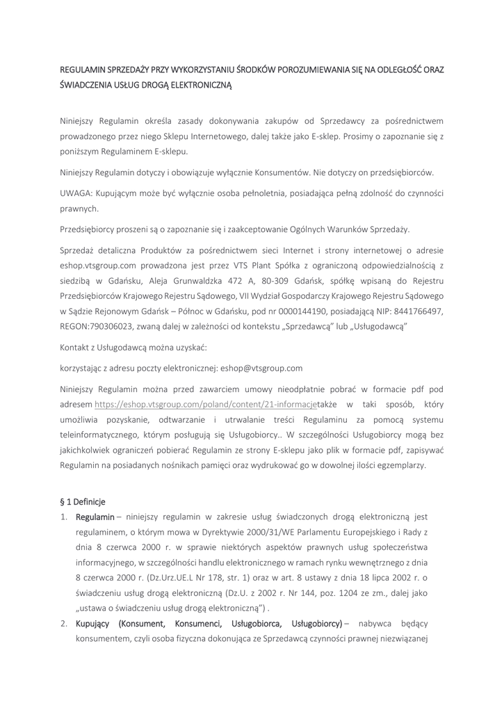 REGULAMIN SPRZEDAŻY PRZY WYKORZYSTANIU ŚRODKÓW POROZUMIEWANIA SIĘ NA ODLEGŁOŚĆ ORAZ ŚWIADCZENIA USŁUG DROGĄ ELEKTRONICZNĄ Niniejszy Regulamin określa zasady dokonywania zakupów od Sprzedawcy za pośrednictwem prowadzonego przez niego Sklepu Internetowego, dalej także jako E-sklep. Prosimy o zapoznanie się z poniższym Regulaminem E-sklepu. Niniejszy Regulamin dotyczy i obowiązuje wyłącznie Konsumentów. Nie dotyczy on przedsiębiorców. UWAGA: Kupującym może być wyłącznie osoba pełnoletnia, posiadająca pełną zdolność do czynności prawnych. Przedsiębiorcy proszeni są o zapoznanie się i zaakceptowanie Ogólnych Warunków Sprzedaży. Sprzedaż detaliczna Produktów za pośrednictwem sieci Internet i strony internetowej o adresie eshop.vtsgroup.com prowadzona jest przez VTS Plant Spółka z ograniczoną odpowiedzialnością z siedzibą w Gdańsku, Aleja Grunwaldzka 472 A, 80-309 Gdańsk, spółkę wpisaną do Rejestru Przedsiębiorców Krajowego Rejestru Sądowego, VII Wydział Gospodarczy Krajowego Rejestru Sądowego w Sądzie Rejonowym Gdańsk – Północ w Gdańsku, pod nr 0000144190, posiadającą NIP: 8441766497, REGON:790306023, zwaną dalej w zależności od kontekstu „Sprzedawcą” lub „Usługodawcą” Kontakt z Usługodawcą można uzyskać: korzystając z adresu poczty elektronicznej: [email protected] Niniejszy Regulamin można przed zawarciem umowy nieodpłatnie pobrać w formacie pdf pod adresem https://eshop.vtsgroup.com/poland/content/21-informacjetakże w taki sposób, który umożliwia pozyskanie, odtwarzanie i utrwalanie treści Regulaminu za pomocą systemu teleinformatycznego, którym posługują się Usługobiorcy.. W szczególności Usługobiorcy mogą bez jakichkolwiek ograniczeń pobierać Regulamin ze strony E-sklepu jako plik w formacie pdf, zapisywać Regulamin na posiadanych nośnikach pamięci oraz wydrukować go w dowolnej ilości egzemplarzy. § 1 Definicje 1. Regulamin – niniejszy regulamin w zakresie usług świadczonych drogą elektroniczną jest regulaminem, o którym mowa w Dyrektywie 2000/31/WE Parlamentu Europejskiego i Rady z dnia 8 czerwca 2000 r. w sprawie niektórych aspektów prawnych usług społeczeństwa informacyjnego, w szczególności handlu elektronicznego w ramach rynku wewnętrznego z dnia 8 czerwca 2000 r. (Dz.Urz.UE.L Nr 178, str. 1) oraz w art. 8 ustawy z dnia 18 lipca 2002 r. o świadczeniu usług drogą elektroniczną (Dz.U. z 2002 r. Nr 144, poz. 1204 ze zm., dalej jako „ustawa o świadczeniu usług drogą elektroniczną”) . 2. Kupujący (Konsument, Konsumenci, Usługobiorca, Usługobiorcy) – nabywca będący konsumentem, czyli osoba fizyczna dokonująca ze Sprzedawcą czynności prawnej niezwiązanej bezpośrednio z jej działalnością gospodarczą, handlową, zawodową, bądź rzemieślniczą, posiadająca pełną zdolność do czynności prawnych według porządku prawnego państwa członkowskiego, którego jest obywatelem, a która dokonuje lub zamierza dokonać Zamówienia lub korzysta z innych usług Sklepu Internetowego (konsument w rozumieniu art. 2 pkt 1 Dyrektywy Parlamentu Europejskiego i Rady 2011/83/UE z dnia 25 października 2011 r. w sprawie praw konsumentów, zmieniającej dyrektywę Rady 93/13/EWG i dyrektywę 1999/44/WE Parlamentu Europejskiego i Rady oraz uchylającej dyrektywę Rady 85/577/EWG i dyrektywę 97/7/WE Parlamentu Europejskiego i Rady z dnia 25 października 2011 r. (Dz.Urz.UE.L Nr 304, str. 64), dalej jako „Dyrektywa”, a także w rozumieniu art. 22 1 Kodeksu Cywilnego), będący także Usługobiorcą w rozumieniu ustawy o świadczeniu usług drogą elektroniczną. 3. Państwa Dostawy – państwa, do których możliwa jest dostawa Produktu/Produktów: Polska, Wielka Brytania, Irlandia, Czechy, Słowacja, Niemcy, Holandia, Francja, Szwecja, Dania, Austria, Belgia (wyłącznie w części europejskiej tych państw, tj. z wyłączeniem terytoriów zamorskich itp.) 4. Produkt (Produkty) – rzecz ruchoma w liczbie pojedynczej lub liczbie mnogiej z asortymentu Sprzedawcy, której dotyczy Umowa Sprzedaży. 5. Umowa Sprzedaży (Umowa) – umowa sprzedaży Produktów pomiędzy Sprzedawcą a Kupującym, z wykorzystaniem Sklepu Internetowego, która wiąże się z obowiązkiem dokonania przez Kupującego zapłaty na rzecz Sprzedawcy całości ceny wskazanej przy zamawianym Produkcie oraz z pokryciem przez Kupującego kosztów przesyłki zamówionego Produktu. 6. Serwis(E-sklep, Sklep, Sklep Internetowy) – serwis internetowy Sprzedawcy dostępny pod adresem eshop.vtsgroup.com, za pośrednictwem którego Kupujący dokonuje zakupu Produktów. 7. Strona lub Strony – Sprzedawca/Usługodawca lub Kupujący/Usługobiorca. 8. Zamówienie – oświadczenie woli Kupującego określające jednoznacznie rodzaj i ilość Produktów, zmierzające bezpośrednio do zawarcia Umowy Sprzedaży na odległość za pośrednictwem Sklepu Internetowego. 9. Formularz Zamówienia – formularz dostępny na stronie Serwisu, za pomocą którego Kupujący może złożyć Zamówienie. 10. Klauzule – zgody w formie tzw. „check-boxów” w ramach formularza dostępnego na stronie Sklepu Internetowego na etapie rejestracji w Sklepie Internetowym, przy czym zaznaczenie zgody na treść niniejszego Regulaminu Sprzedaży i Polityki prywatności, oznacza także wyrażenie zgody na przesyłanie przez Sprzedawcę faktur drogą elektroniczną, zgodnie z treścią Regulaminu i jest niezbędne do zawarcia Umowy (z rejestracją i bez rejestracji), zaś zaznaczenie zgody na przetwarzanie danych osobowych w celu marketingowym oraz na przesyłanie informacji handlowej drogą elektroniczną ma charakter fakultatywny i nie wpływa na możliwość zawarcia Umowy (z rejestracją lub bez rejestracji). § 2 Zasady ogólne 1. Warunkiem złożenia Zamówienia w Sklepie Internetowym przez Kupującego jest zapoznanie się z niniejszym Regulaminem, wyrażenie akceptacji jego postanowień, zaznaczenie Klauzul ni