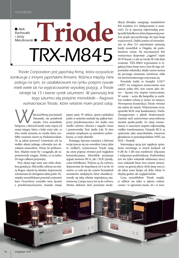 NPOPCMPLJ Triode ■"MFL 3BDIXBME J+FS[Z .JFT[LPXTLJ■ 539. 5SJPEF$PSQPSBUJPOKFTUKBQPTLhµSNhLUwSBPD[ZXJ½DJF LPOLVSVKF[JOOZNJKBQPTLJNJµSNBNJ3wÔOJDBNJE[ZOJNJ QPMFHBOBUZNÔFVTUBCJMJ[PXBOJOBSZOLVQPUÔOJSZXBMF NJFMJXJFMFMBUOBXZQSBDPXBOJFXZTPLJFKQP[ZDKJB5SJPEF JTUOJFKFMBUJCJFS[FSZOFLT[UVSNFN8QJFSXT[FKMJOJJ UFHPT[UVSNVJEhQPUÔOFNPOPCMPLJ¨¶BHPXF X[NBDOJBD[F5SJPEFLUwSFXB½OJFNBNQS[FETPCh 8 łaściciel firmy, pan Junichi Yamazaki, nie pożałował metalu. Dwa monobloki lampowe, z których każdy waży więcej od mojej integry, która z kolei waży tyle, co dwa worki cementu, to wynik, który zrobiłby wrażenie nawet na Pudzianowskim. To są jakieś potwory! Ustawienie ich na stoliku siłami jednego człowieka jest absolutnie niemożliwe. Wiem, bo próbowałem. Mięśnie może by i uciągnęły, ale zaprotestowały ścięgna. Matko, co za kolos. Do tego całkiem przystojny. Przy okazji tego testu sam sobie złożyłem gratulacje. Mój stolik, robiony na miarę Rogoz, okazał się idealnie dopasowany rozmiarami do dźwigania takiej parki. Pomiędzy monoblokami pozostał centymetr luzu. Oczywiście, wszystko inne, łącznie z przedwzmacniaczem, musiało stanąć NBHB[ZOIJGJ piętro niżej. W efekcie, oprócz piekielnej parki, w systemie znalazły się: piękny lampowy przedwzmacniacz Art Audio oraz źródło cyfrowe, złożone z napędu Linna i przetwornika Tent Audio Lab. Te dwa ostatnie urządzenia są szerokości połówkowej, co wiele ułatwiło. Pomijając fizyczne rozmiary, z którymi wciąż jeszcze się nie oswoiłem (rany, jakie to wielkie!), wzmacniacze Triode mają się czym popisać również pod względem konstrukcyjnym. Monoblok przyjmuje sygnał zarówno RCA, jak i XLR (przełączane hebelkiem). Wyjścia są, do wyboru, dopasowane do impedancji od 4 aż do 16 omów, co cofa nas do czasów brytyjskich monitorów studyjnych, które charakteryzowały się taką właśnie impedancją znamionową. Lampy mocy też są do wyboru. Można dokonać dość poważnej mody- fikacji dźwięku, zastępując standardowe 845 triodami 211 (dołączonymi w zestawie!). Za tę operację odpowiadają przełączniki hebelkowe, które dopasowują wartość prądu spoczynkowego do typu lamp wyjściowych. Daleki jestem od stwierdzenia, że dwie 211 natychmiast zamienią każdy monoblok w Ongaku, ale podobieństwo rośnie. Na mocniejszych 845 wzmacniacz dysponuje „ciągiem” rzędu 50 W/kanał, co jak na triodę SE robi duże wrażenie. TRX-M845 wyposażono w regulację biasu lamp mocy (jest do tego odpowiedni wskaźnik), dzięki czemu można do pewnego momentu niwelować efekt ich nierównomiernego zużywania się. Pozostałe bańki to komplet 12AU7 i 6SN7 we wstępnym wzmocnieniu oraz jeszcze jedna 845, tym razem jako driver – łącznie trzy stopnie wzmocnienia. W sumie – uczta dla lampofila; ja osobiście miałem ochotę je zeżreć na miejscu. Wewnętrzna konstrukcja Triode również nie należy do tanich. Wykorzystano m.in. oporniki KOA oraz kondensatory Toichi. Zrezygnowano z płytek drukowanych. Zamiast nich zastosowano pracochłonny montaż punkt-punkt. Za masę wzmacniaczy w znacznym stopniu odpowiadają wielkie transformatory. Gniazda RCA są opisywane jako amerykańskie, masywne głośnikowe to prawdopodobnie WBT, zaś XLR – Neutrik. Interesującą opcją jest regulacja sprzężenia zwrotnego w trzech krokach od 0 dB do 3 dB oraz możliwość włączania i wyłączania podświetlenia. Podświetlany jest nie tylko wskaźnik oddawanej mocy oraz wskaźnik biasu (ten ostatni umieszczono na górnej płycie obok lamp mocy), ale także same lampy od dołu. Może to zbędny gadżet, ale wygląda ładnie. Cena monobloków Triode znajduje odbicie nie tylko w jakości wykończenia i w ogromnej masie, ale i w moż- NPOPCMPLJ liwościach regulacji. Nie żałując środków, konstruktor uwzględnił chyba wszystkie opcje, jakie można zmieścić w, bądź co bądź, prostej konstrukcji. Wszystko po to, aby pozwolić maksymalnie dopasować wzmacniacz do warunków, w jakich będzie pracował, i tym samym wyciągnąć z niego wszystkie możliwości. Jest to podejście słuszne, bo tyle wysiłku włożonego w projektowanie oraz tyle pieniędzy nabywcy nie powinno się marnować. Warto zwrócić uwagę, że cała ta maszyneria jest estetyczna. Tańsze modele Triode są kolorowe, łącząc srebro aluminium z czerwonym metalicznym lakierem. To ładne, ale trochę kontrowersyjne rozwiązanie. Tutaj czerwień ma głęboki odcień burgunda i jest dawkowana ze smakiem. Wzornictwo uzupełniono złotymi tabliczkami w manierze Air Tighta. W ogóle całość przypomina mi jakiś wielki wzmacniacz AT, tyle że utrzymany w innej kolorystyce. A to niezła rekomendacja, bo ta japońska firma sprzęt ma bardzo elegancki. Jak wspomniałem, chciałem pożenić te urządzenia z przedwzmacniaczem odpowiedniej jakości. Nie miałem żadnego własnego, zatem skorzystałem z rekomendacji dystrybutora i wziąłem znany mi już wcześniej topowy model Art Audio. Powinien sobie poradzić. Do tego moje kolumny Avcon ARM okablowane srebrem Argentum. Czy zrobiłem wszystko, żeby te monstra zagrały? O tym przekonam się podczas odsłuchu. Alek Rachwald 0QJOJB 4ZTUFN ,PMVNOZ"WDPO"3. 1S[FEX[NBDOJBD["SU"VEJP$POEVDUPS 5SBOTQPSU-JOO,BSJL %"$5FOU-BCTC%"$ 8[NBDOJBD[4PVOE"SU+B[[ 1S[FXPEZHP½OJLPXF"SHFOUVN ÓhD[wXLB7FMVN/'49 "SHFOUVN4JMWFS9-3 ,BCMF[BTJMBKhDF7PWPY*OJUJP 8 ,POEZDKPOFS&OFSS"$0OF czasie testu wypróbowałem oba typy lamp mocy: 845 i 211. W moich warunkach dźwięk 845 okazał się lepszy, ponieważ oddawał więcej masy i dynamiki. Subtelna poprawa muzykalności z lampami 211 nie jest, w moim odczuciu, warta utraty muskulatury. Użycie innych kolumn mogłoby doprowadzić do innych wniosków, jednak ARM-y są wystarczająco dobre nawet w połączeniu z 845, natomiast lubią trochę brutalnego tarmoszenia. Moje kolumny stanowiły dla monobloków łatwe obciążenie, co można było stwierdzić, obserwując pracę wskaźników w